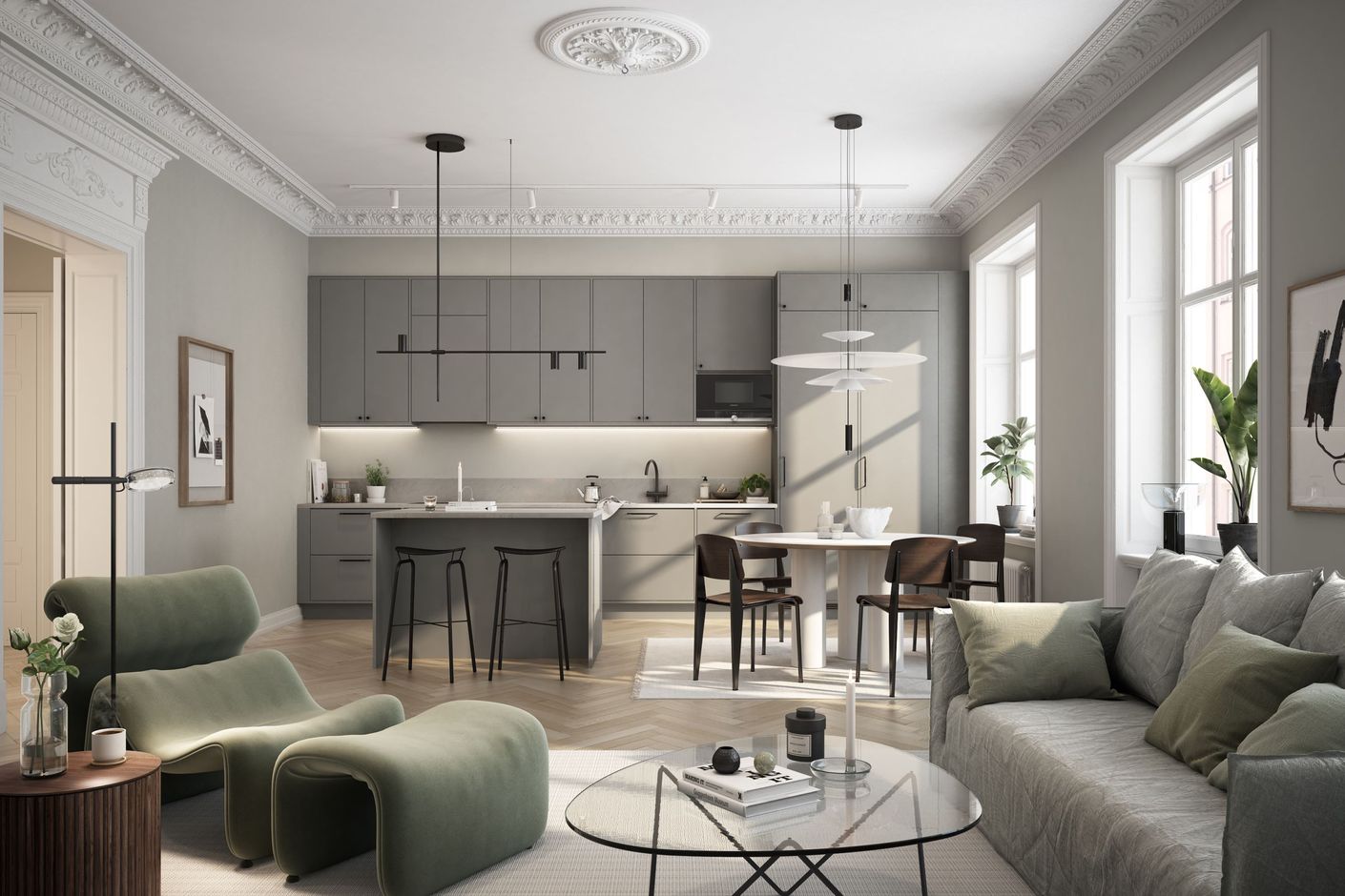 Optimerad disposition med stora sociala ytor och ytterst välplanerade sovrum. Hall med gott om plats för avhängning och förvaring. Kök med stilren köksö och komplett maskinell utrustning. Öppen, social planlösning mot det spatiösa vardagsrummet, vilket rymmer plats för såväl matbord som soffgrupp. Master bedroom är lugnt beläget mot föreningens innergård och har en stor garderobsvägg som underlättar förvaringen. Härifrån nås även den soliga balkongen med bästa västerläge. Lägenhetens andra sovrum vetter likaså mot gården och lämpar sig ypperligt som barnrum eller gästrum. Två fullstora badrum där det ena förutom WC och handfat har badkar och en tvättstugedel. Det andra badrummet har dusch, WC och handfat. I denna lägenhet har originaldetaljer så som stuckatur och pardörrar med överstycken i original lyckats bevarats, vilket ger en unik känsla och karaktär.