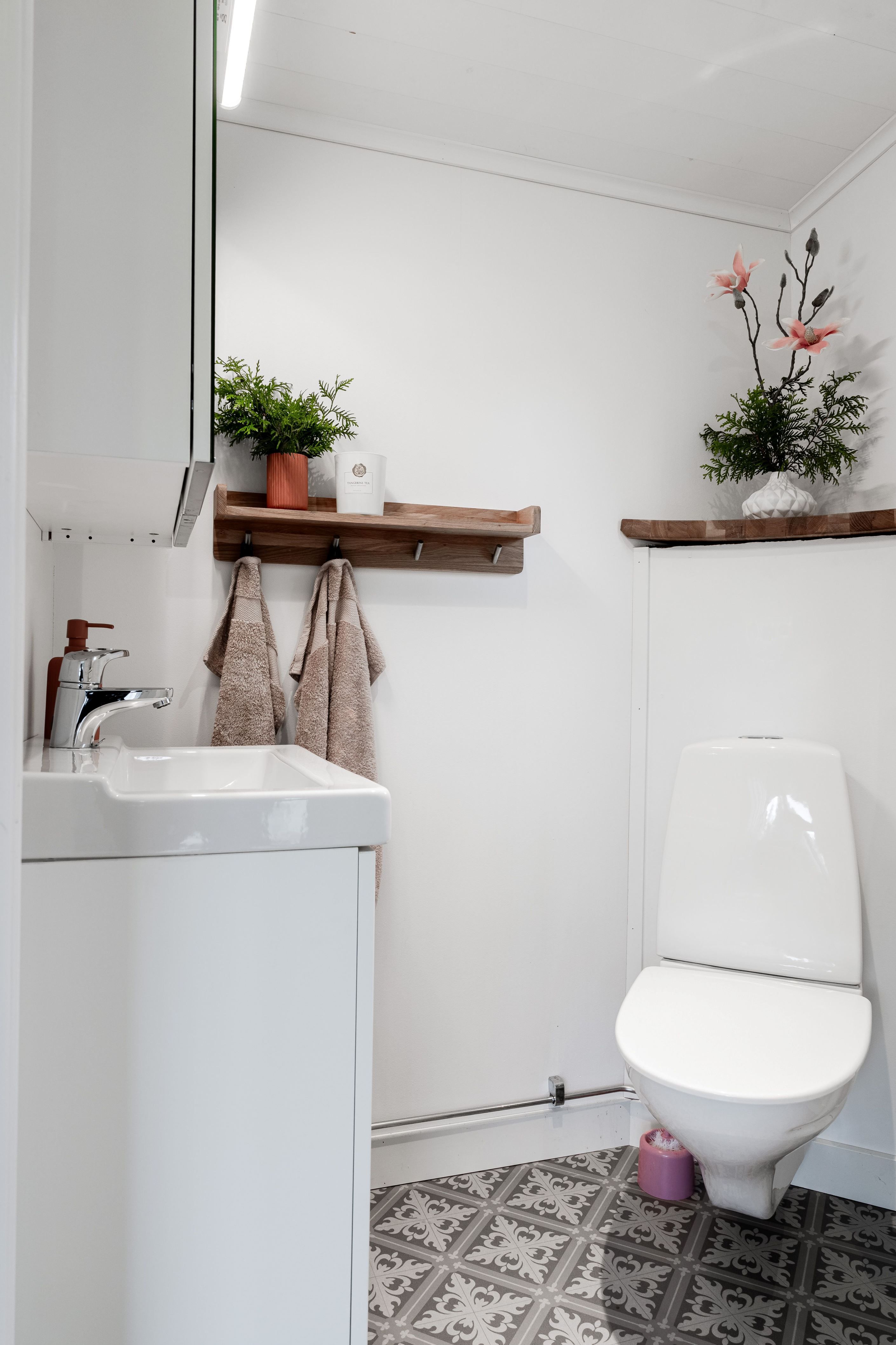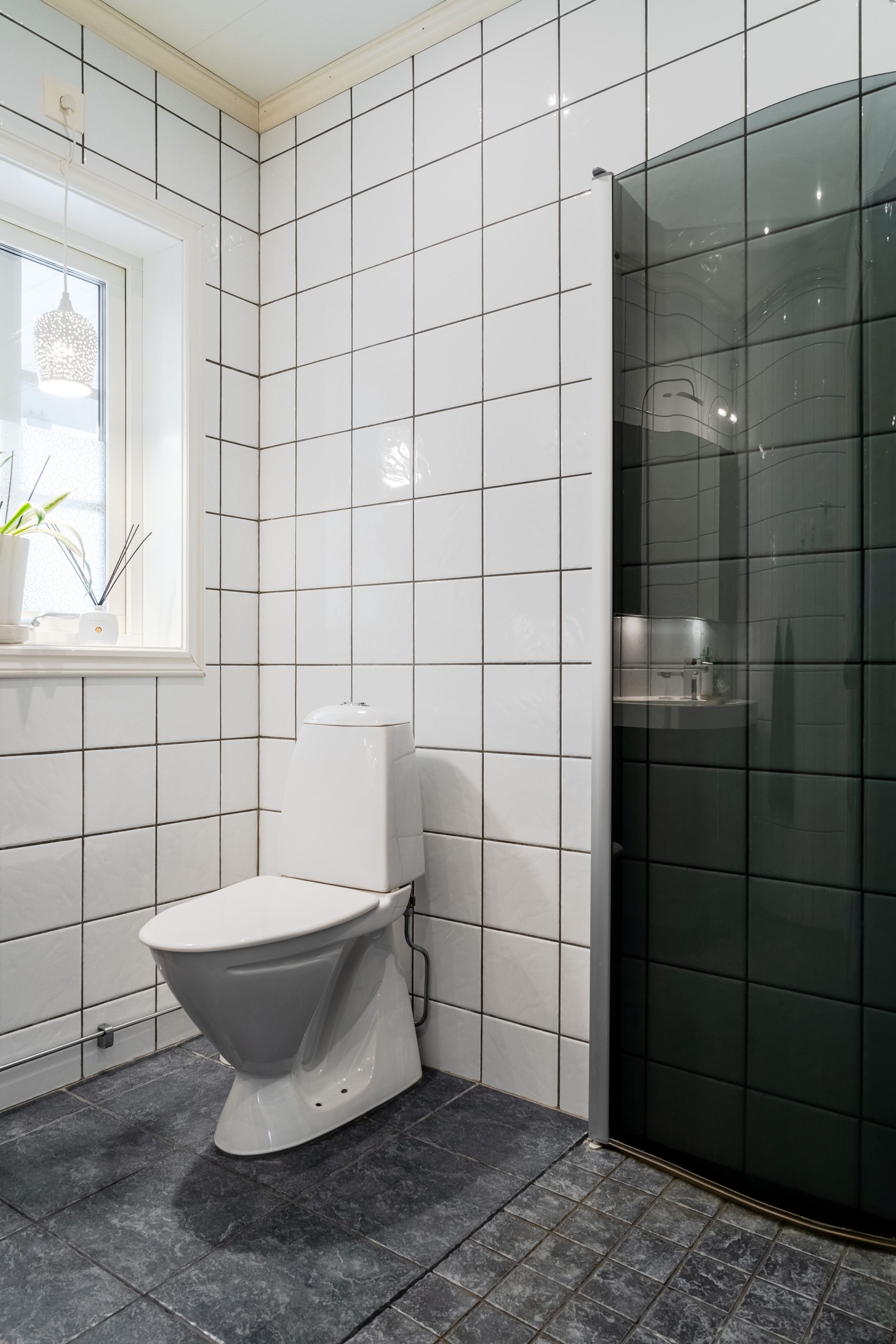 Utöver sovrummen så finner ni ännu rymligt badrum på detta plan. Badrummet är utrustad med stor kommod, dusch samt tvättmaskin och torktumlare.