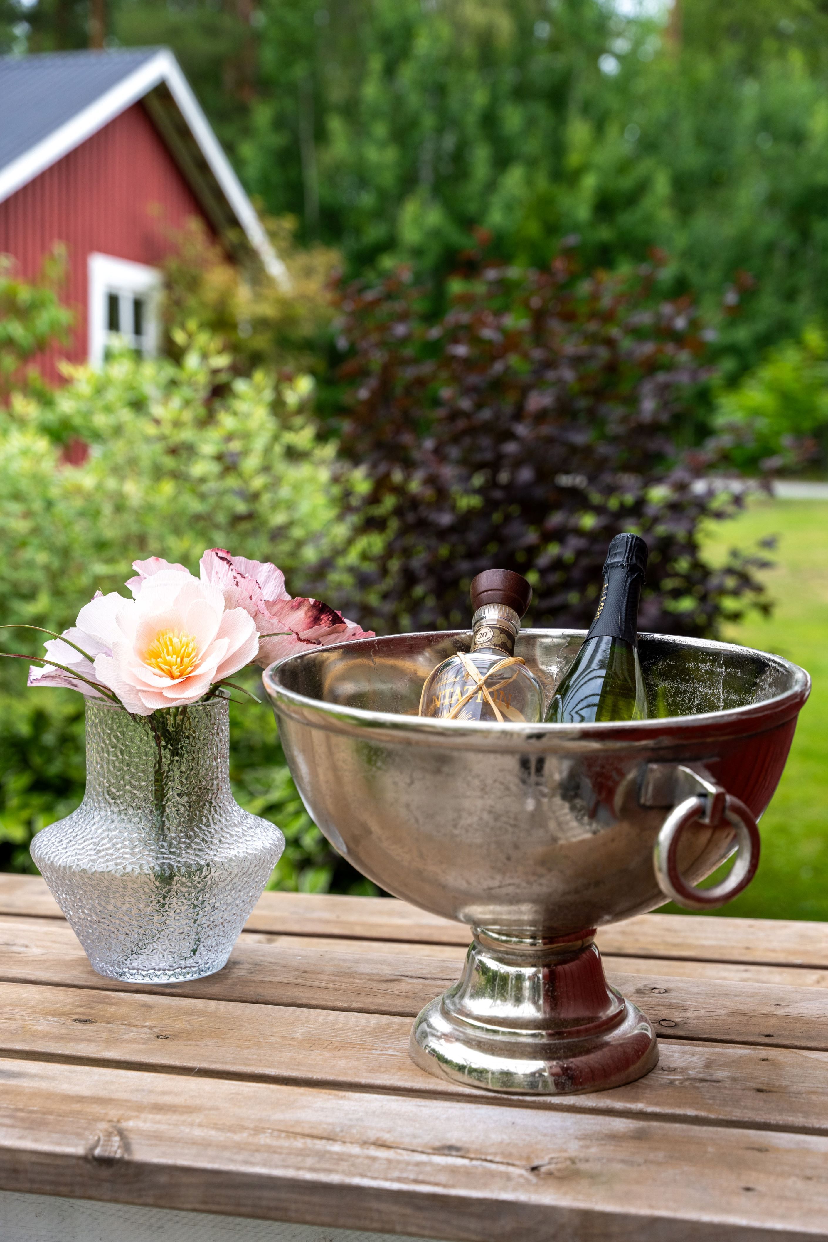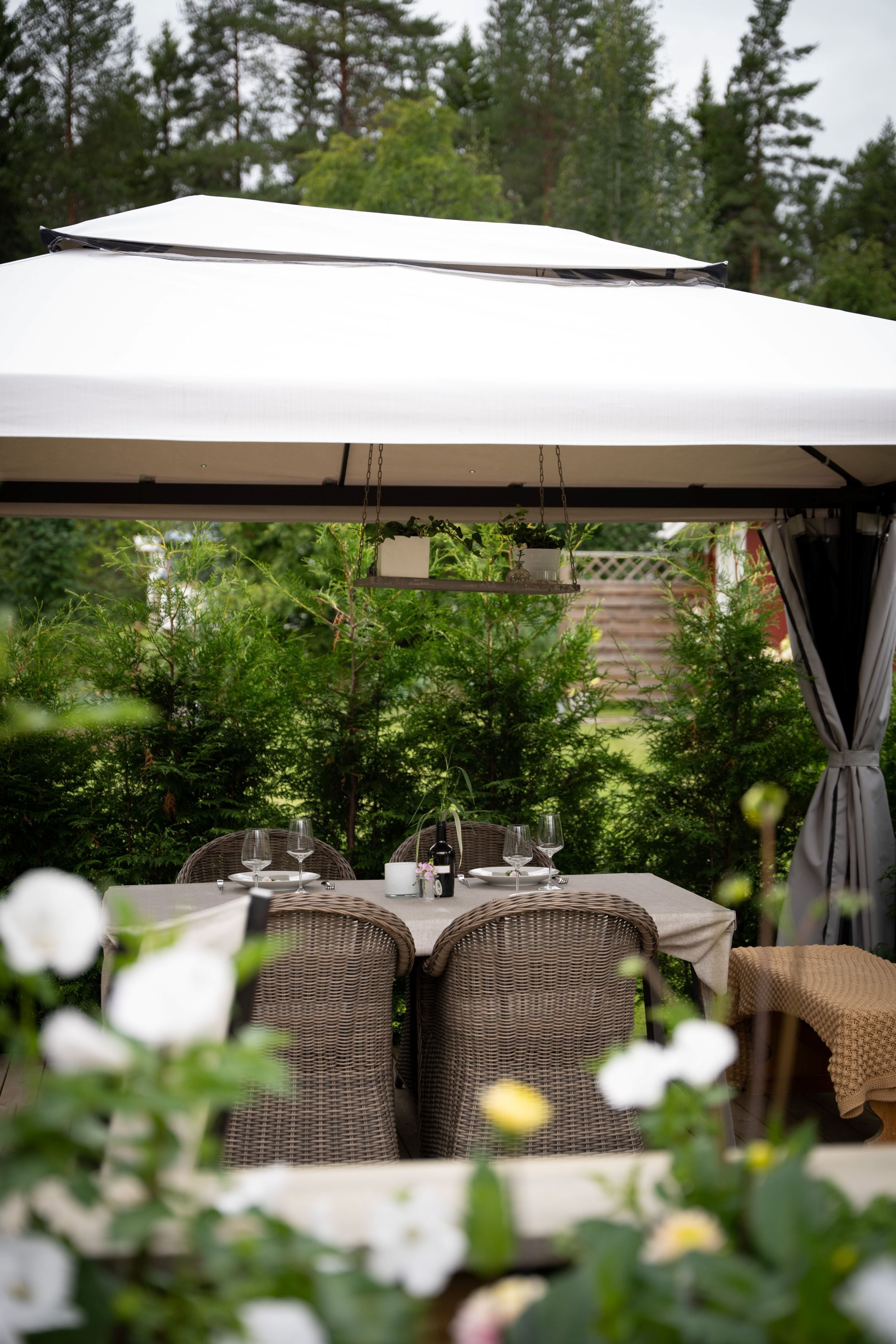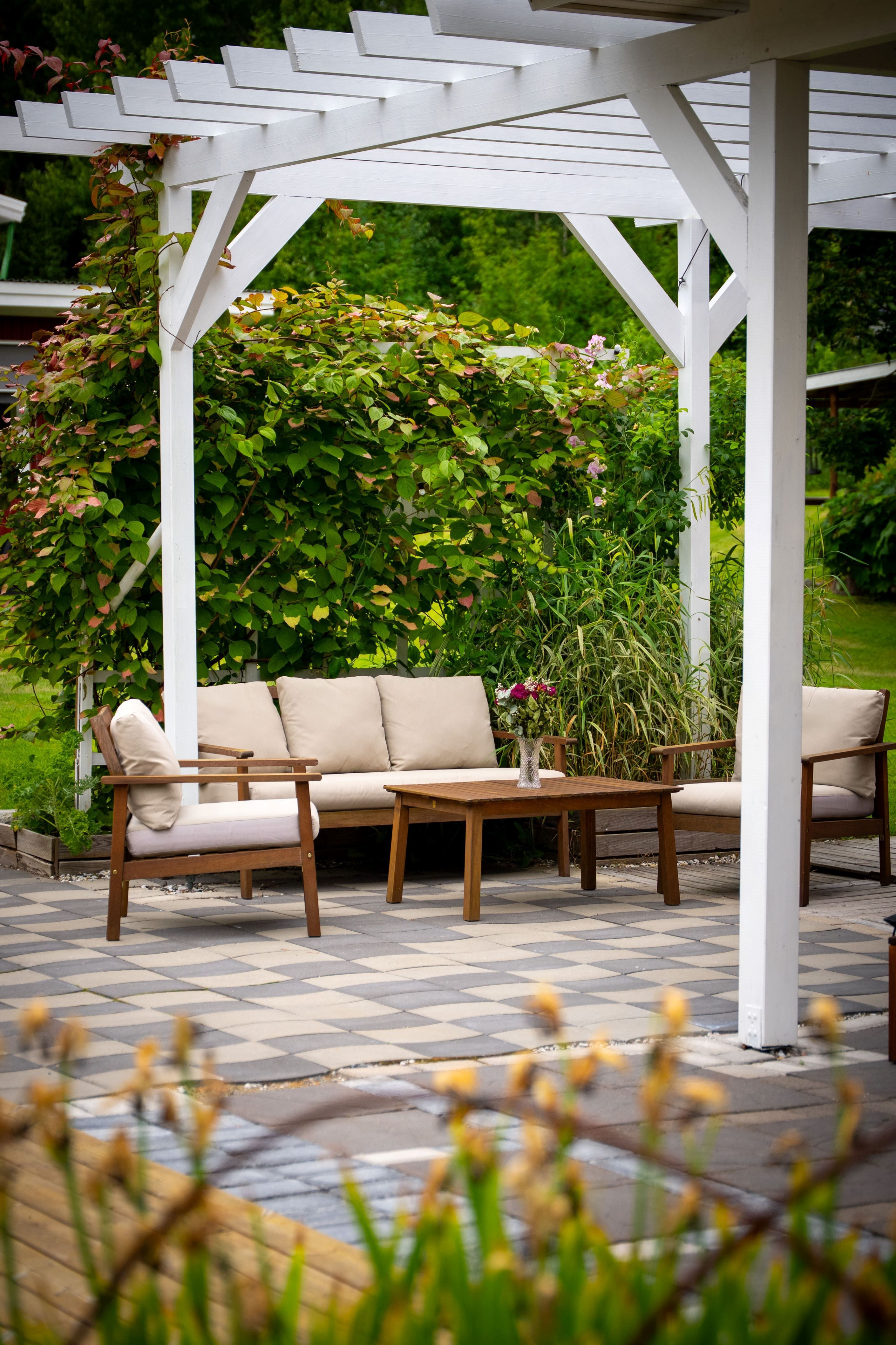 En stor stenlagd uteplats i både söder väst bjuder lika mycket in till fest som till lugna sommarkvällar!