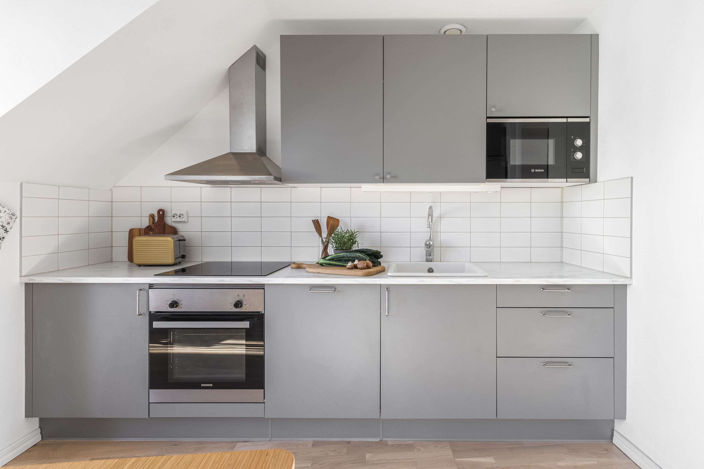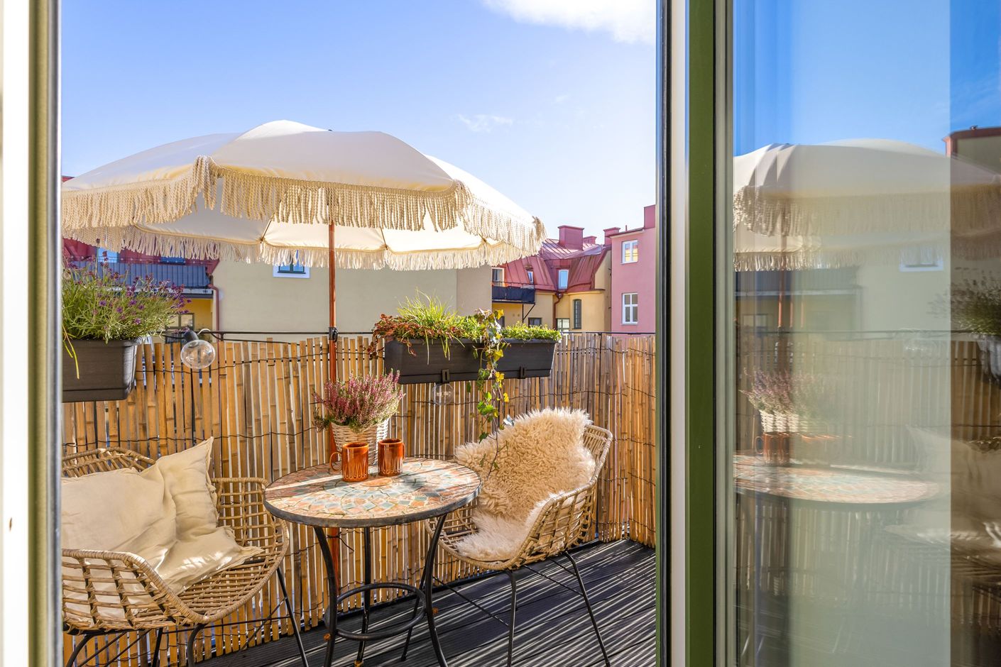 Balkongen i östligt läge bjuder på härlig morgonsol – perfekt för dagens första kaffe eller avkopplande stunder med utsikt över takåsarna. Det moderna köket imponerar med stilrena materialval och är fullutrustat med induktionshäll, ugn, diskmaskin samt kombinerad kyl/frys – perfekt för både vardagsliv och sociala middagar. Det helkaklade WC-/duschrummet håller hög standard och är utrustat med kombinerad tvättmaskin och torktumlare. Hela lägenheten genomgick en omfattande renovering 2021 och är redo att flytta in i direkt.