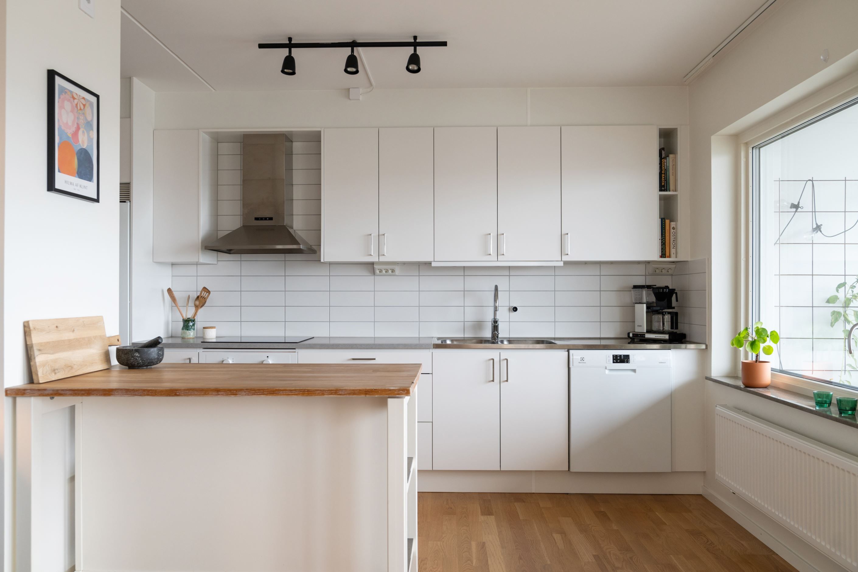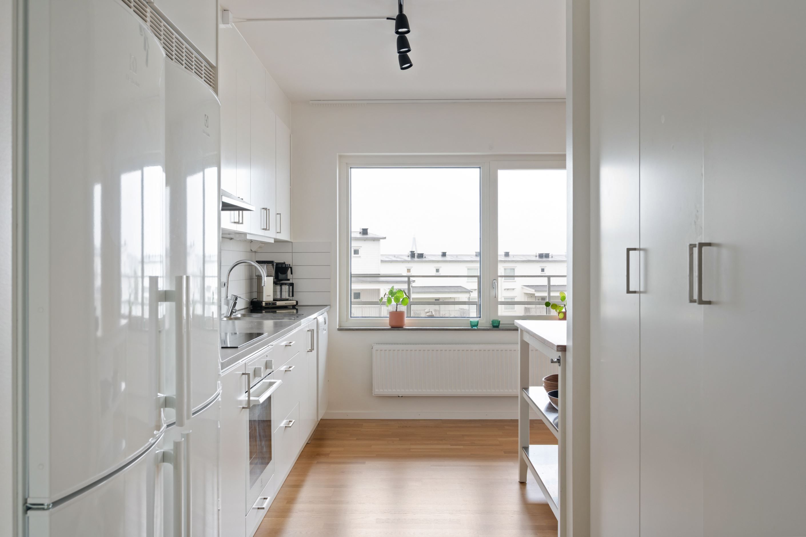 Köket är stilrent och praktiskt utformat med släta luckor i en mjuk ton, moderna vitvaror och gott om arbetsyta för både vardagens matlagning och sociala middagsstunder. Den öppna planlösningen binder samman till vardagsrummet, en naturlig samlingsplats för familj och vänner. Här når du balkongen med plats för middagsbord, soffgrupp och odling – ett extra rum som fungerar lika bra för morgonkaffet som för avkopplande kvällar.