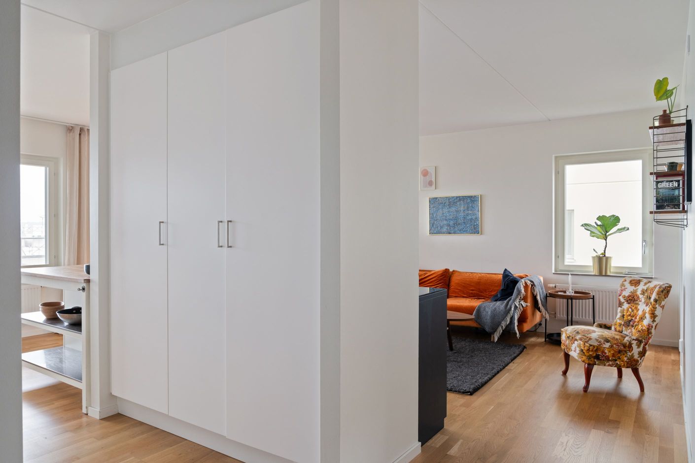 Bostaden rymmer två rofyllda sovrum med bra förvaringsmöjligheter, där det större har stora garderober. Vidare finns ett helkaklat badrum med både tvättmaskin och torktumlare samt en välkomnande entré med rymlig klädkammare. Ljusa väggar och parkettgolv skapar en behaglig bas som förstärker hemmets harmoniska karaktär.