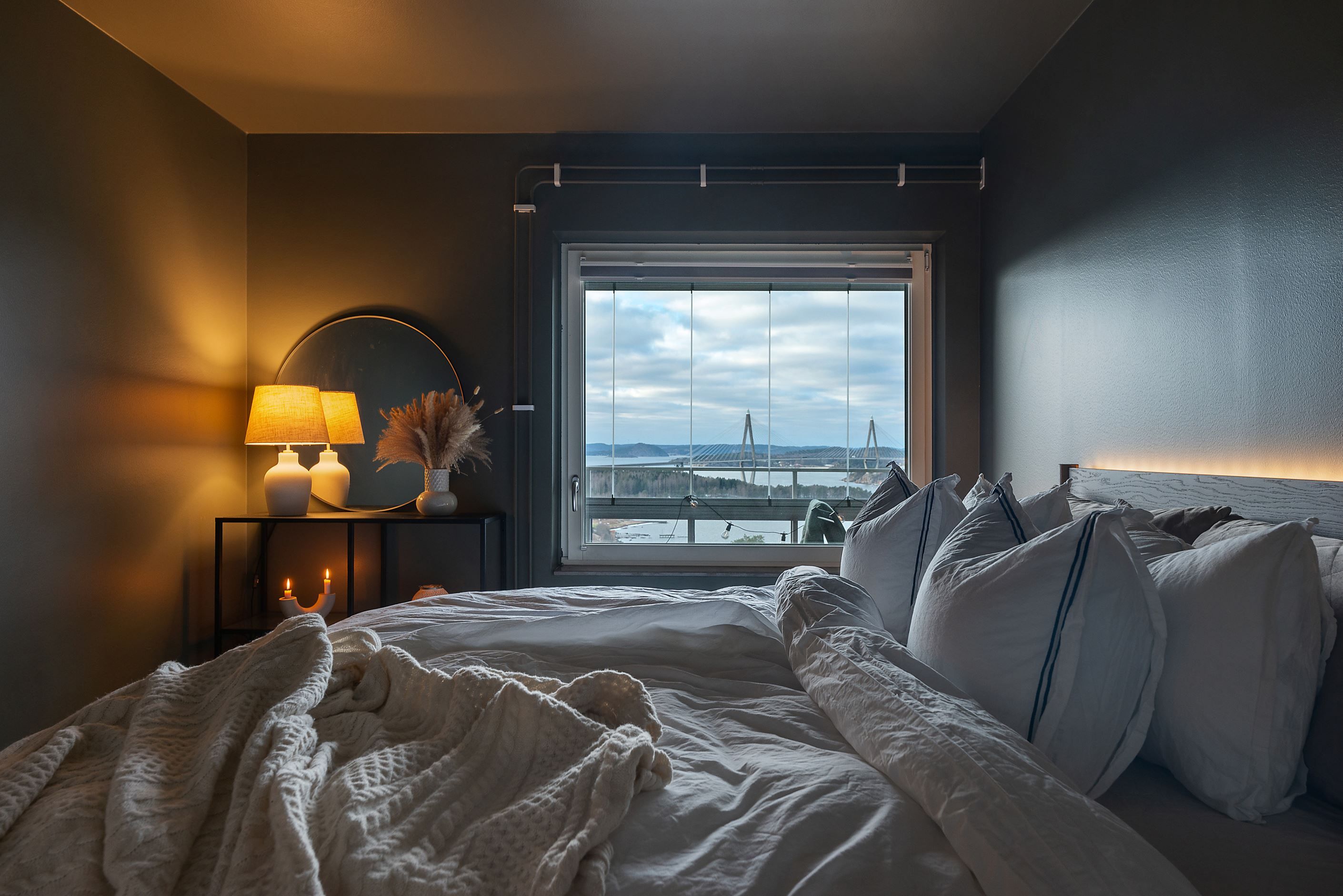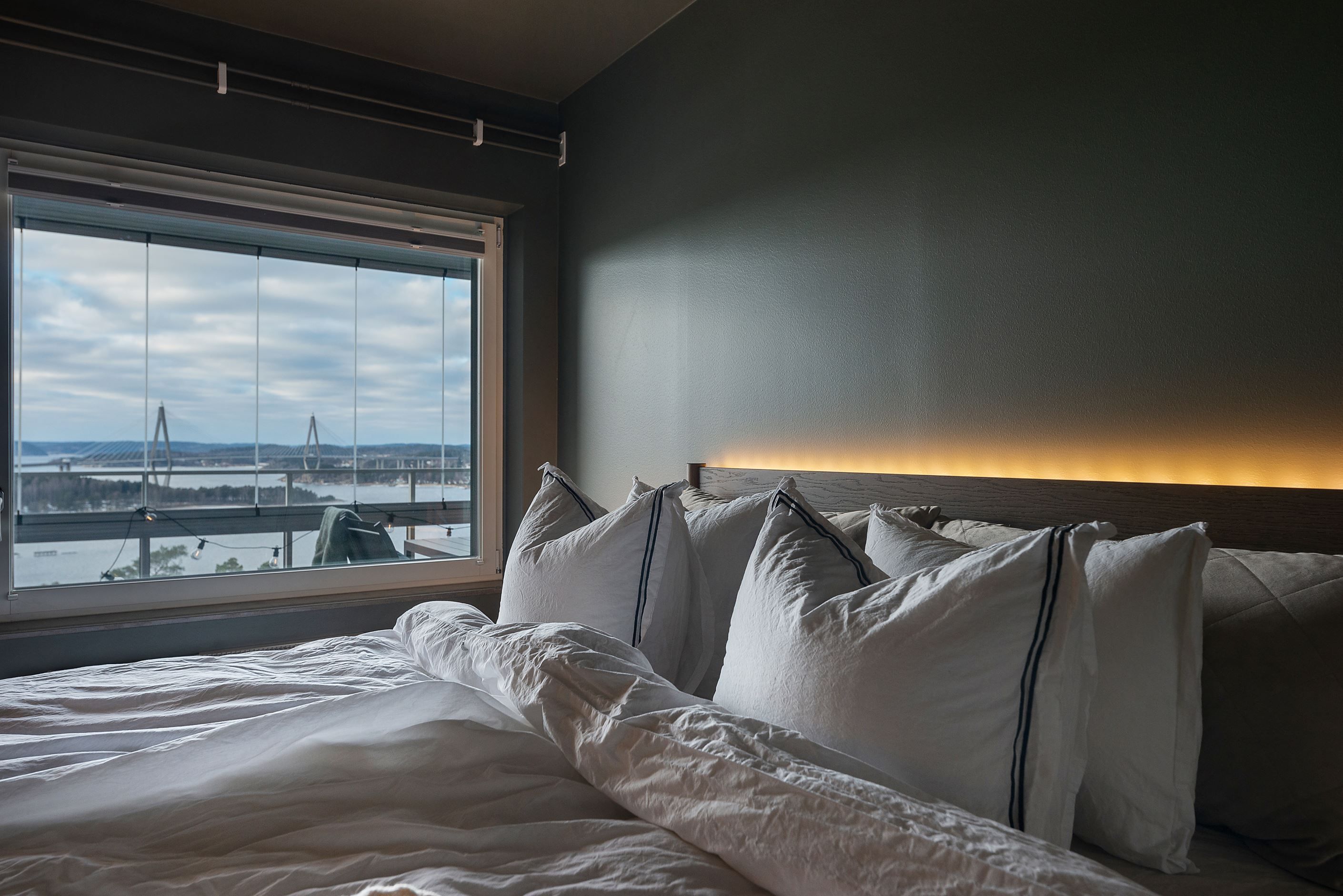 Sovrummet är ännu en pärla i den här otroliga bostadsrätten. De nymålade väggarna i dovt grön ton med inmålat tak i samma gröna färg ger en avslappnande känsla. Som pricken över i, bjuder sovrumsfönstret på en svårslagen utsikt.