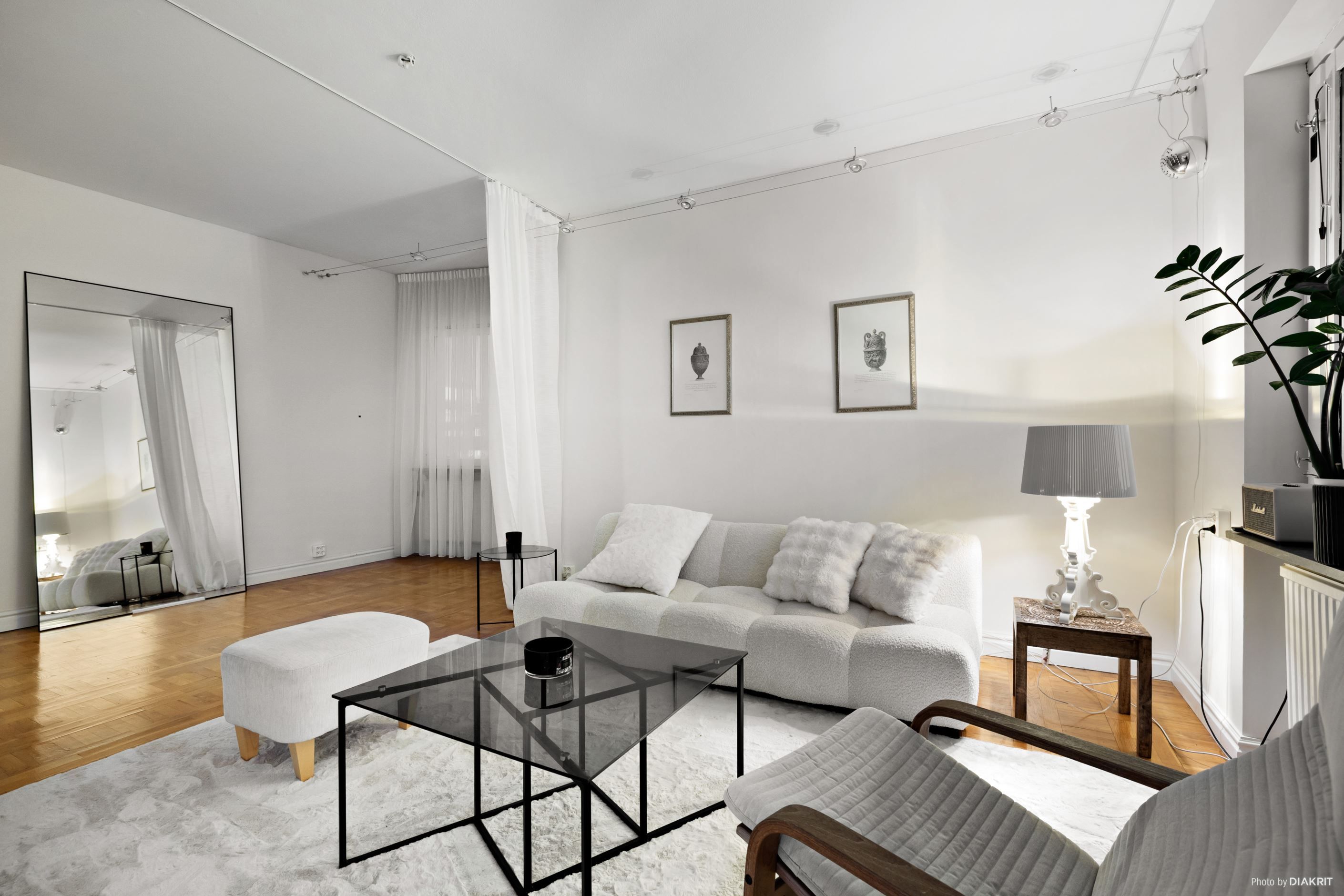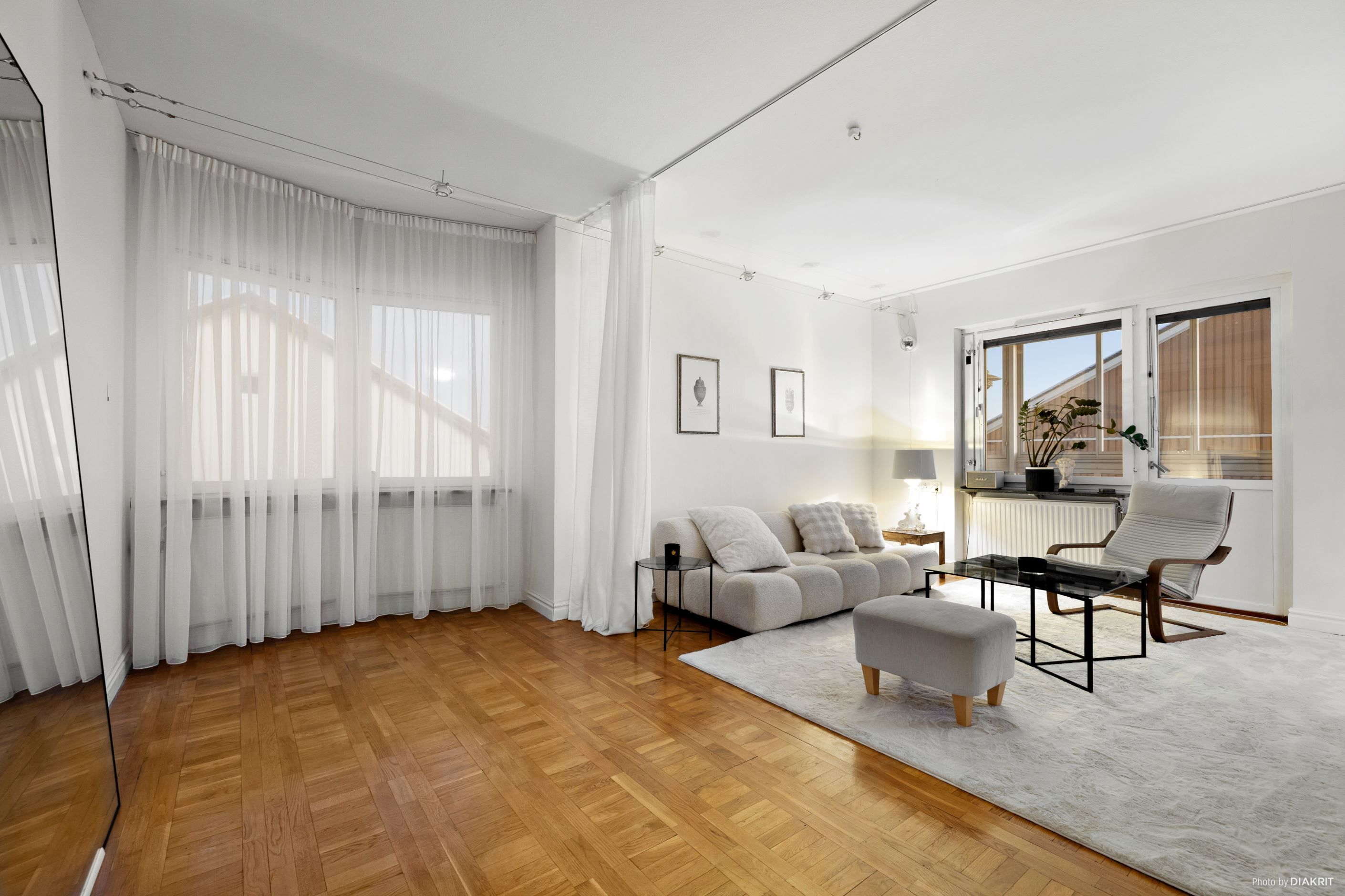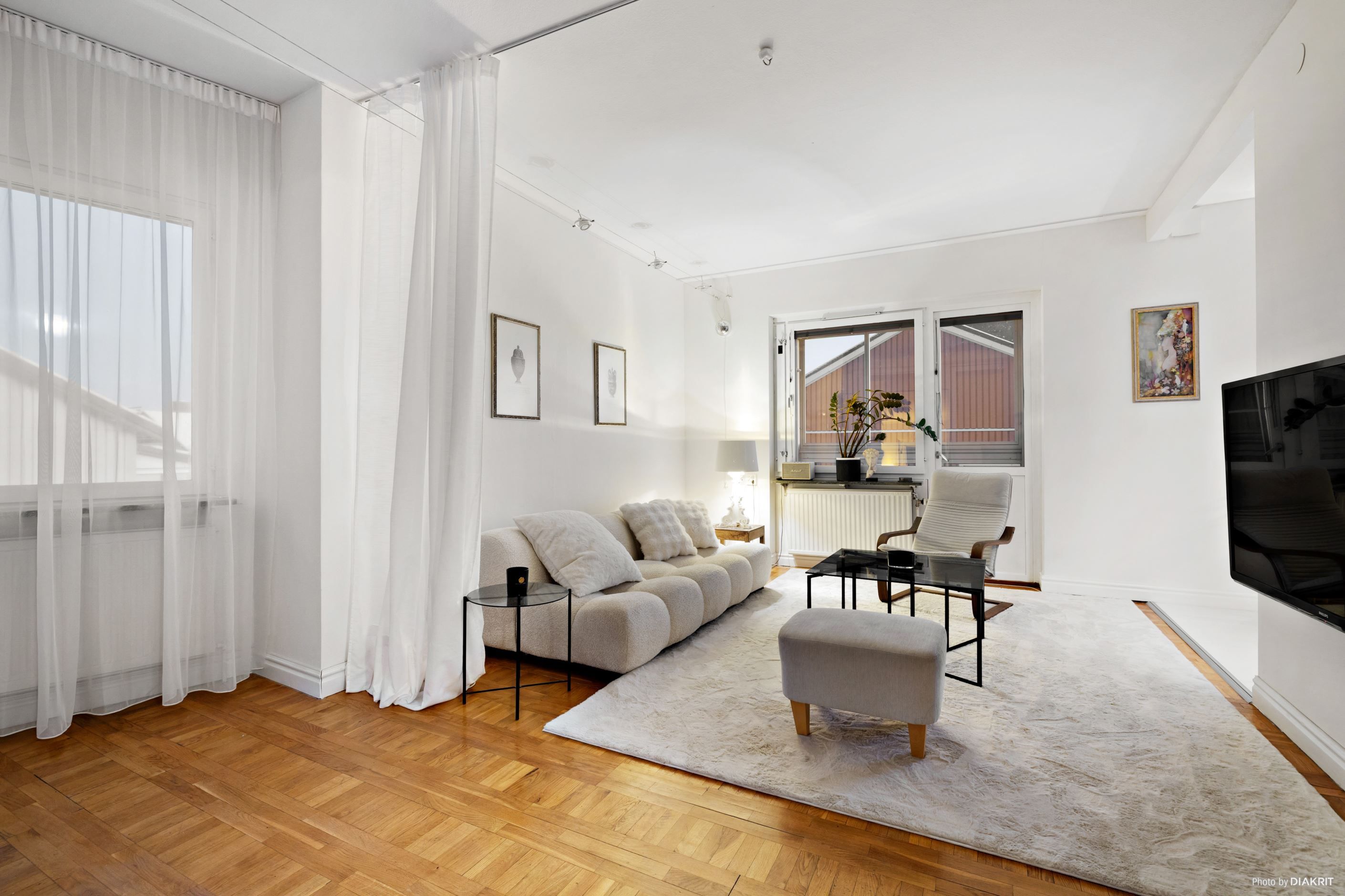Lägenheten bjuder på genomgående ljusa och moderna ytskikt med bevarad originalparkett. Det trivsamma köket har gott om förvaring och arbetsyta, och ligger i anslutning till det rymliga vardagsrummet, som har utgång till balkongen – perfekt för avkoppling eller sociala stunder.