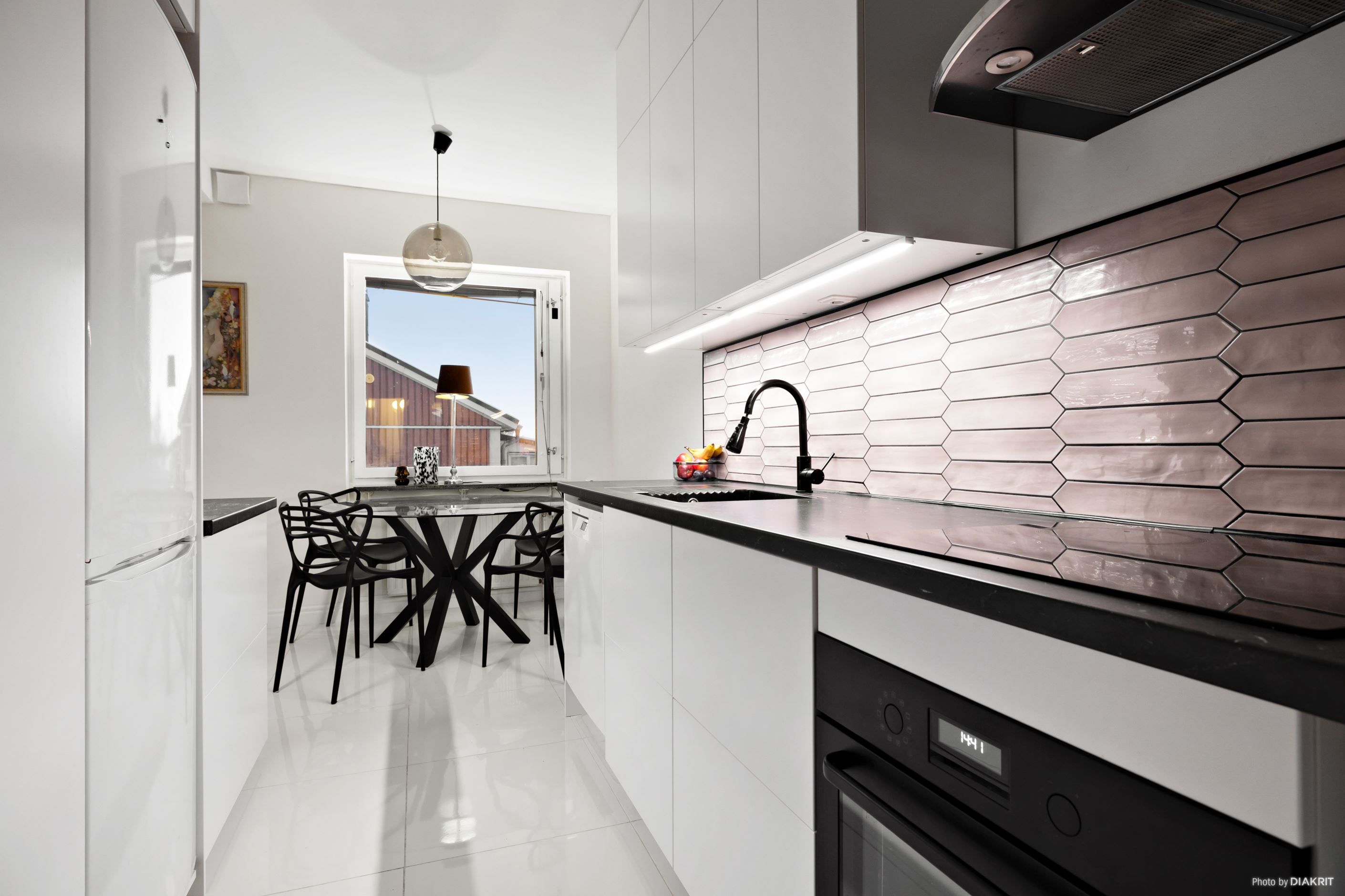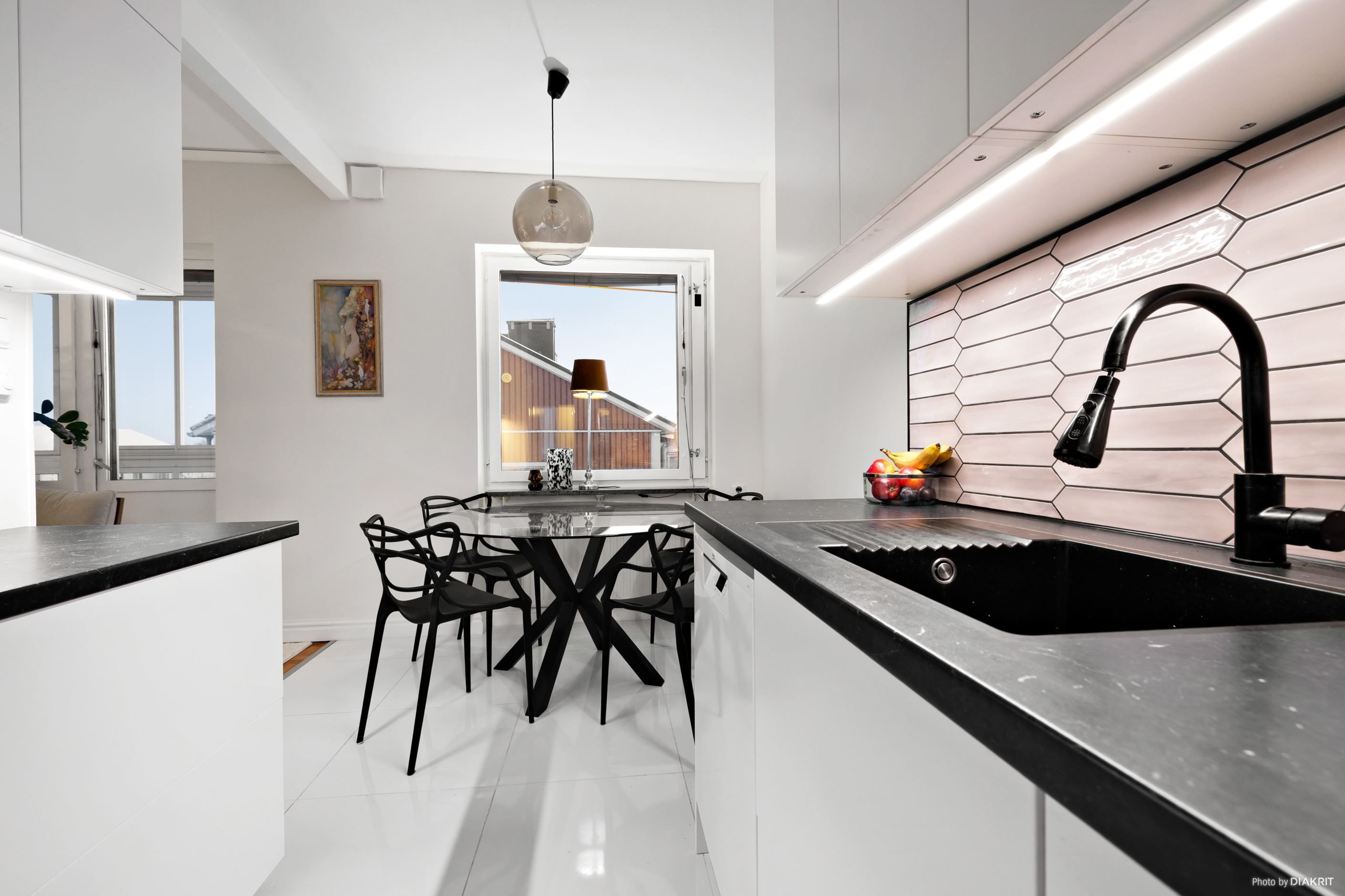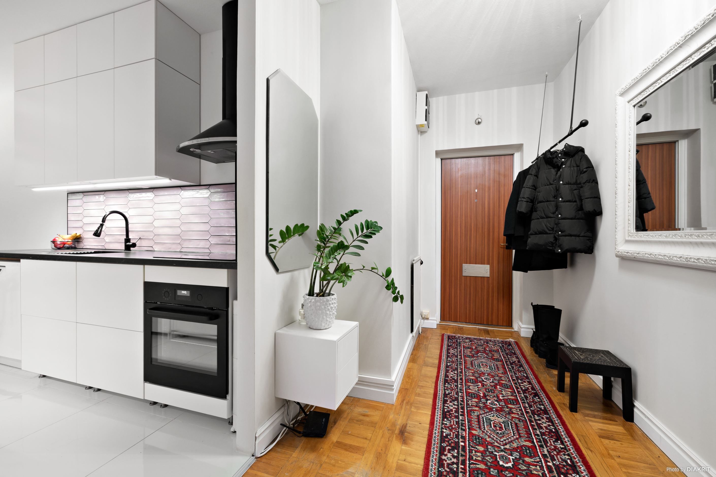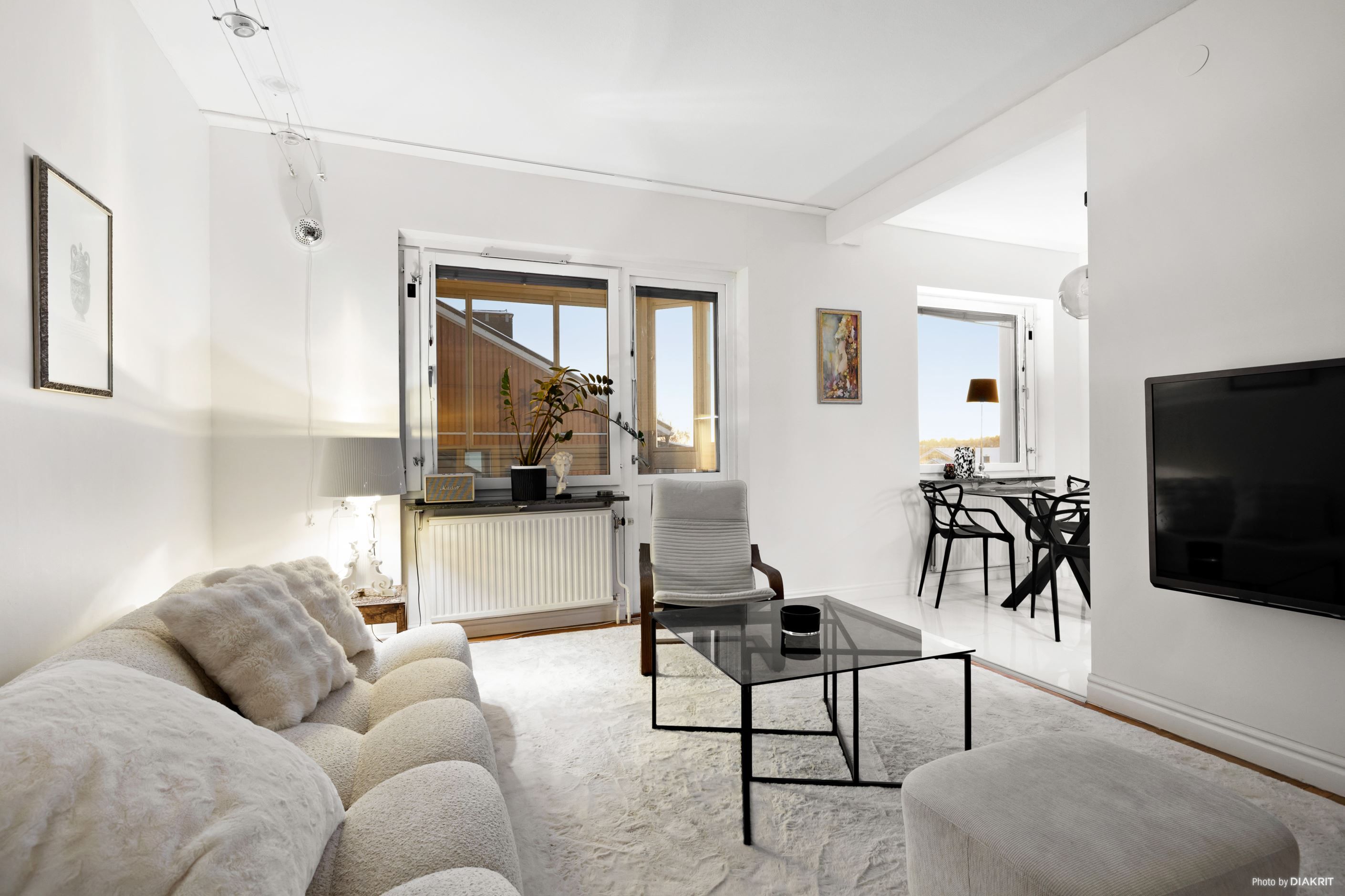 Lägenheten bjuder på genomgående ljusa och moderna ytskikt med bevarad originalparkett. Det trivsamma köket har gott om förvaring och arbetsyta, och ligger i anslutning till det rymliga vardagsrummet, som har utgång till balkongen – perfekt för avkoppling eller sociala stunder.