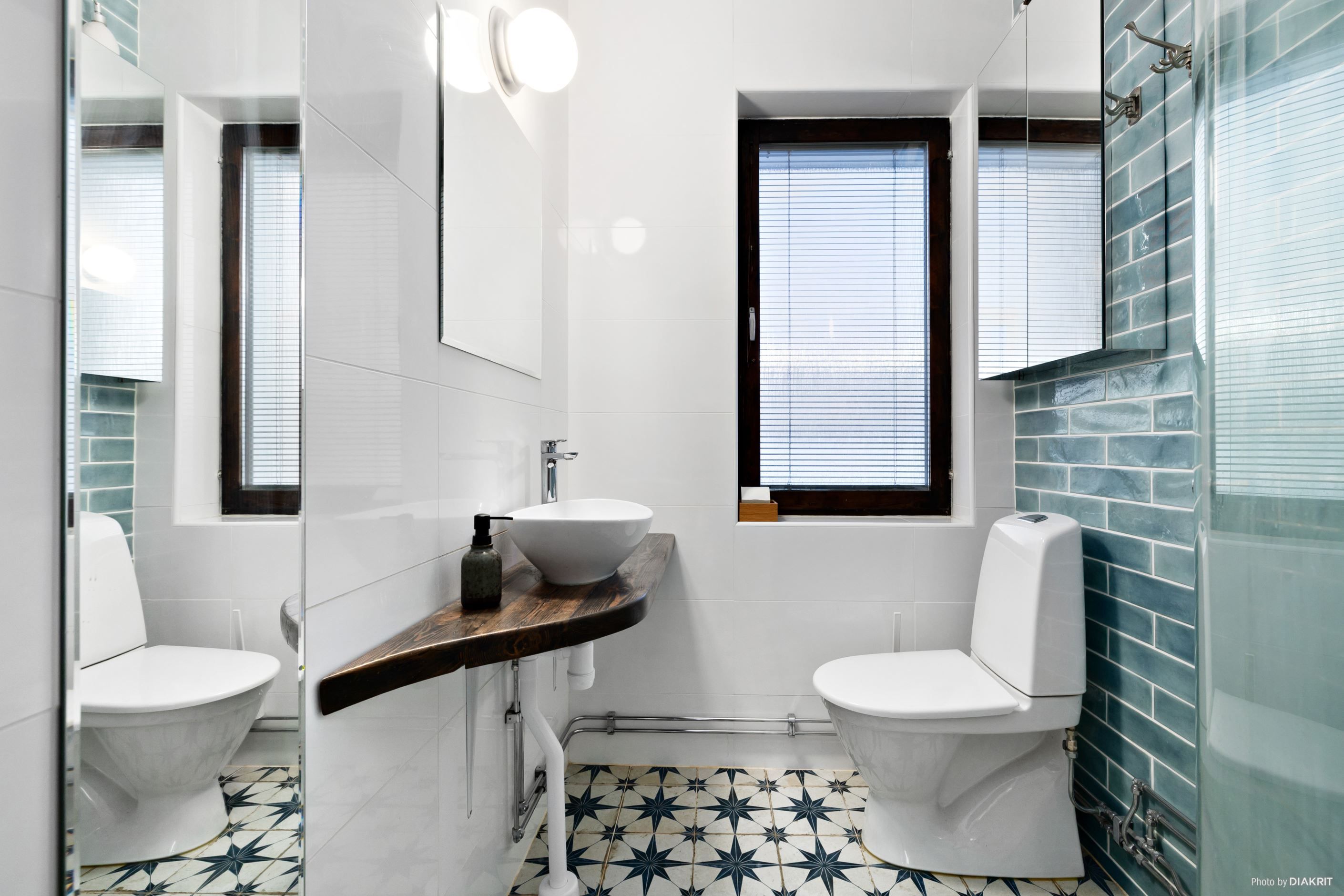 Badrummet är fint renoverat och har kakel, klinker och golvvärme samt snygg inredning.