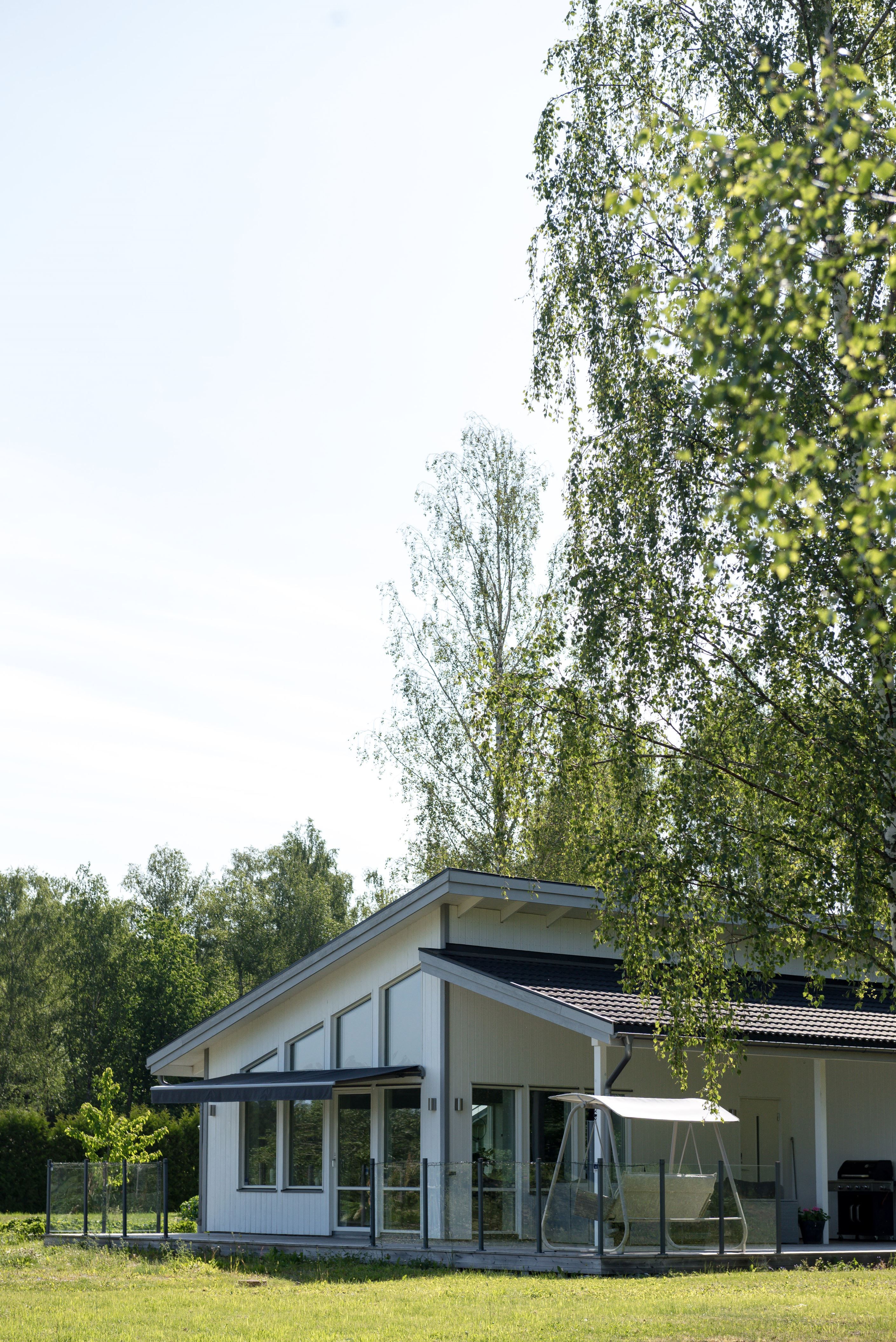 Ute väntar en generös altan med sol från morgon till kväll – en självklar plats för sommarluncher, grillkvällar eller bara lugna stunder med vy över den plana, lättskötta tomten.