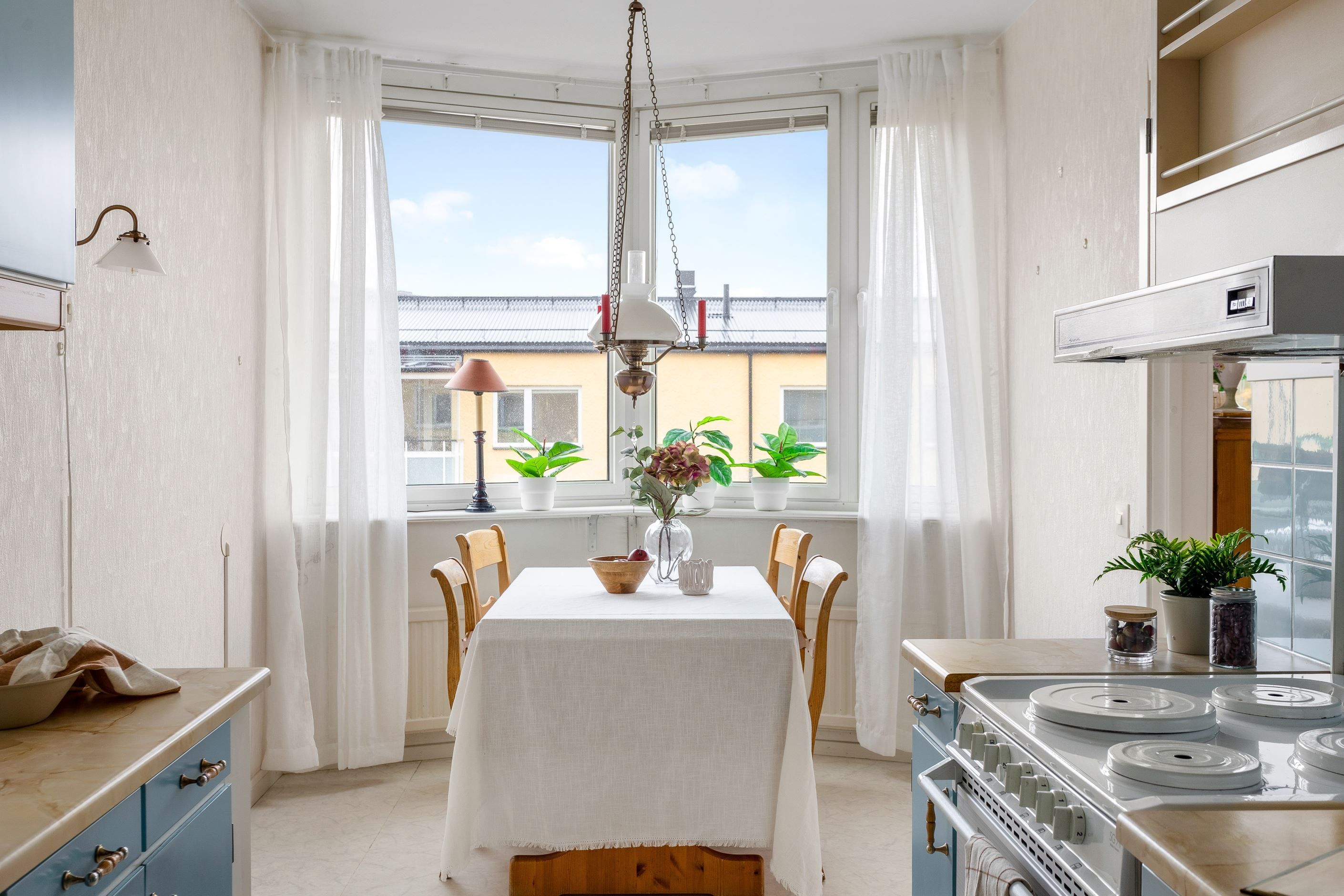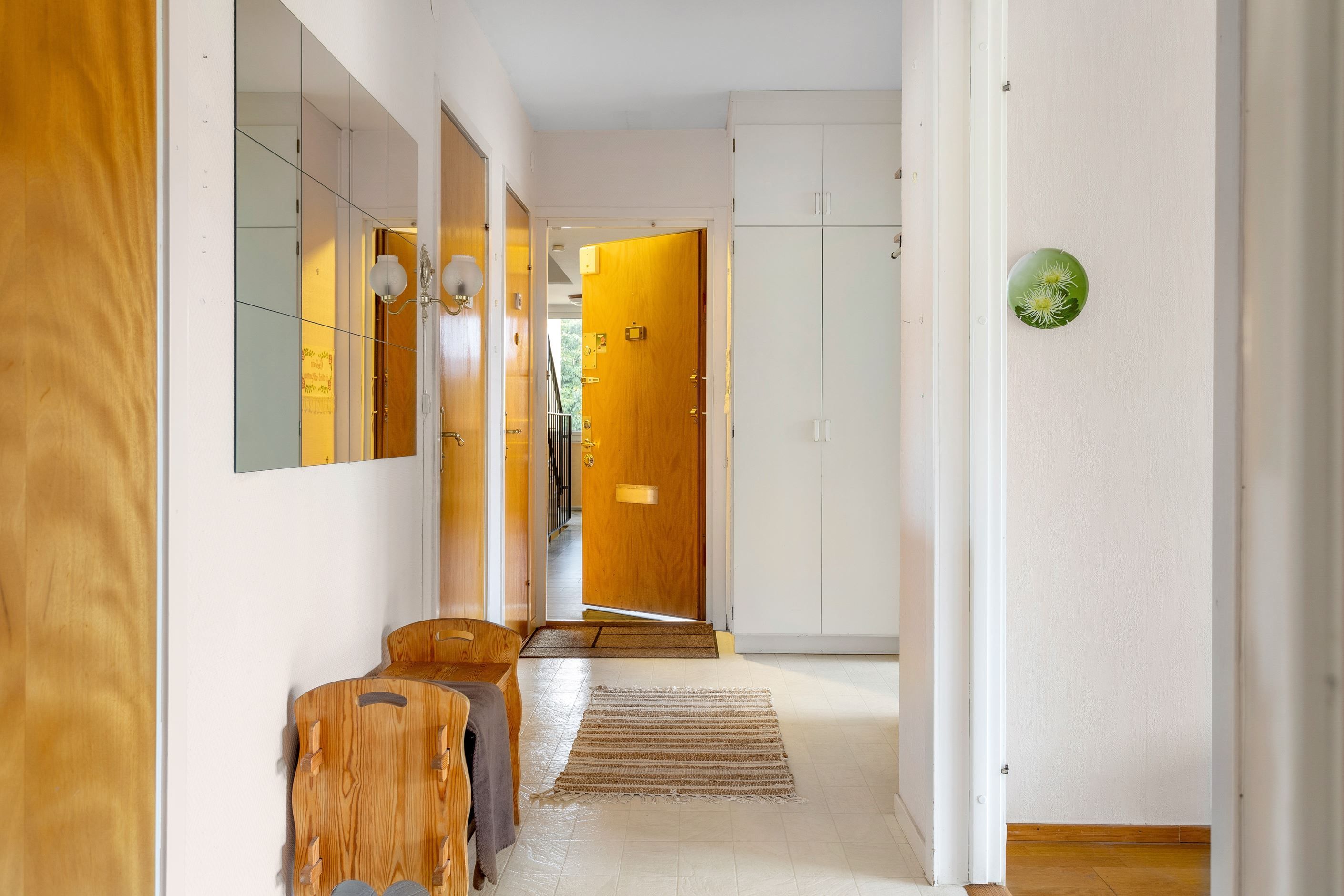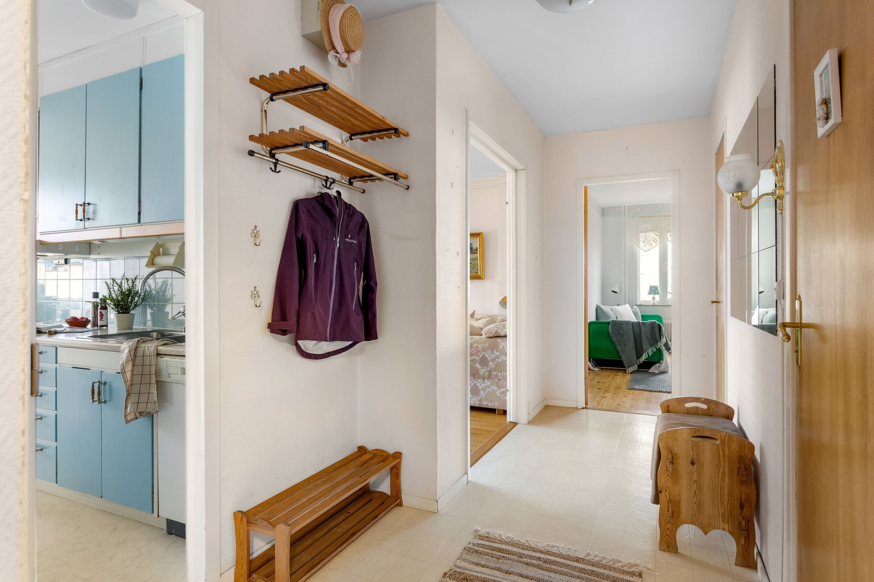 När ni tar första klivet in genom entrédörren välkomnas ni av den inbjudande hallen som vägleder er in till samtliga rum i bostaden. Intill hallen finner ni både ett stambytt wc/badrum och gäst-wc. I anslutning till hallen finner ni ett hemtrevligt och ljust kök med härligt burspråk som ger en ombonad känsla. I köket finns det matplats för ca 4–6 personer.