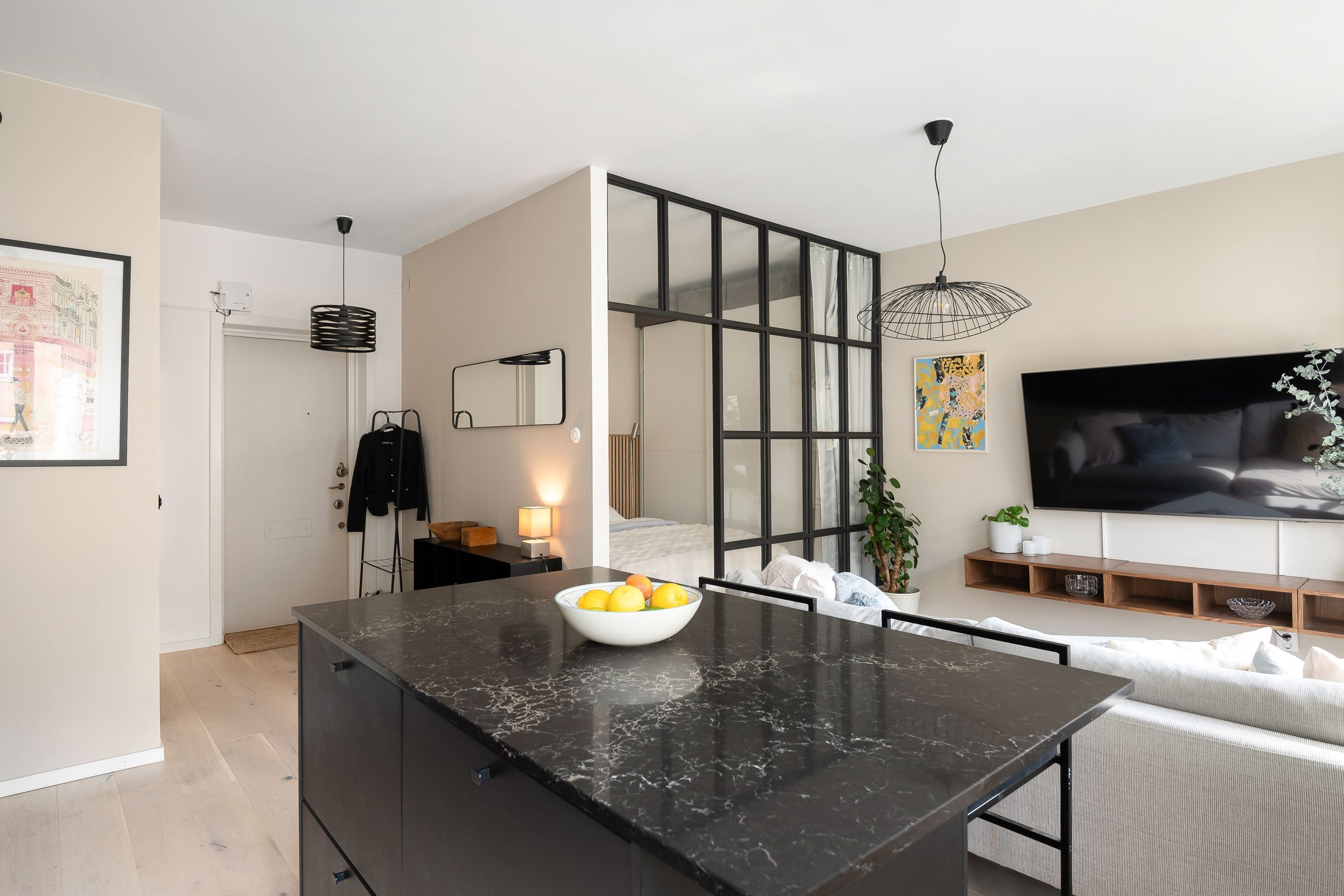 Vardagsrummet är rymligt och lättmöblerat, perfekt för både lugna hemmakvällar och sociala stunder. Intill hittar du den mysiga sovalkoven, stilfullt avskärmad med en elegant industriglasvägg som både ger rummet karaktär och släpper in ljus. Här ryms en dubbelsäng och bra förvaring utan att det känns trångt.