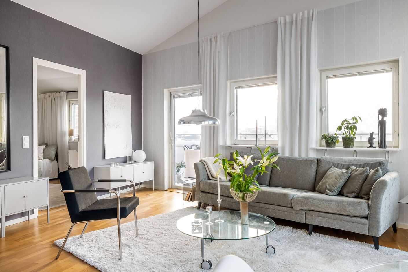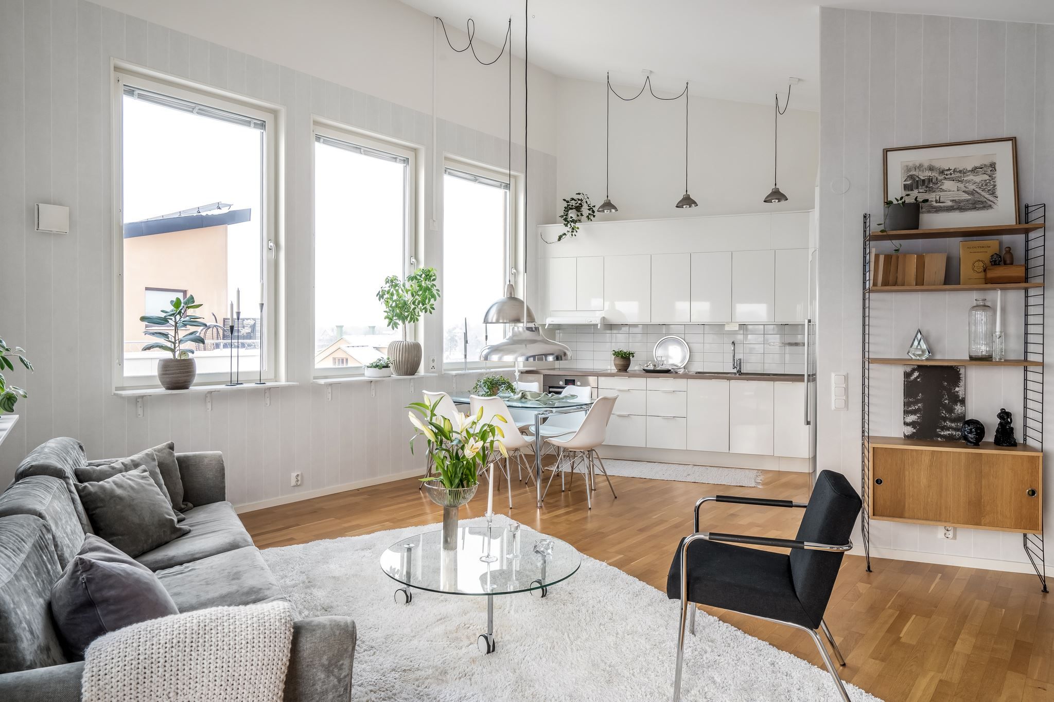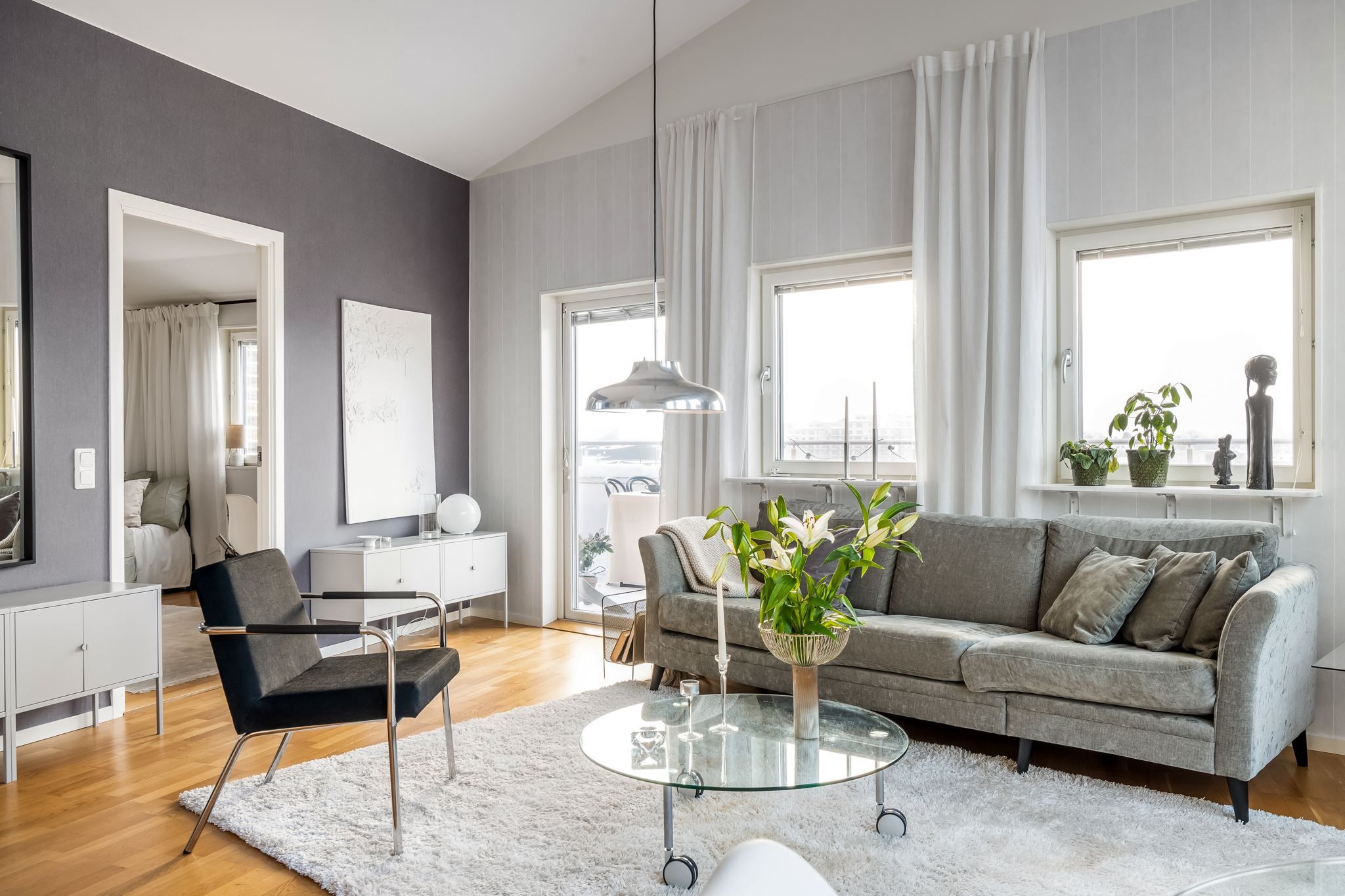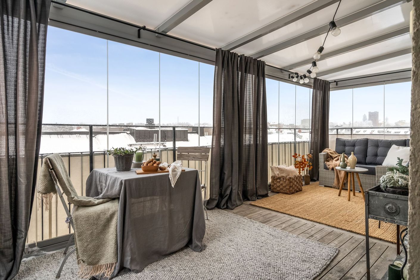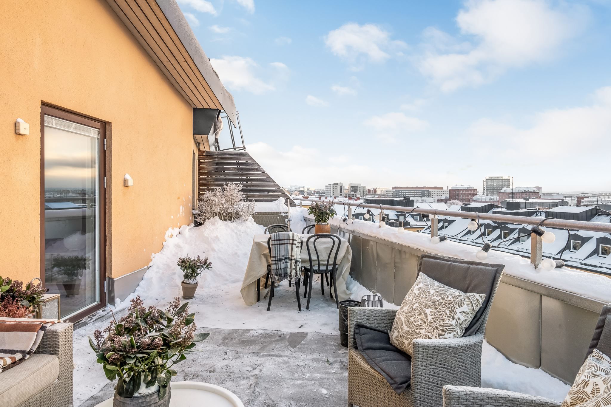 Med fönster i tre väderstreck och med två större takterrasser är det här en bostad utöver det vanliga med generösa sociala ytor för alla tillfällen.