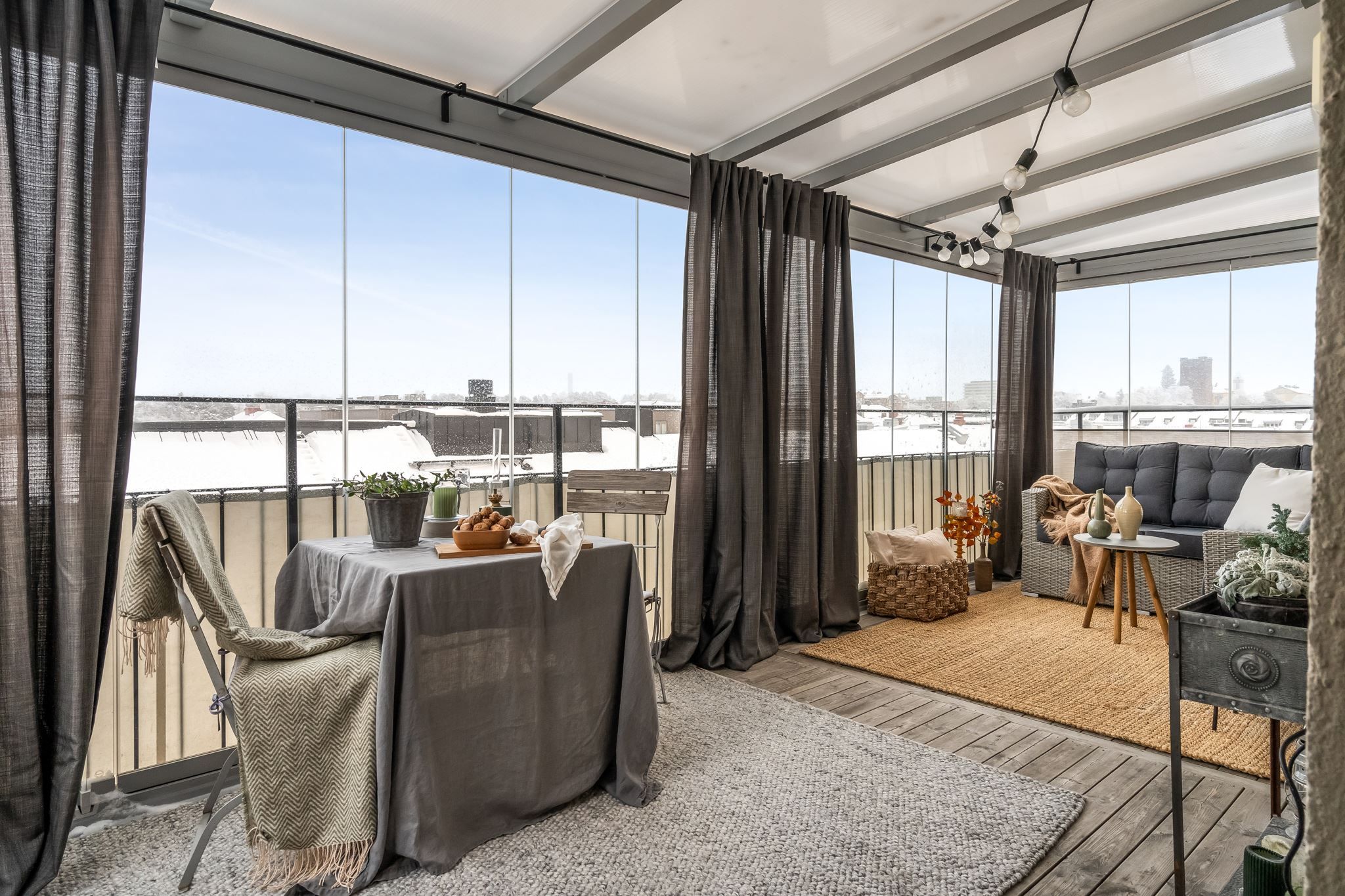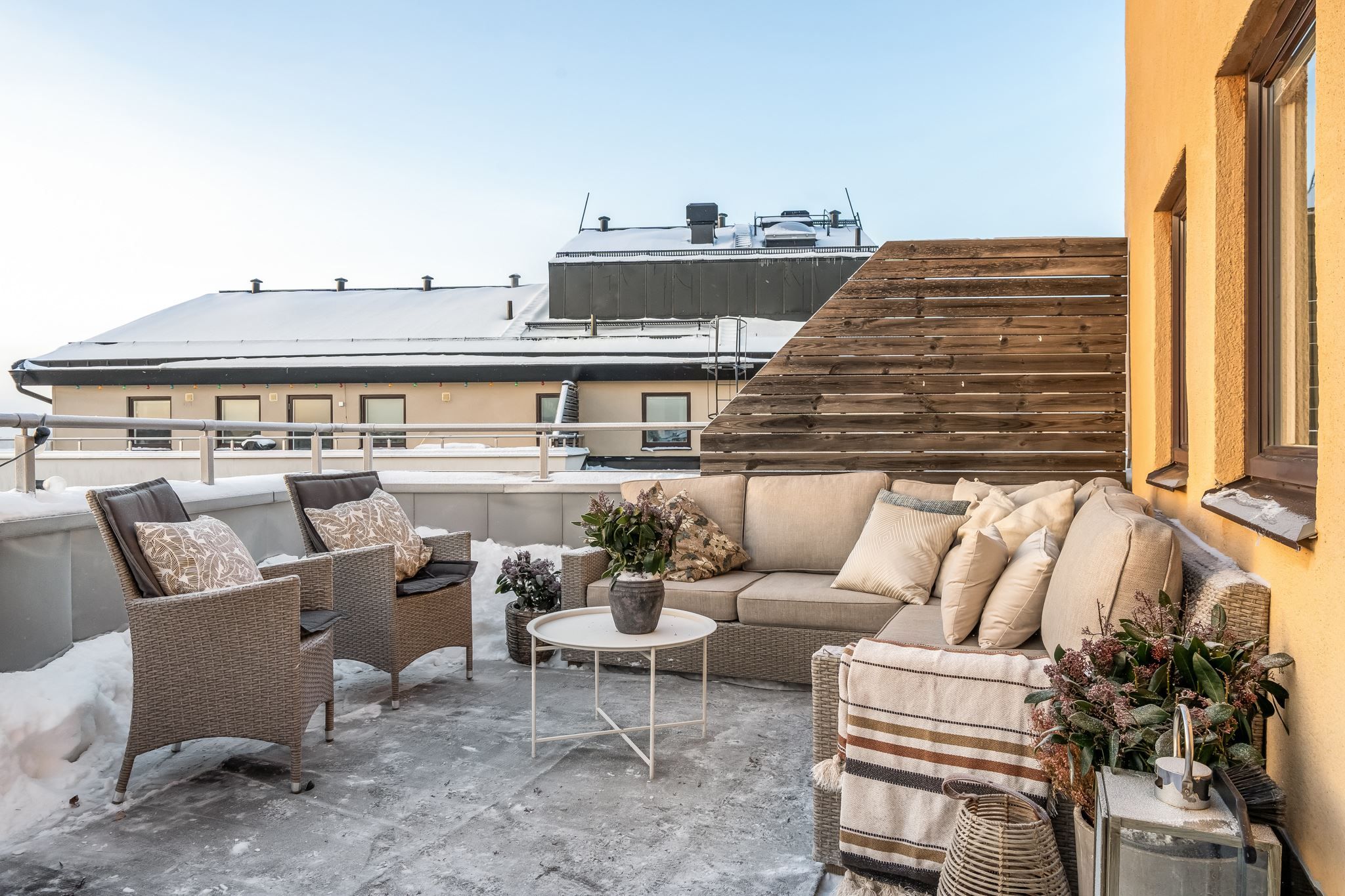 Denna terrass är på 15 kvm och upplevs mer som ett uterum, kan utnyttjas större delen av året med tillsats av liten värmekälla. Här sitter man helt utan insyn och det finns gott om plats för både sittgrupper och växter.