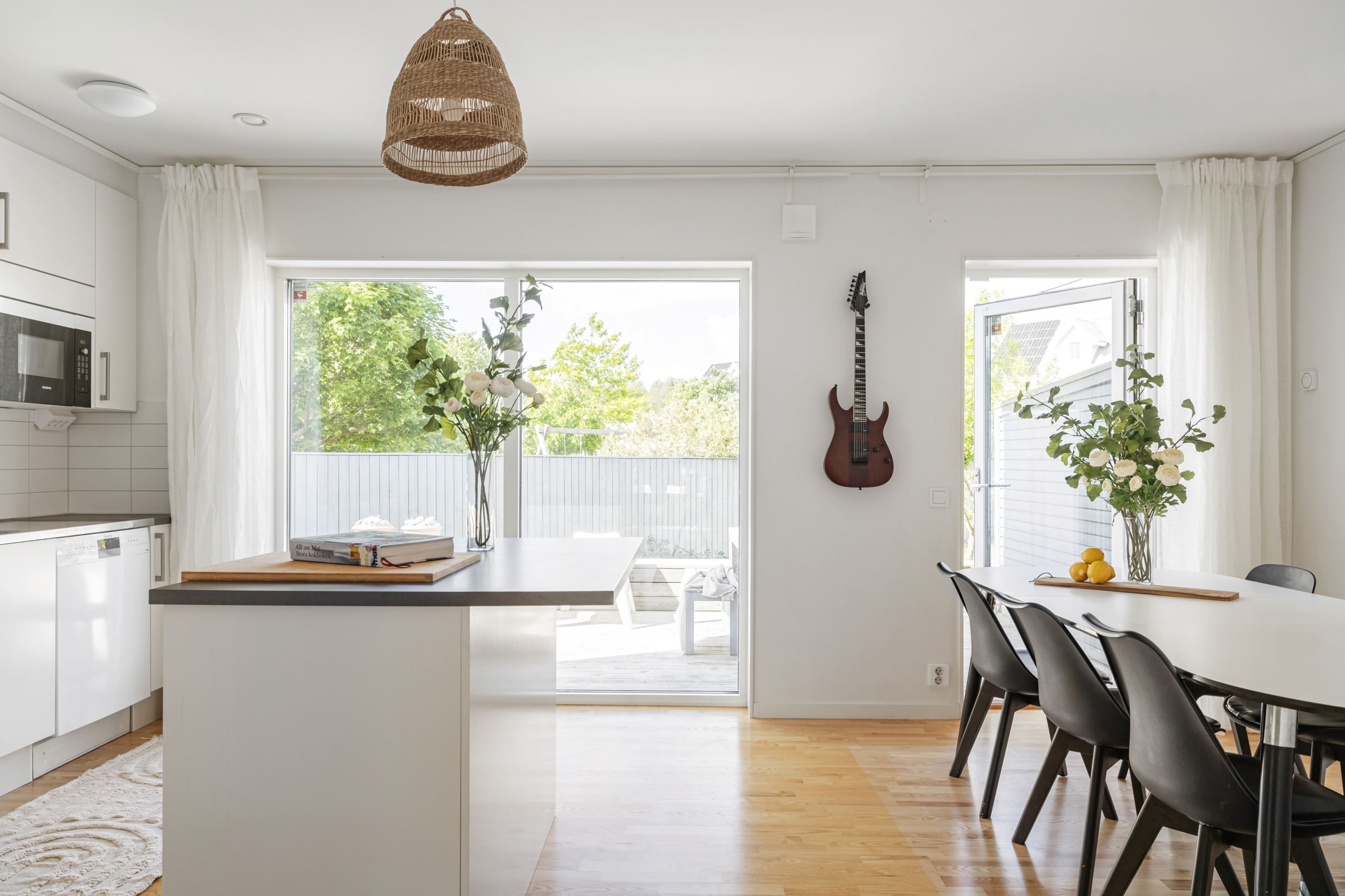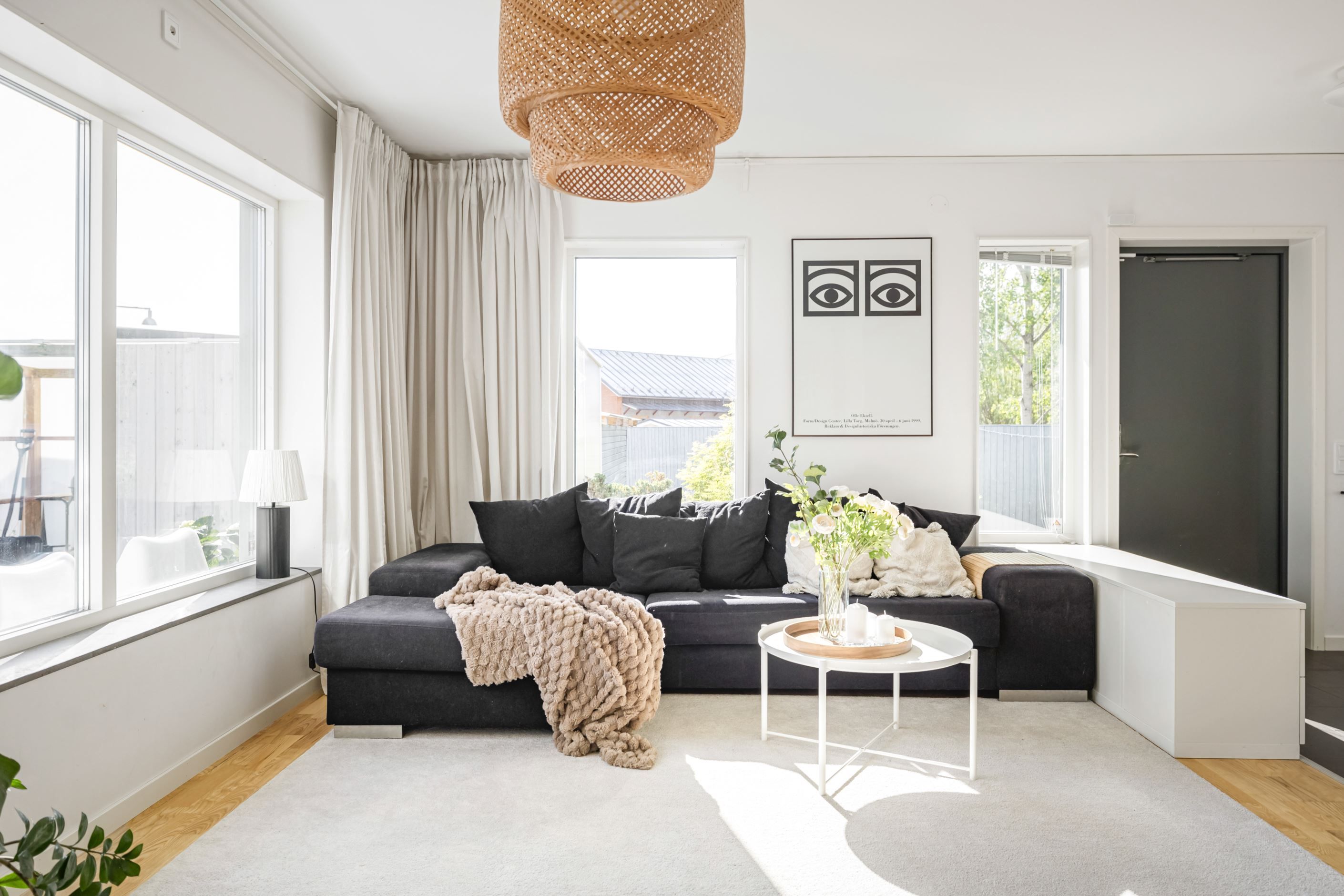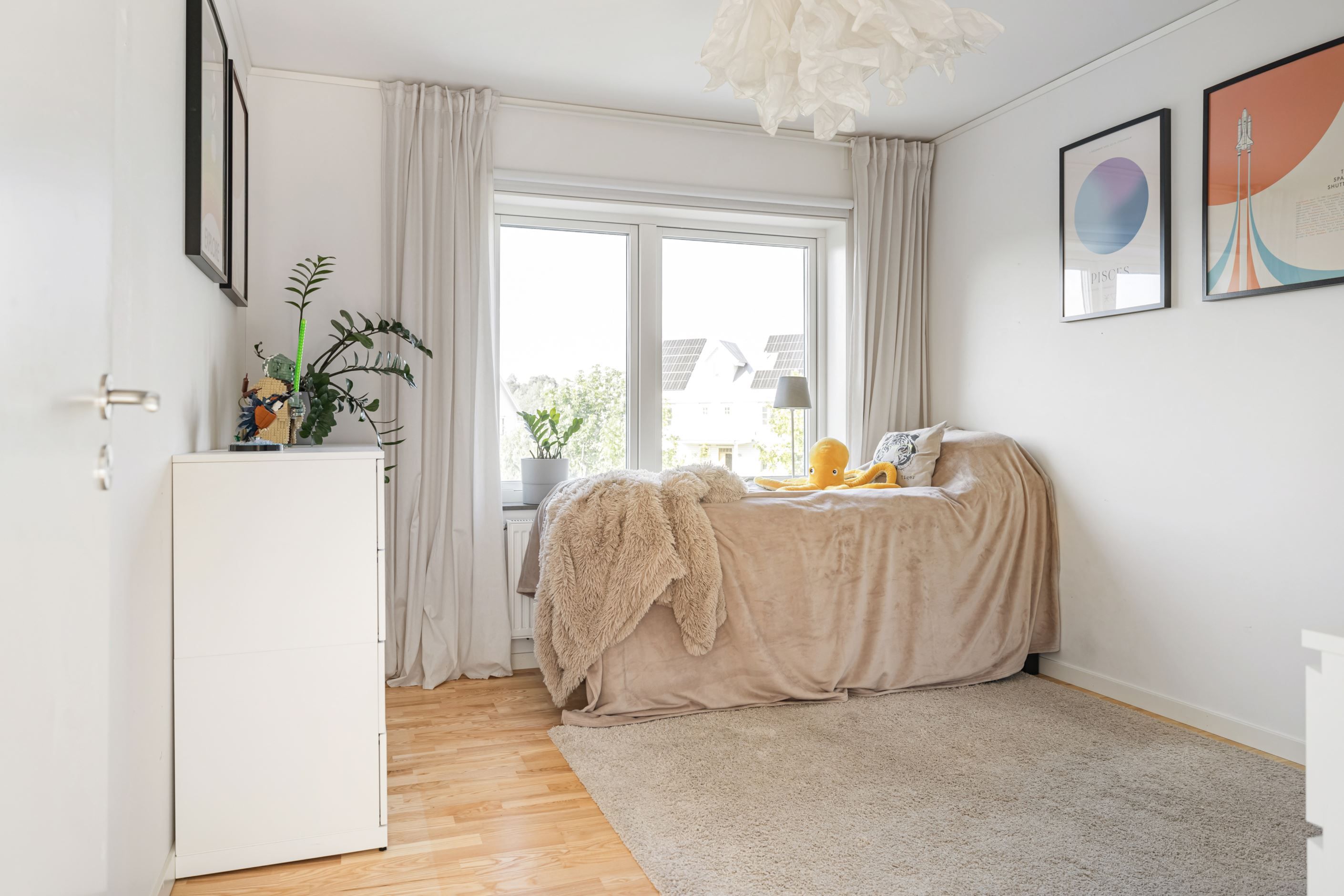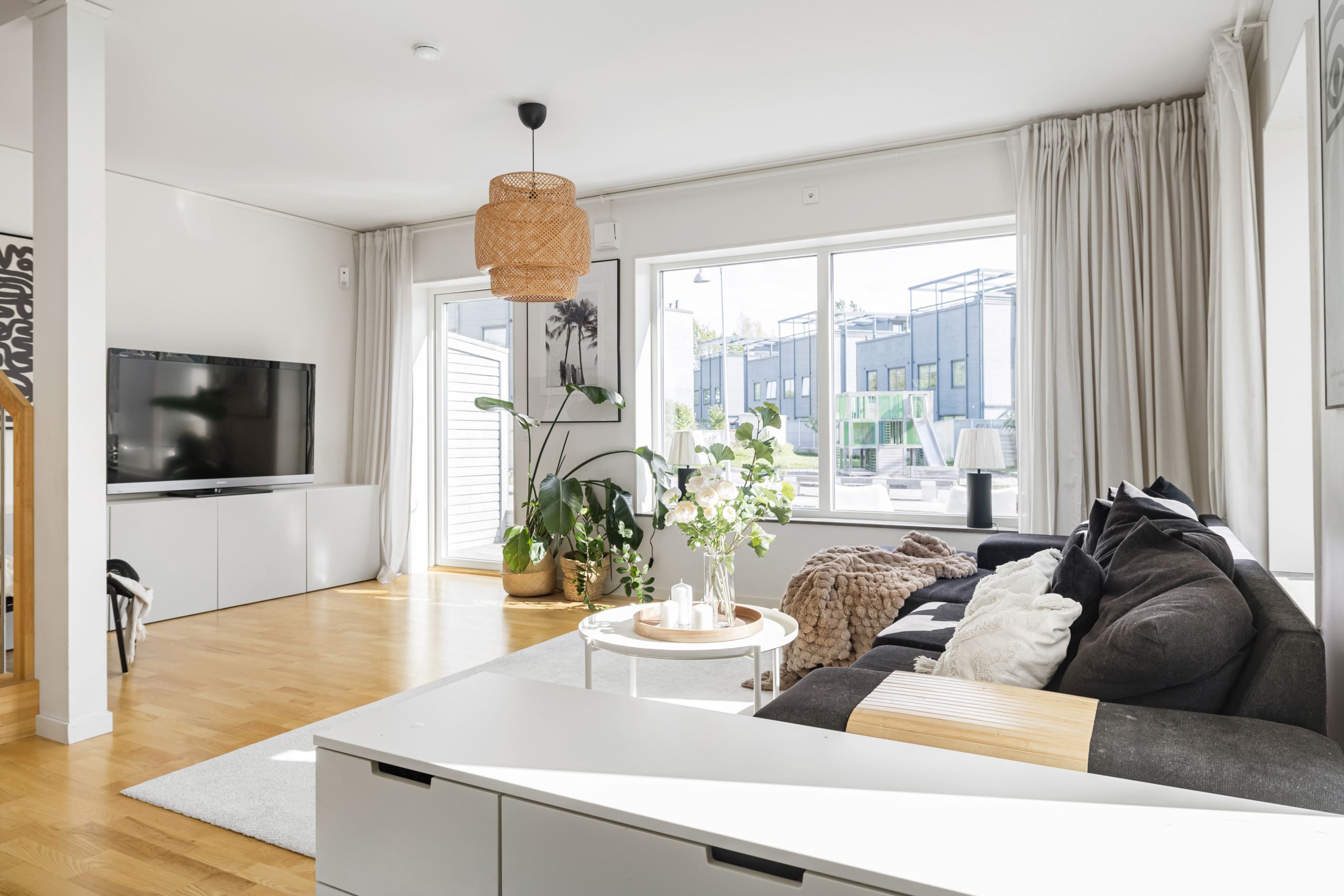 Invändigt på nedre plan erbjuds ett stort kök med mycket förvaring och bra matlagningsmöjligheter samtidigt som du har bra uppsikt över baksidan och barnen som leker där på gräsmattan, ett stort vardagsrum, badrum med dusch samt ett förråd. På övre plan finns 4 sovrum av bra storlek, badrum med badkar samt ett allrum/vardagsrum. Ytterligare en trappa upp finns den fina takterrassen.