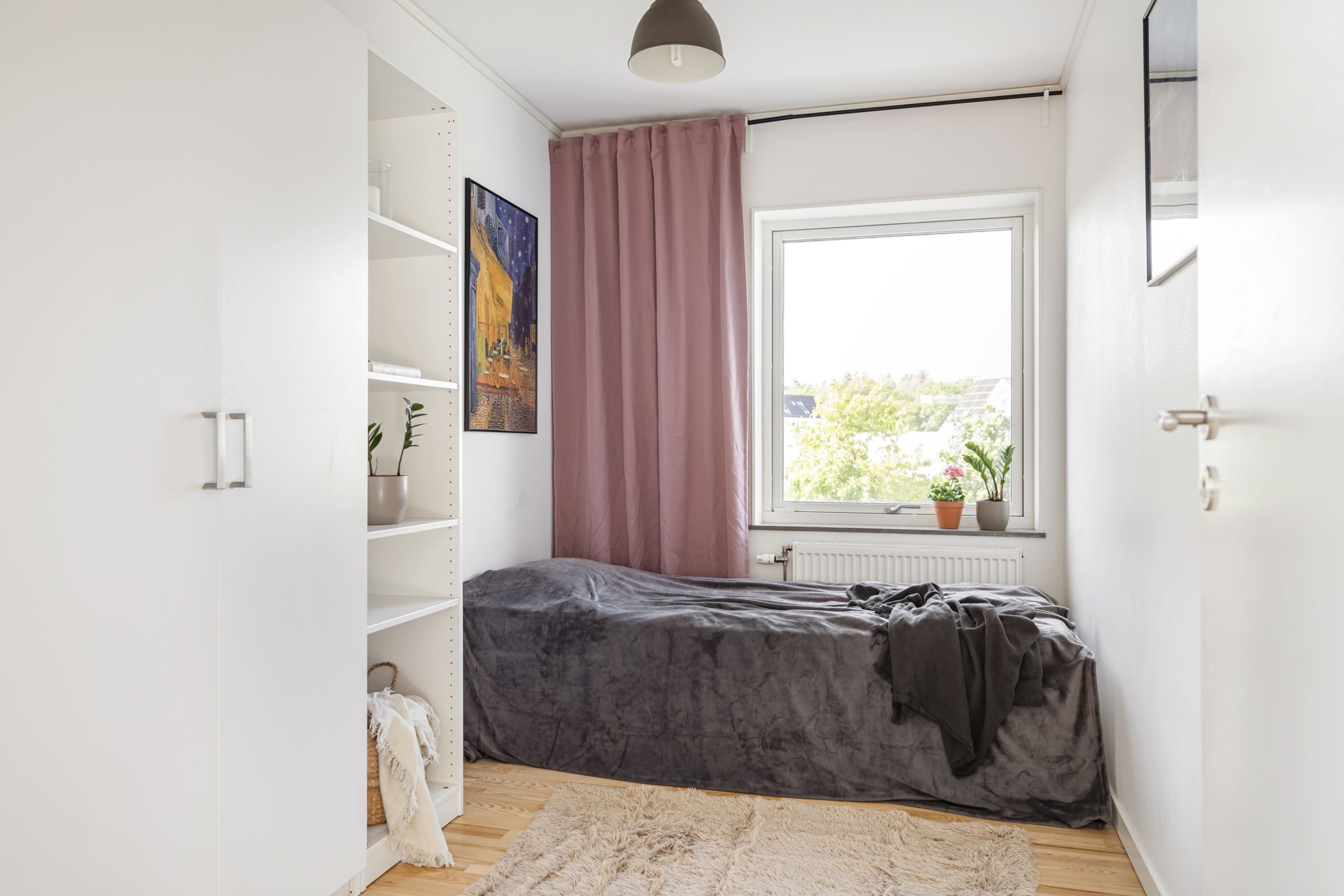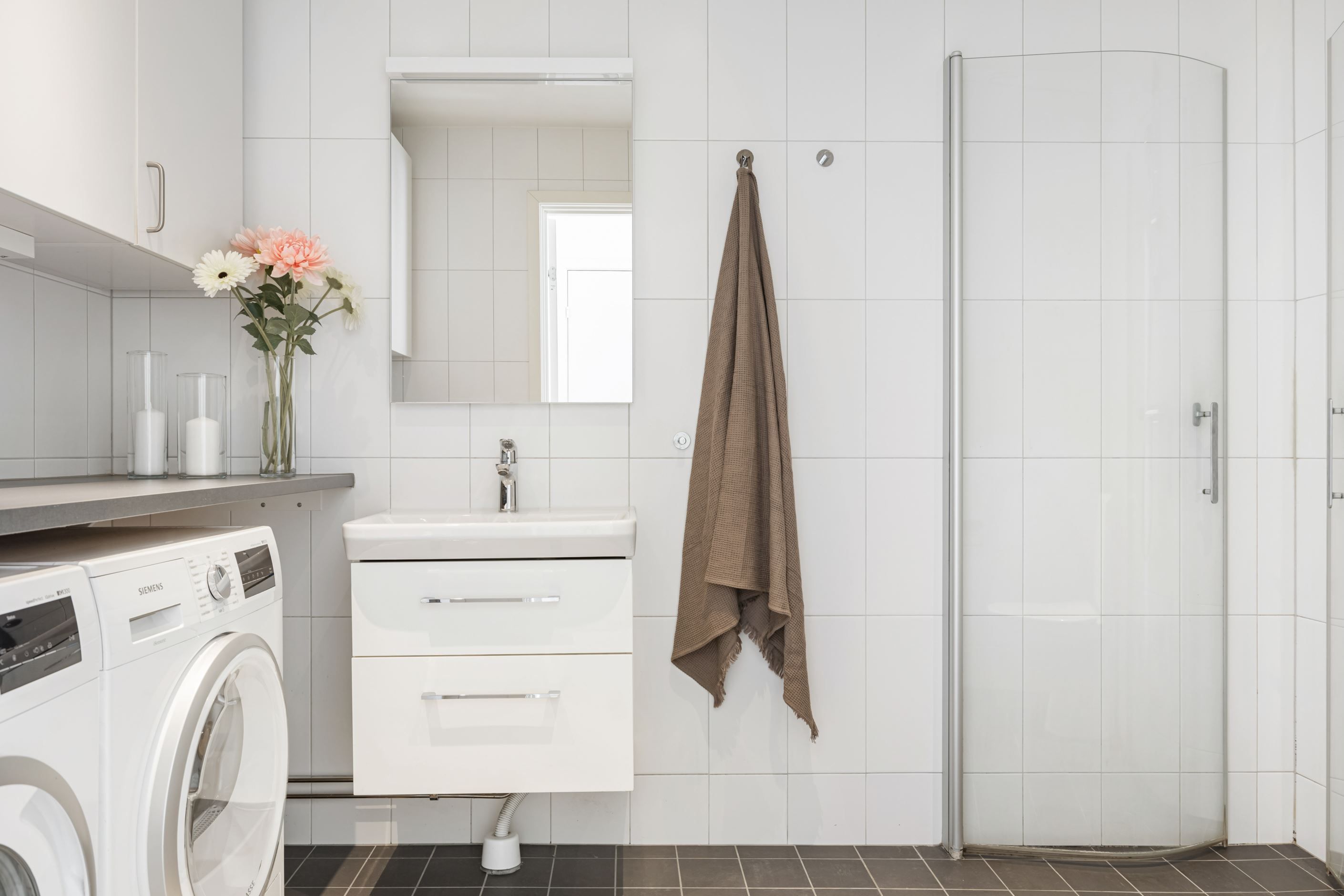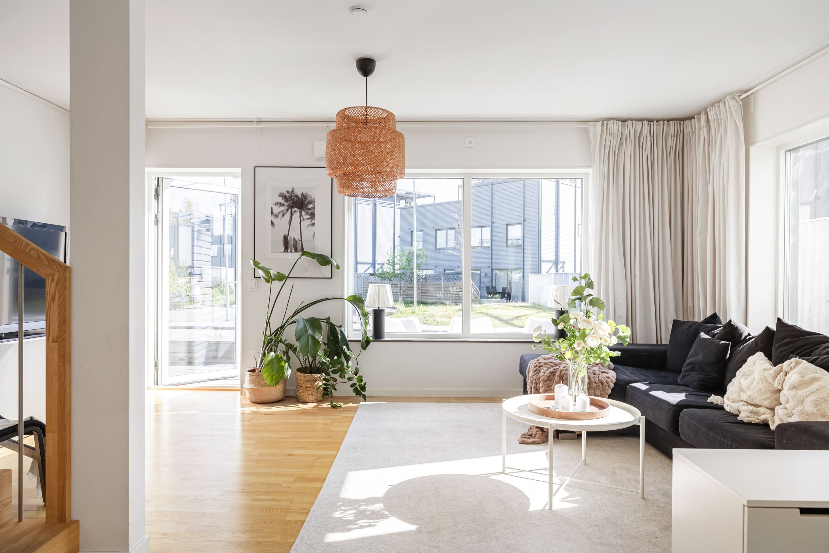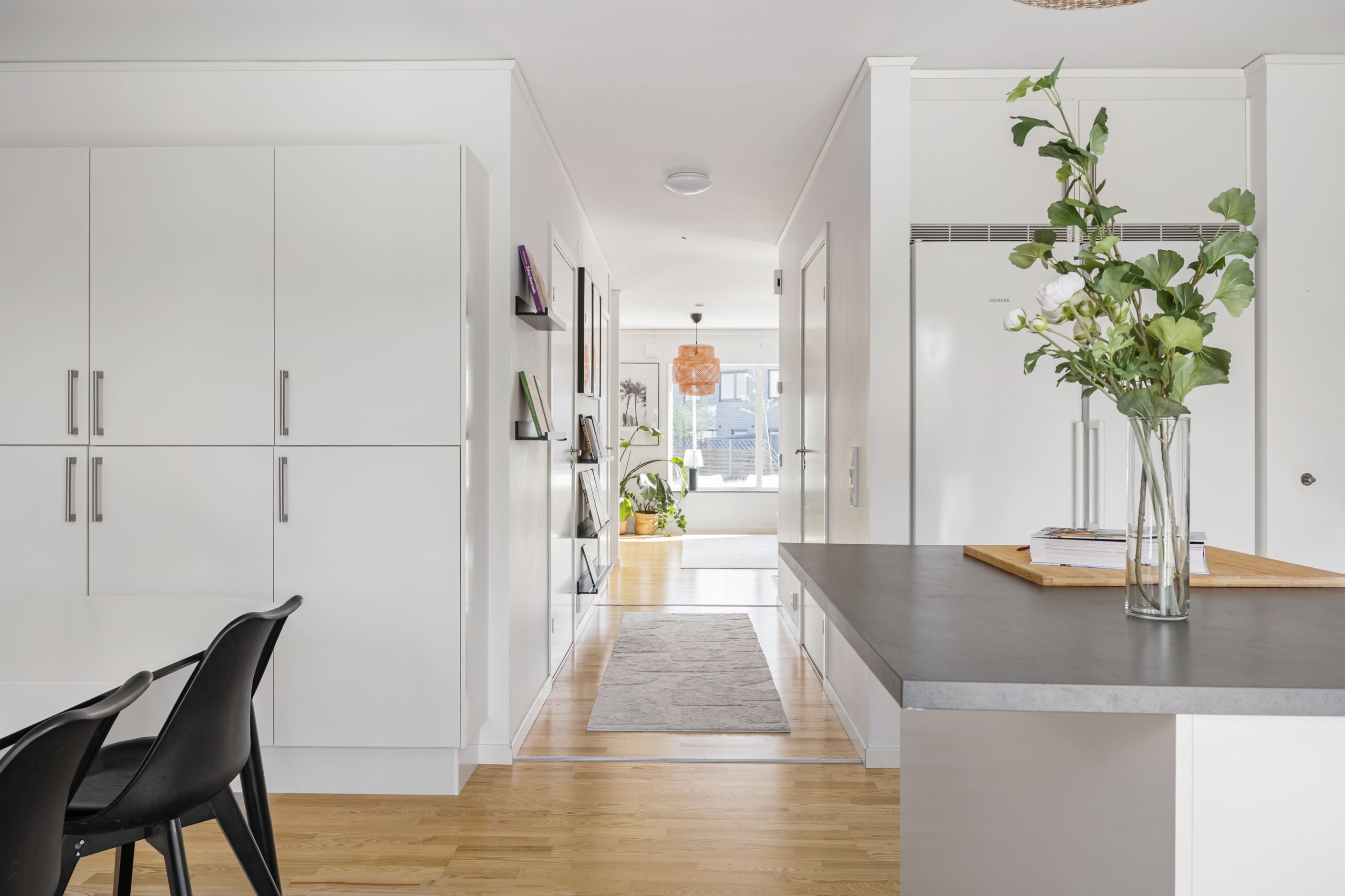 Invändigt på nedre plan erbjuds ett stort kök med mycket förvaring och bra matlagningsmöjligheter samtidigt som du har bra uppsikt över baksidan och barnen som leker där på gräsmattan, ett stort vardagsrum, badrum med dusch samt ett förråd. På övre plan finns 4 sovrum av bra storlek, badrum med badkar samt ett allrum/vardagsrum. Ytterligare en trappa upp finns den fina takterrassen.