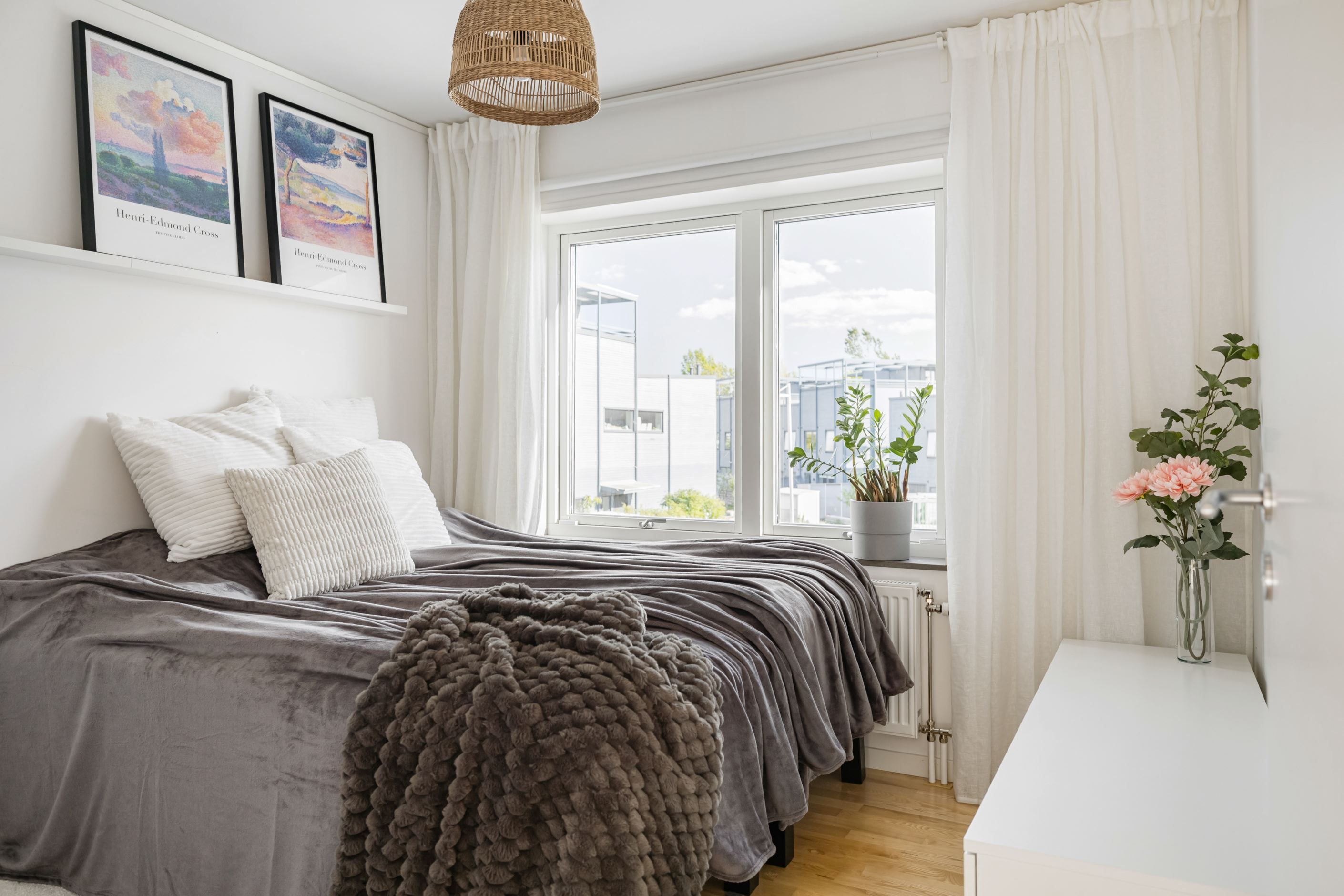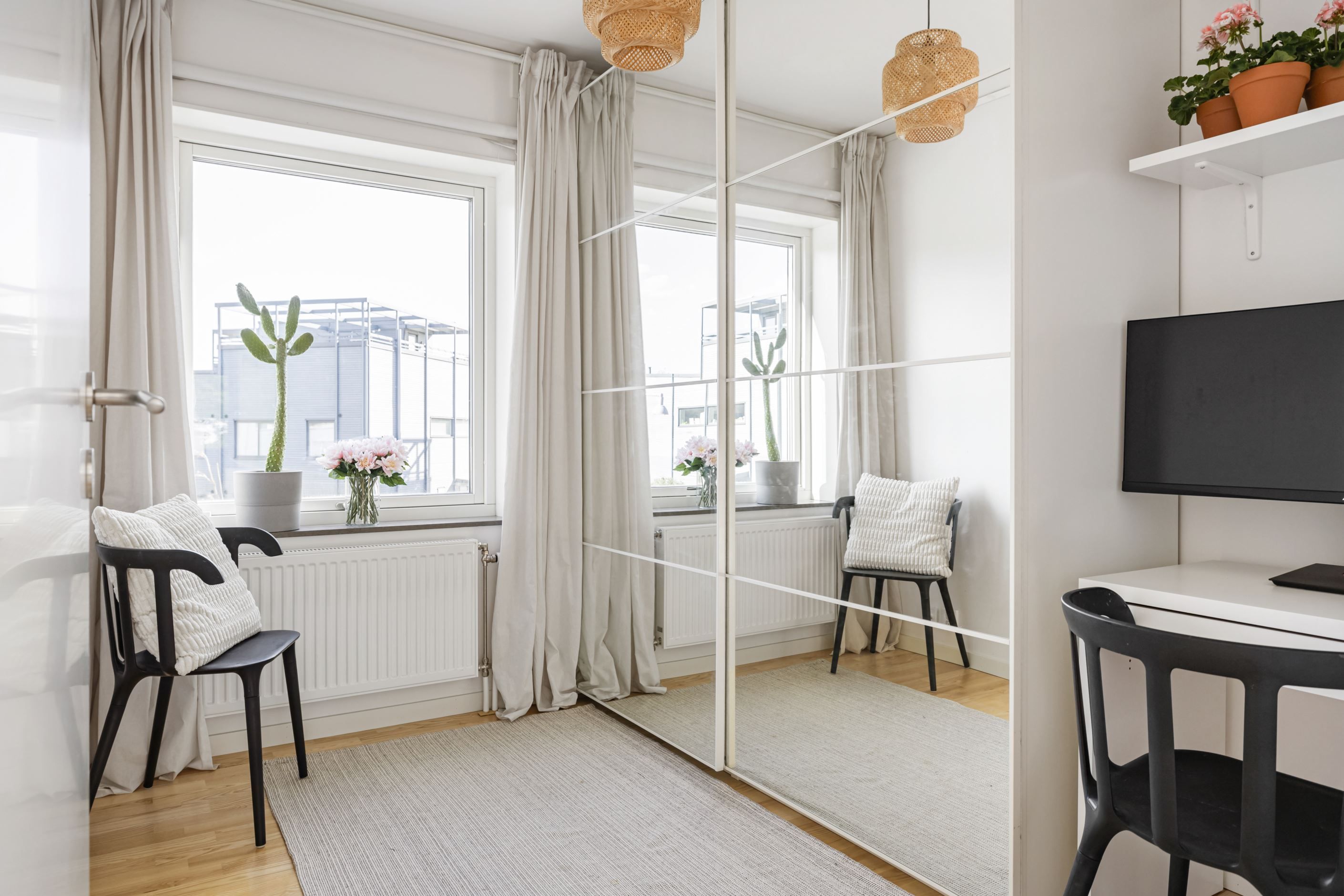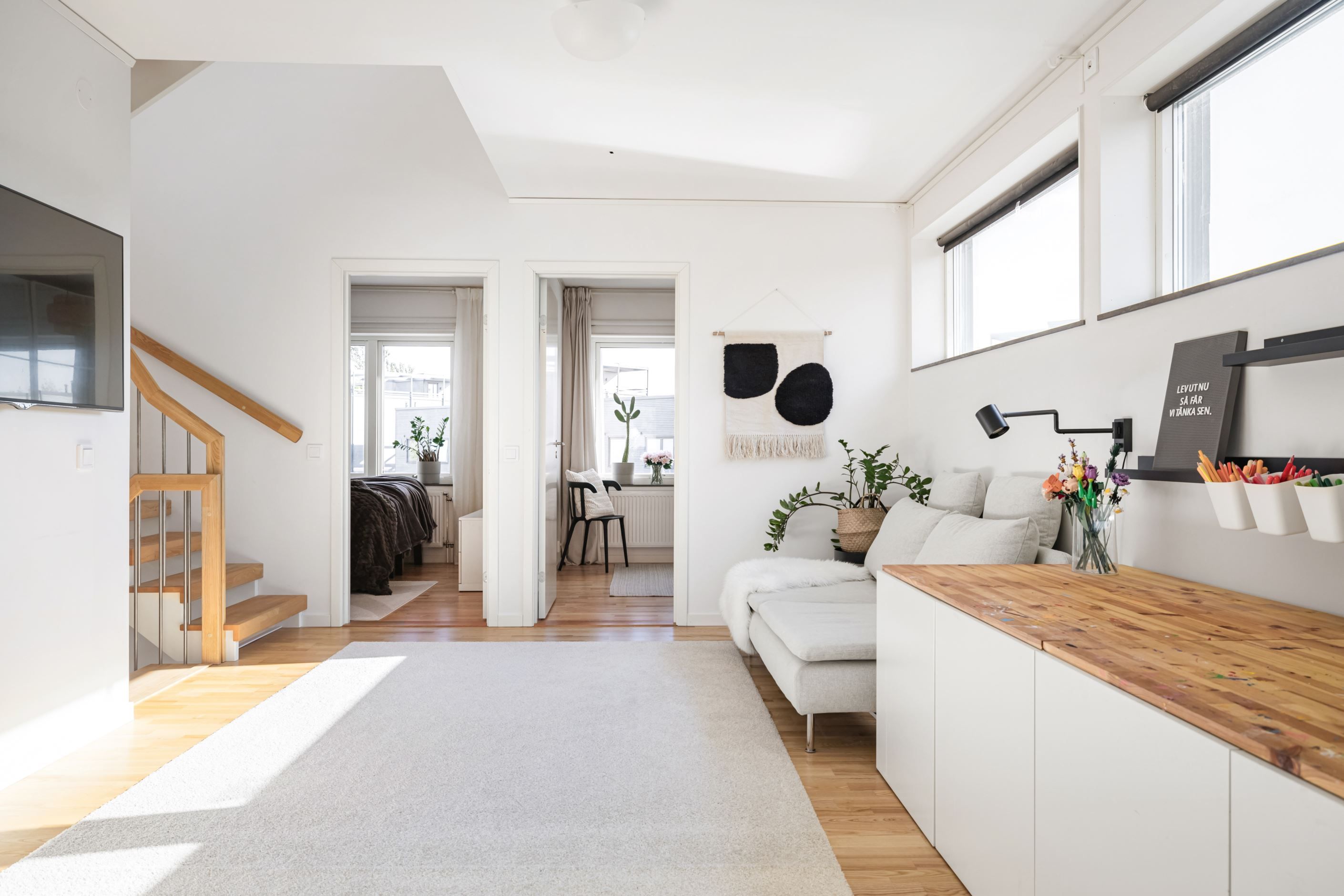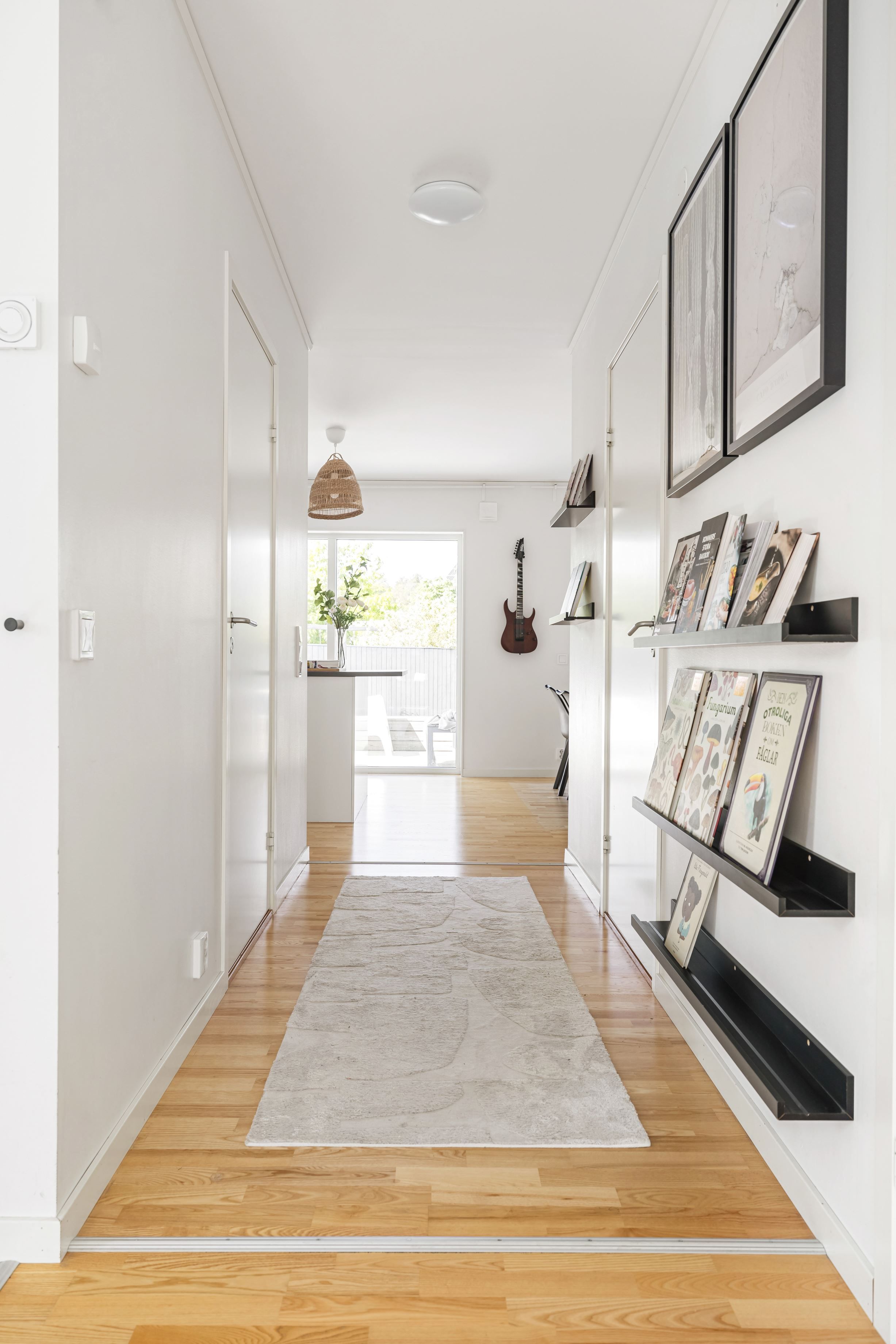 Invändigt på nedre plan erbjuds ett stort kök med mycket förvaring och bra matlagningsmöjligheter samtidigt som du har bra uppsikt över baksidan och barnen som leker där på gräsmattan, ett stort vardagsrum, badrum med dusch samt ett förråd. På övre plan finns 4 sovrum av bra storlek, badrum med badkar samt ett allrum/vardagsrum. Ytterligare en trappa upp finns den fina takterrassen.