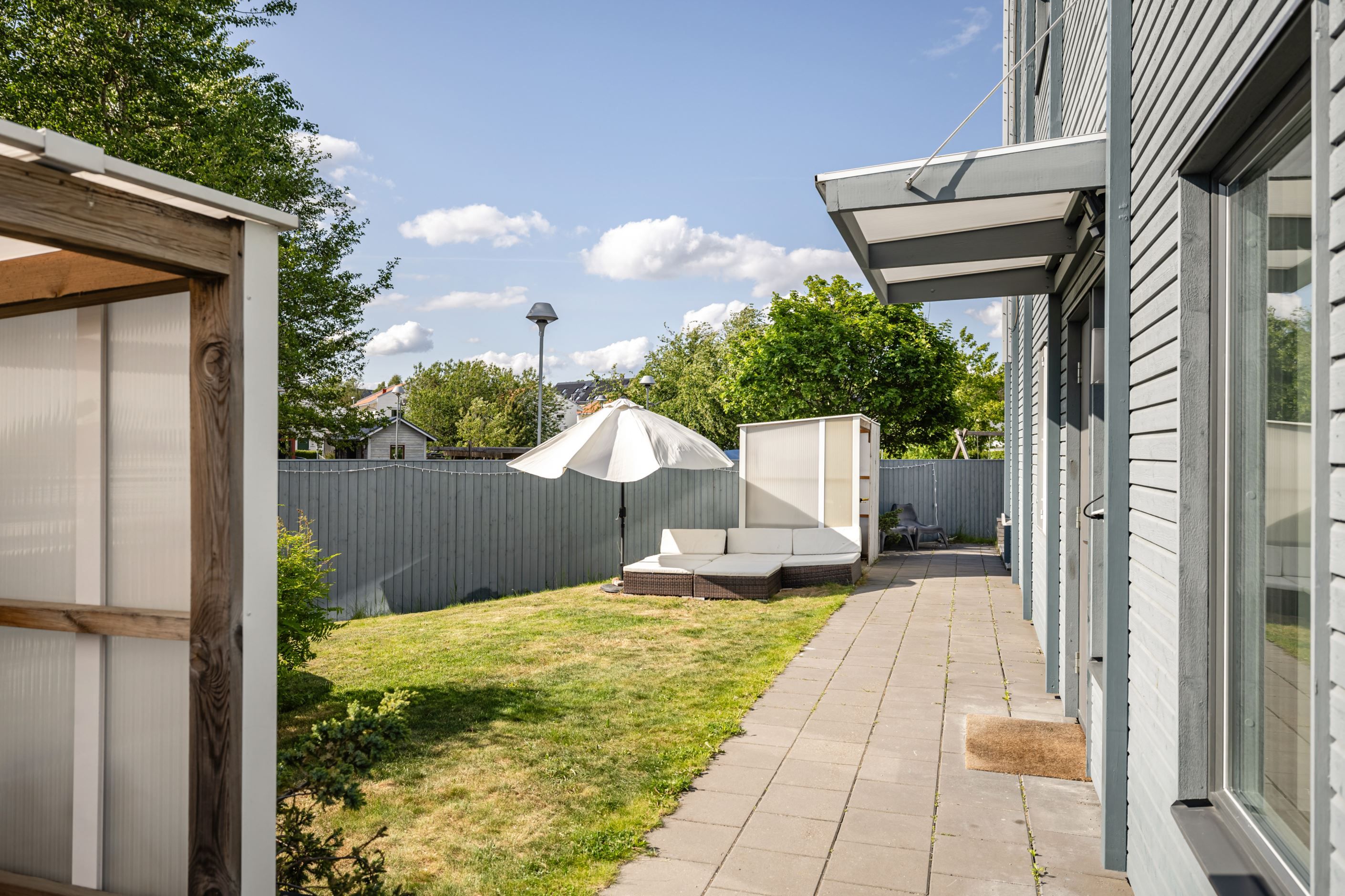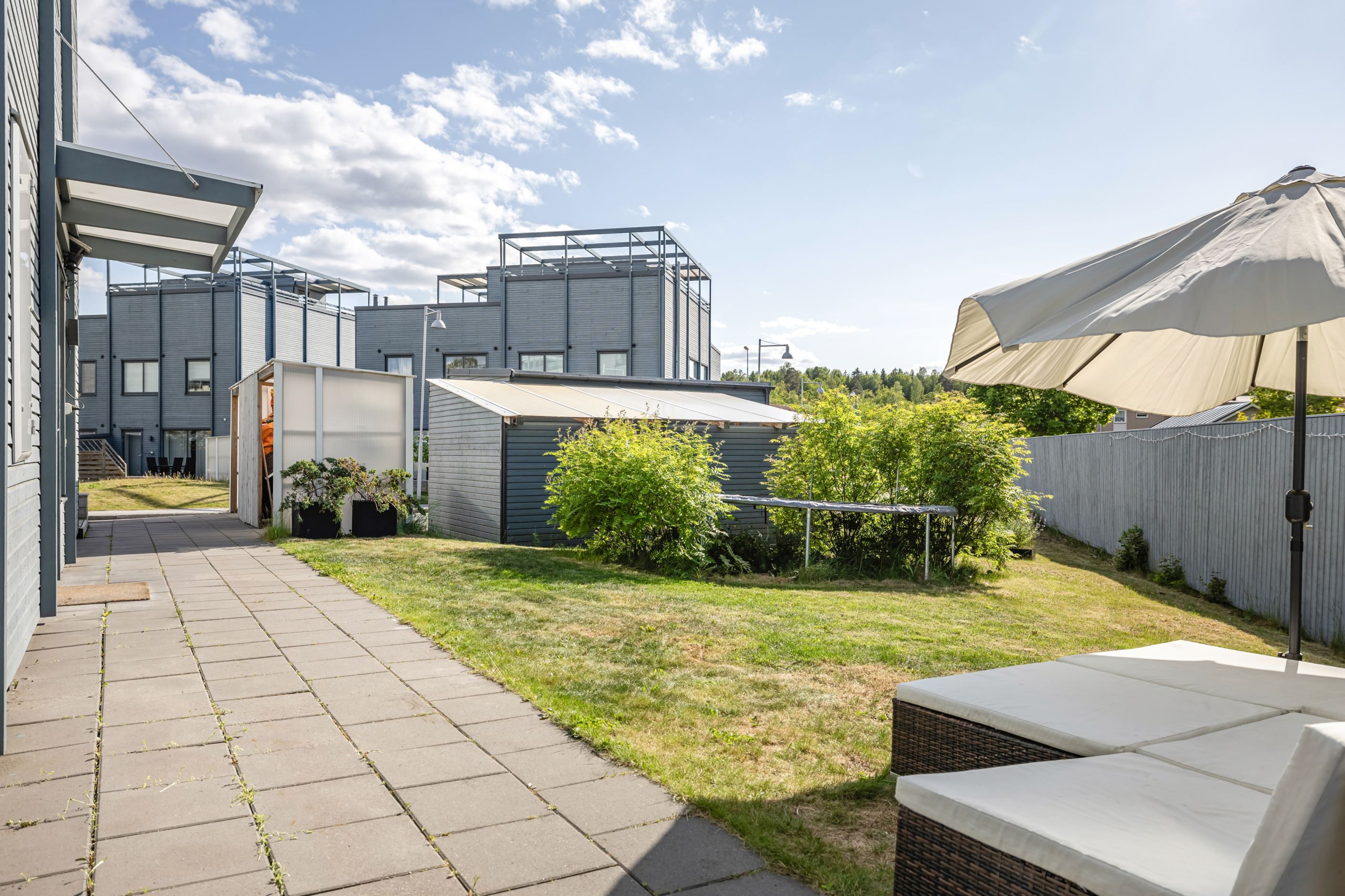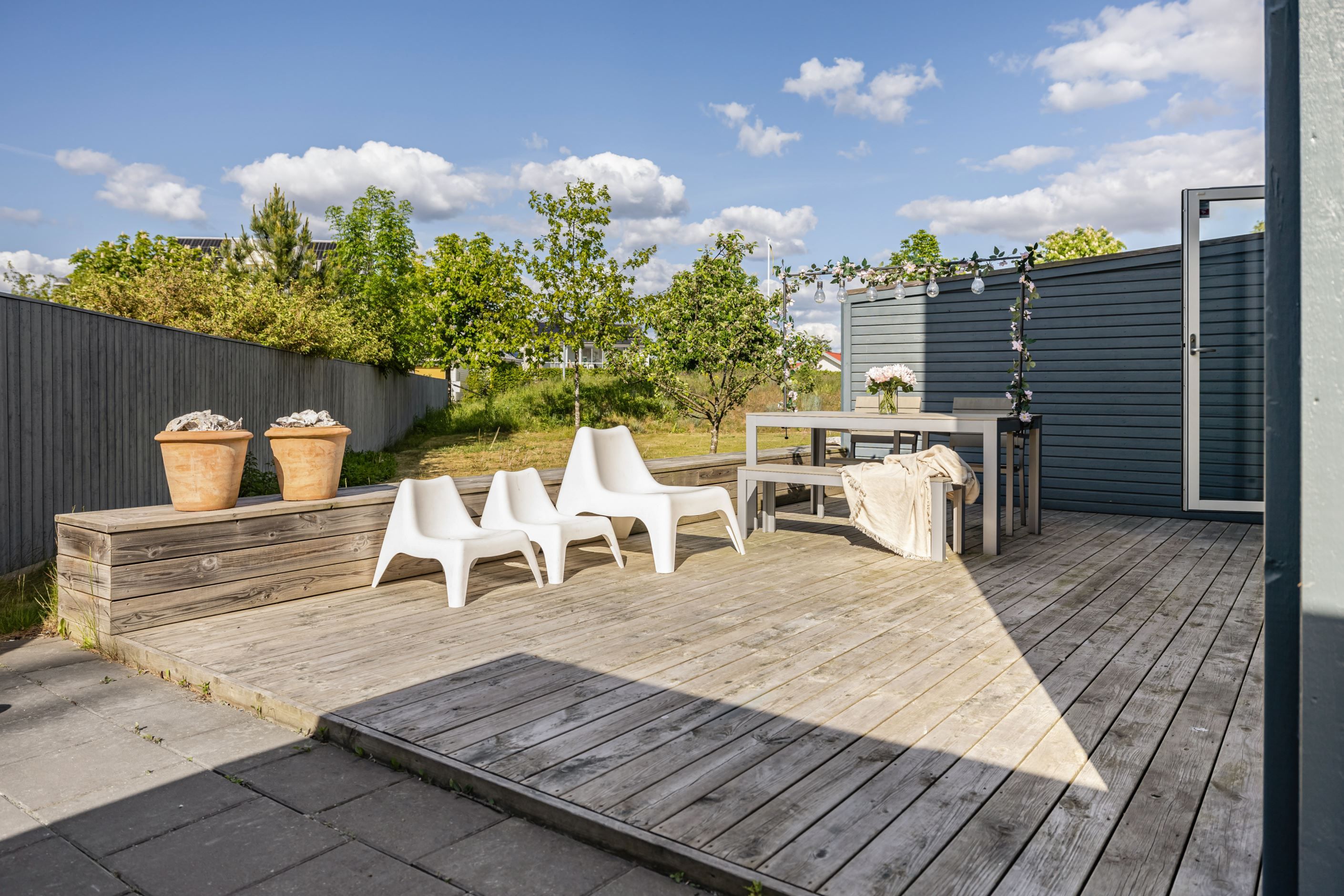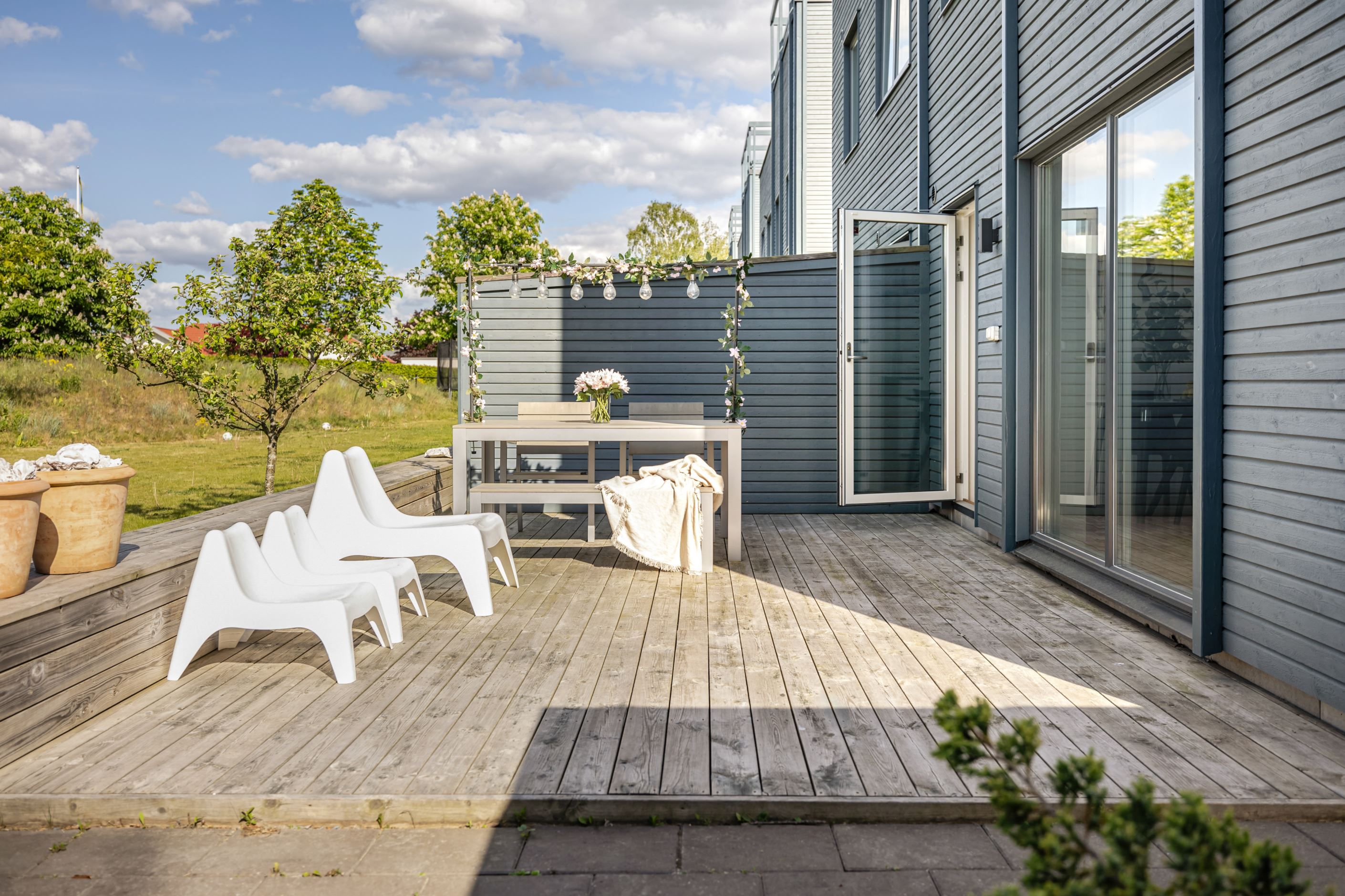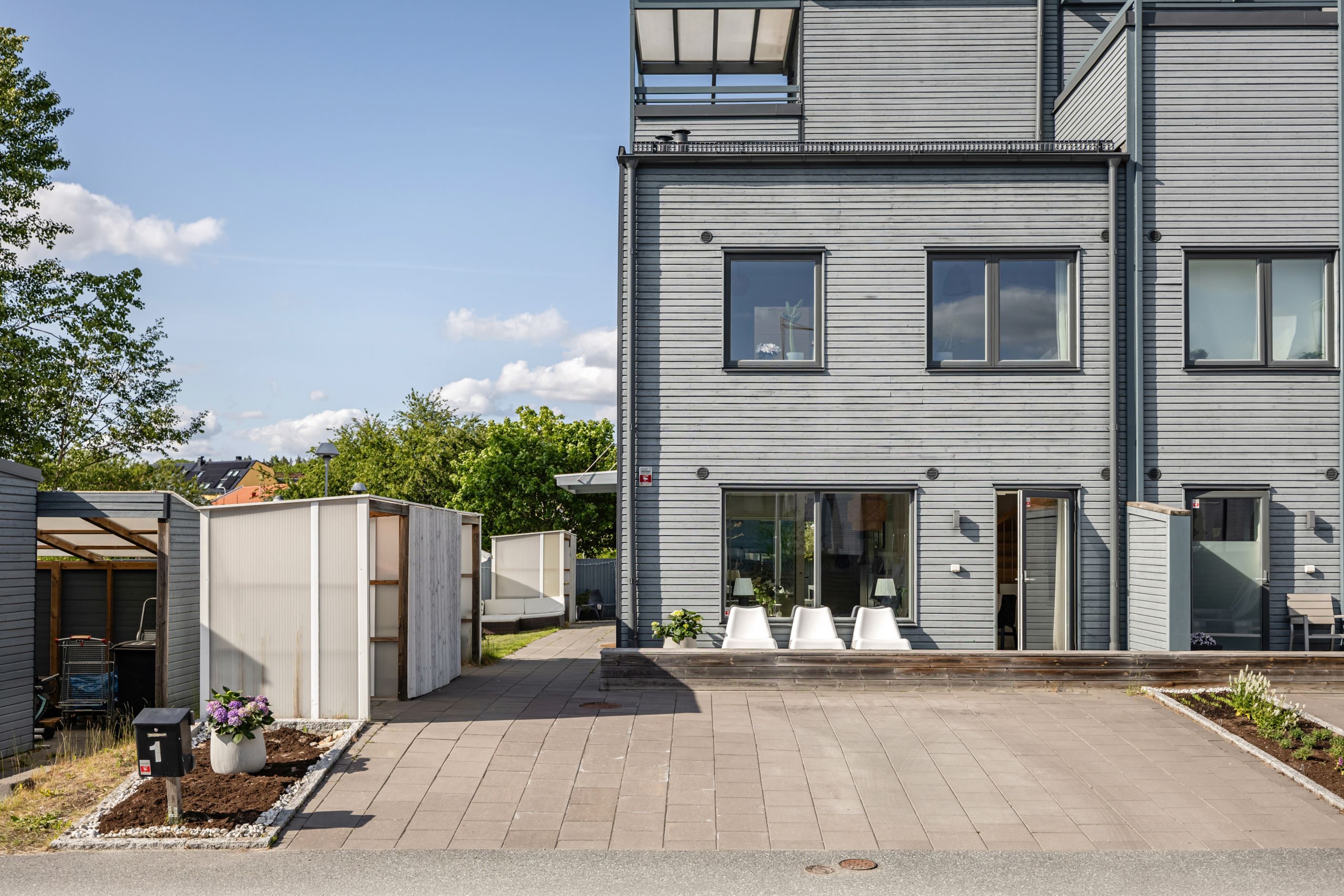 Äntligen är huset med troligtvis det bästa läget på gatan till salu! Nummer ett ligger givetvis med det bästa läget i området, på gaveln och med en stor gräsyta på sidan av huset samt en insynsskyddad baksida med morgonsol och eftermiddagssol. På framsidan av huset finns parkering för 2-3 bilar. På sidan av huset erbjuds en stor gräsmatta och här finns sol större delar av dagen. När kvällen kommer och man vill vara lite privat förflyttar man enkelt middagen till baksidan av huset. Baksidan är insynsskyddad och perfekt för den som vill avnjuta middagen i lugn och ro med vänner. Som om läget på huset inte var bra nog - här har du en makalös takterrass på 43 kvm; den större varianten i området. Takterrassen är väldigt uppskattad av dom boende i området, här får du plats med både matbord och loungegrupp.