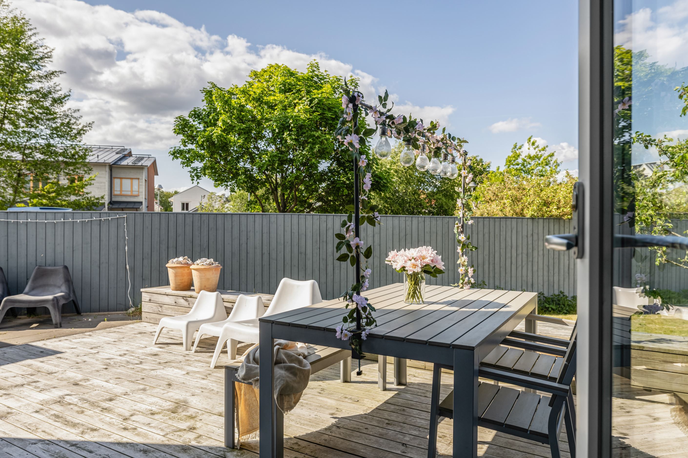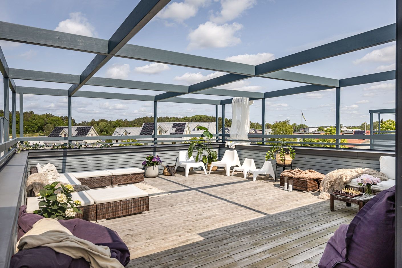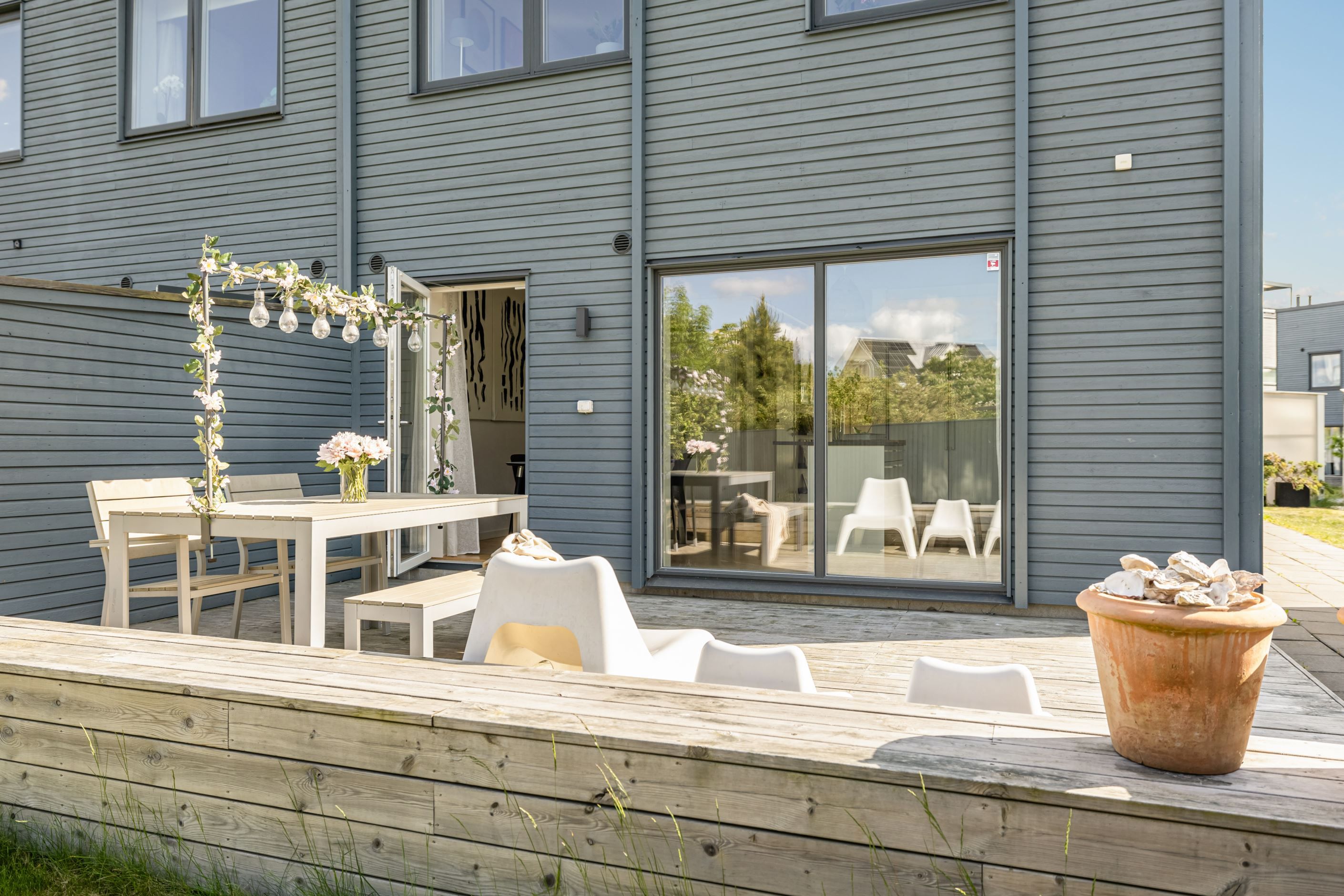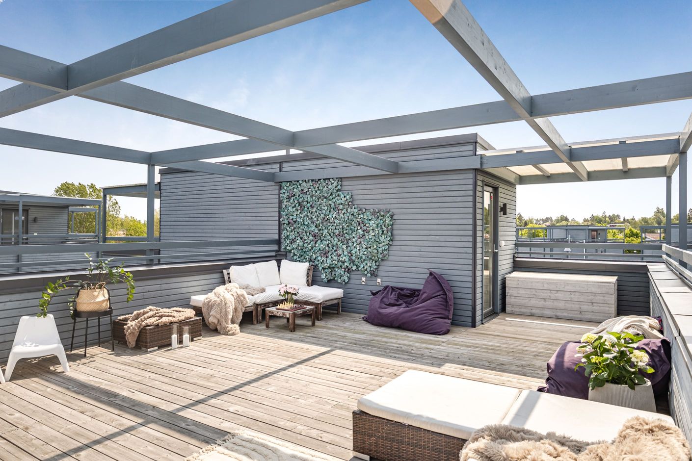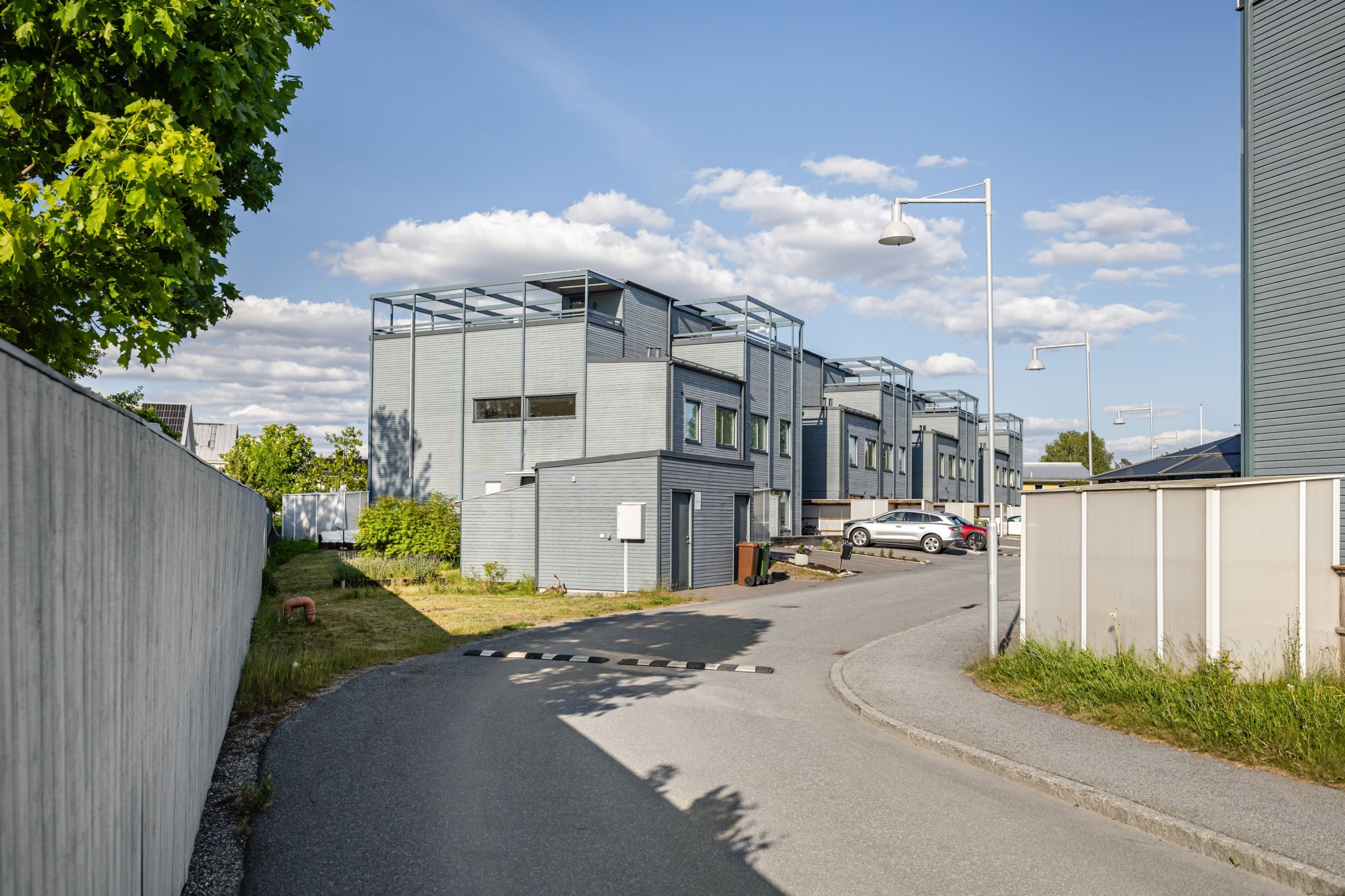Äntligen är huset med troligtvis det bästa läget på gatan till salu! Nummer ett ligger givetvis med det bästa läget i området, på gaveln och med en stor gräsyta på sidan av huset samt en insynsskyddad baksida med morgonsol och eftermiddagssol. På framsidan av huset finns parkering för 2-3 bilar. På sidan av huset erbjuds en stor gräsmatta och här finns sol större delar av dagen. När kvällen kommer och man vill vara lite privat förflyttar man enkelt middagen till baksidan av huset. Baksidan är insynsskyddad och perfekt för den som vill avnjuta middagen i lugn och ro med vänner. Som om läget på huset inte var bra nog - här har du en makalös takterrass på 43 kvm; den större varianten i området. Takterrassen är väldigt uppskattad av dom boende i området, här får du plats med både matbord och loungegrupp.