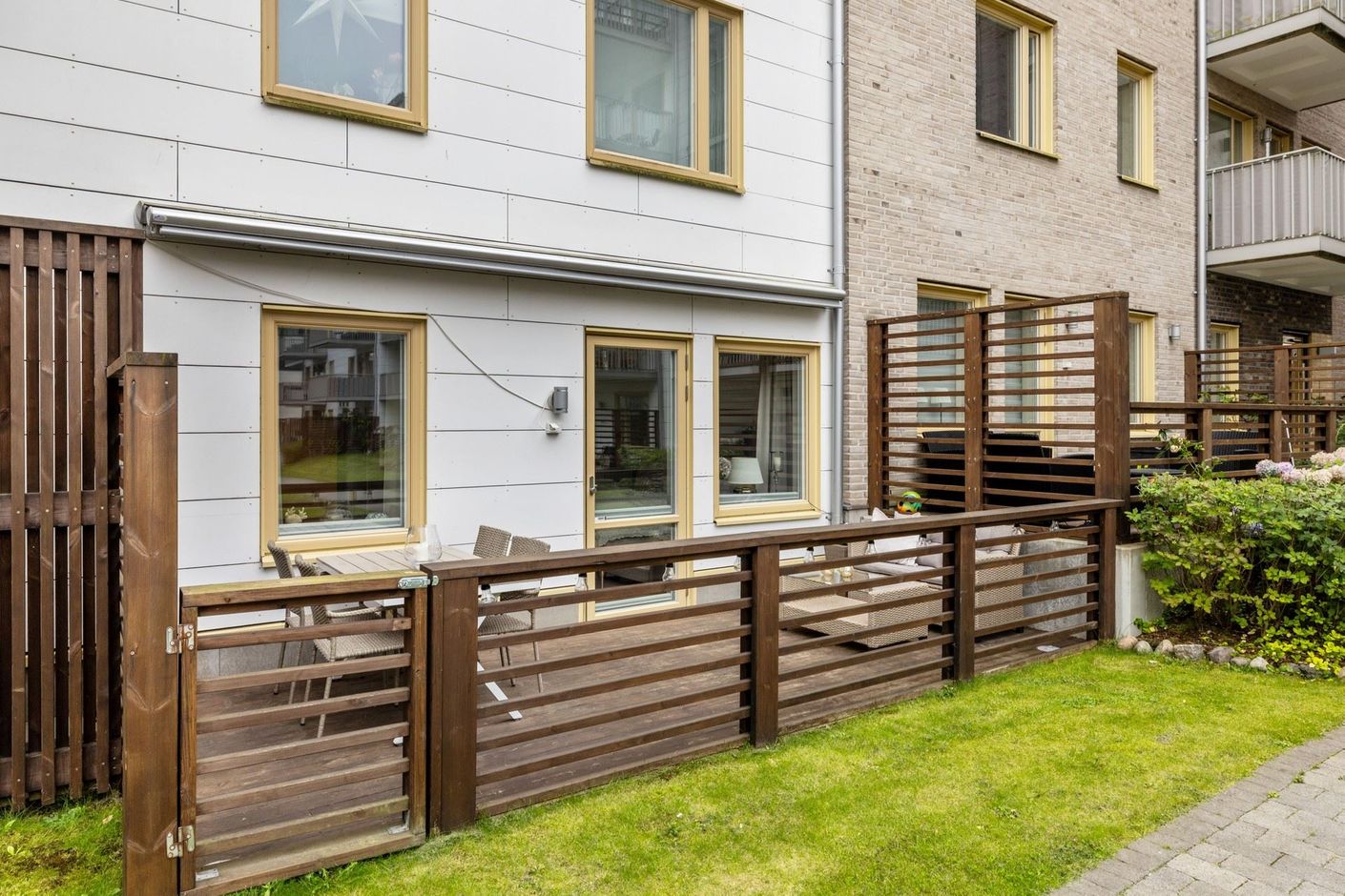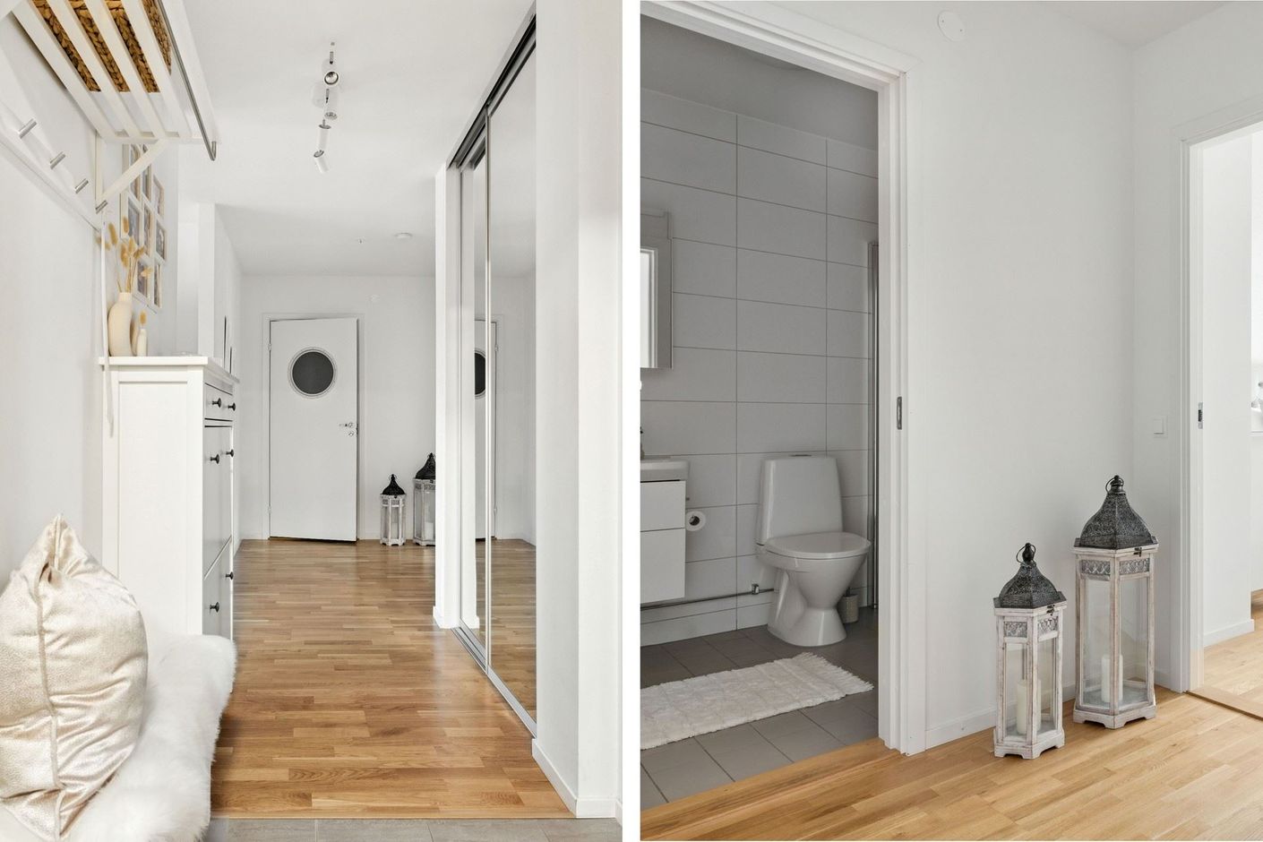 När man kliver in i bostaden möts man av en rymlig hall med gott om förvaringsmöjligheter tack vare en stor skjutdörrsgarderob. Vidare finner du ett helkaklat badrum med WC, dusch och handfat med kommod, tvättmaskin och torktumlare. Från hallen nås också bostadens hjärta - vardagsrummet och köket i halvöppen planlösning med plats för soffgrupper och matbord. Två sovrum där båda har gott om förvaring.
