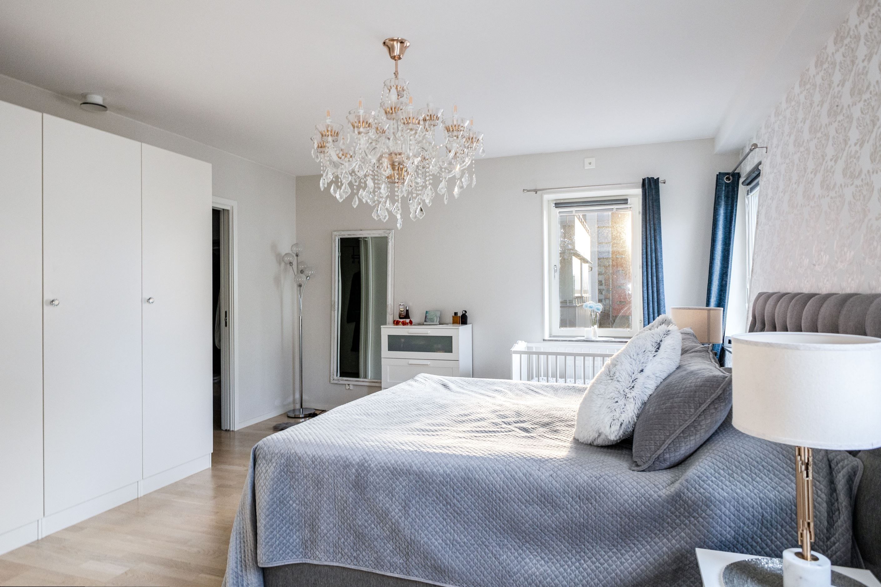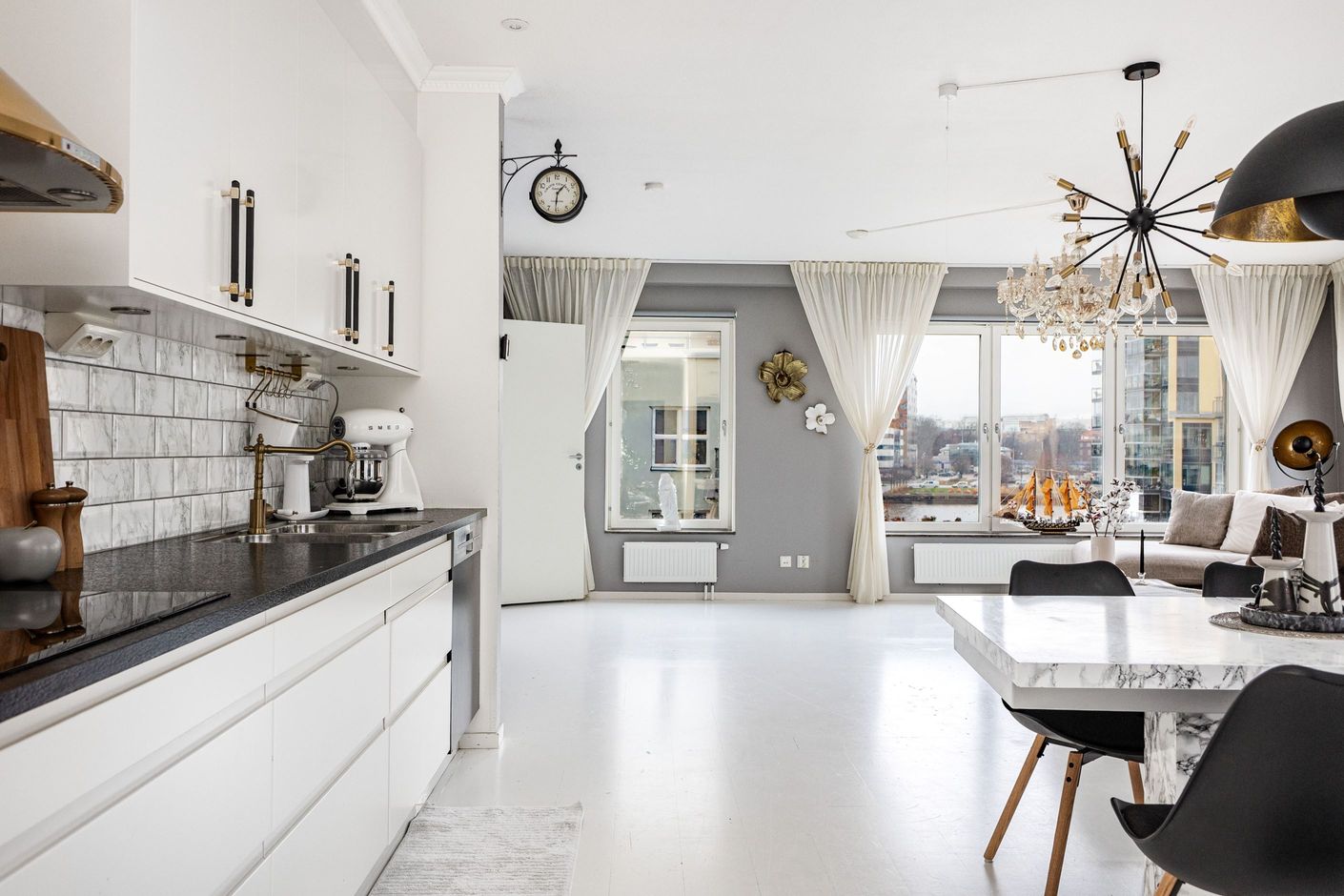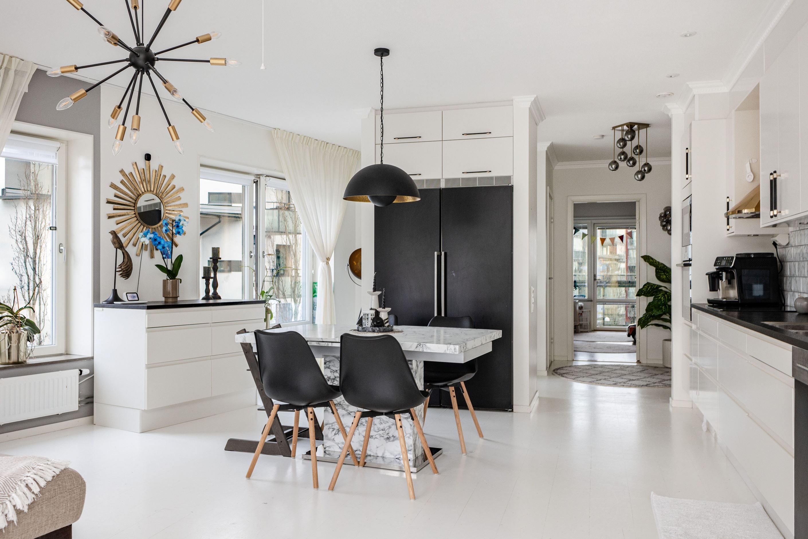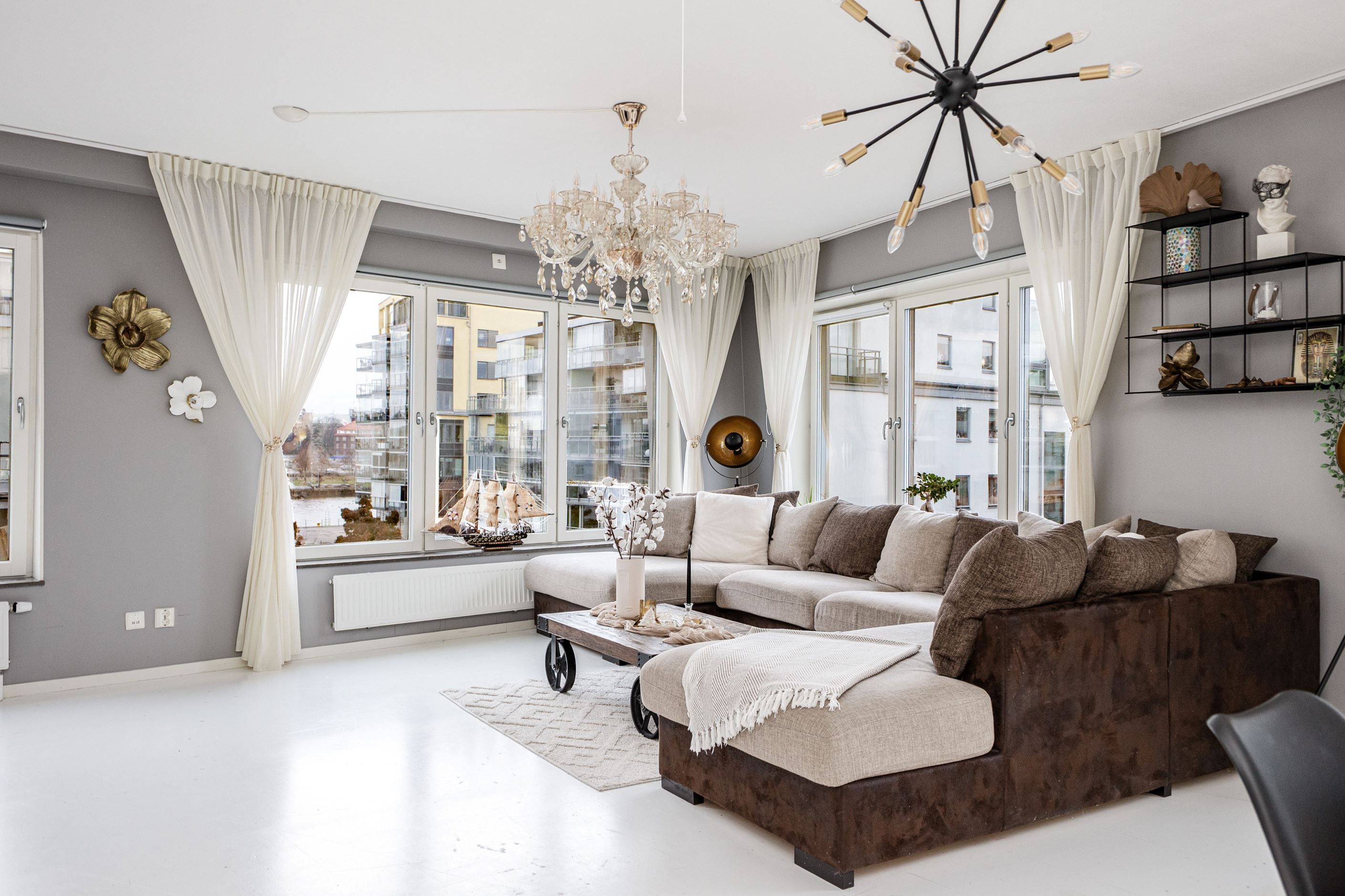 Med sina generösa 129,5 kvadratmeter bjuder denna bostad på en harmonisk kombination av stilrena materialval, ljusa ytor och en planlösning skapad för både vardagsliv och sociala sammanhang. De stora fönsterpartierna släpper in ett fantastiskt ljus och ramar in utsikten över Mälaren från två håll - en unik detalj som gör hemmet lika vackert som det är funktionellt.