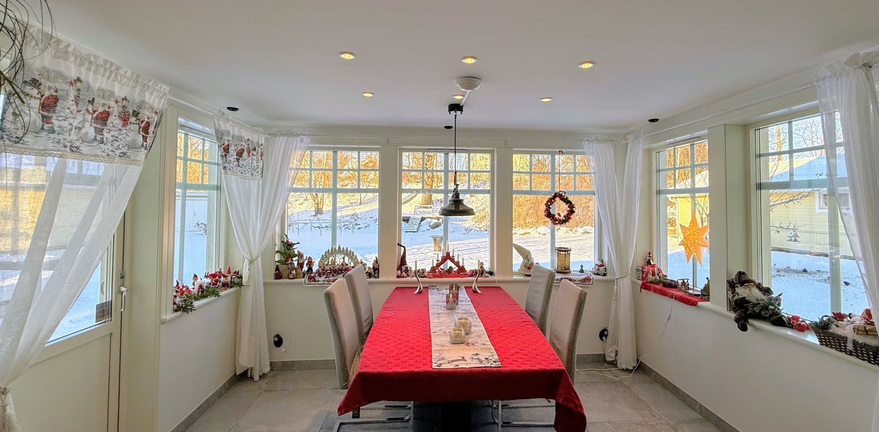 Högkvalitativt kök från Ballingslöv med maskinell utrustning bestående av inbyggnadsugn, inbyggnadsmikro, vinkyl, induktionshäll, takhängd fläktkåpa, kyl, frys och diskmaskin. Köket har en jämn fin belysning dels från takspotlights och även under överskåpen med dimmer och olika färgvalsfunktioner. Här finner ni väl tilltagna arbetsytor utmärkt för matlagning och umgänge med en stor köksö. Klinkergolv och betongbänkskiva. Matplatsen är placerad i glasverandan med öppen planlösning mot köket.