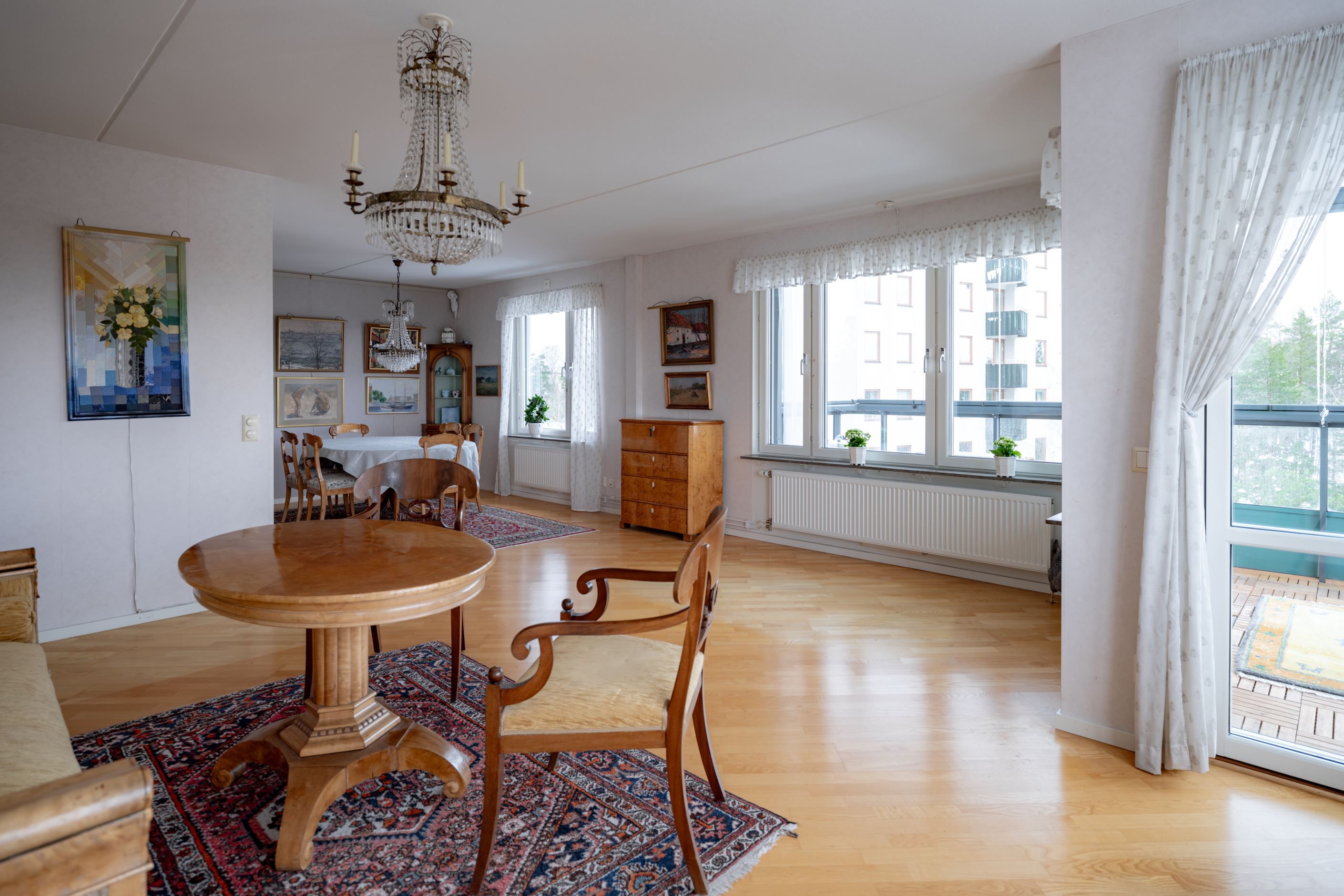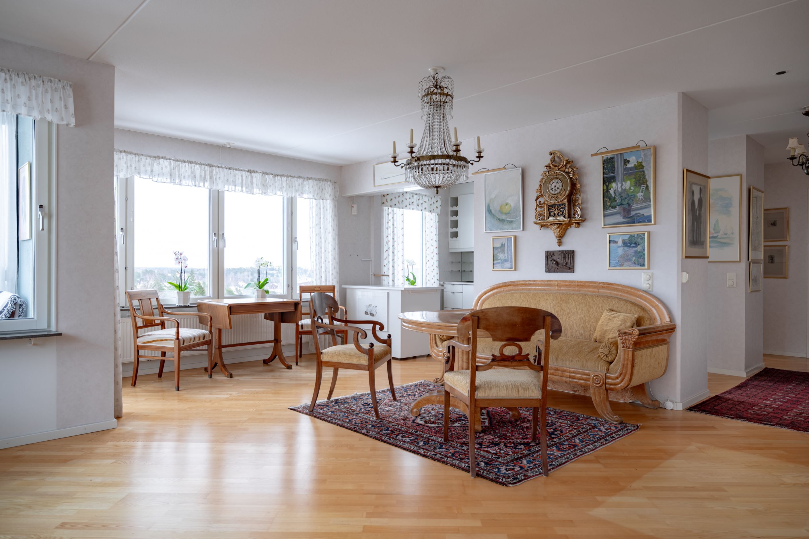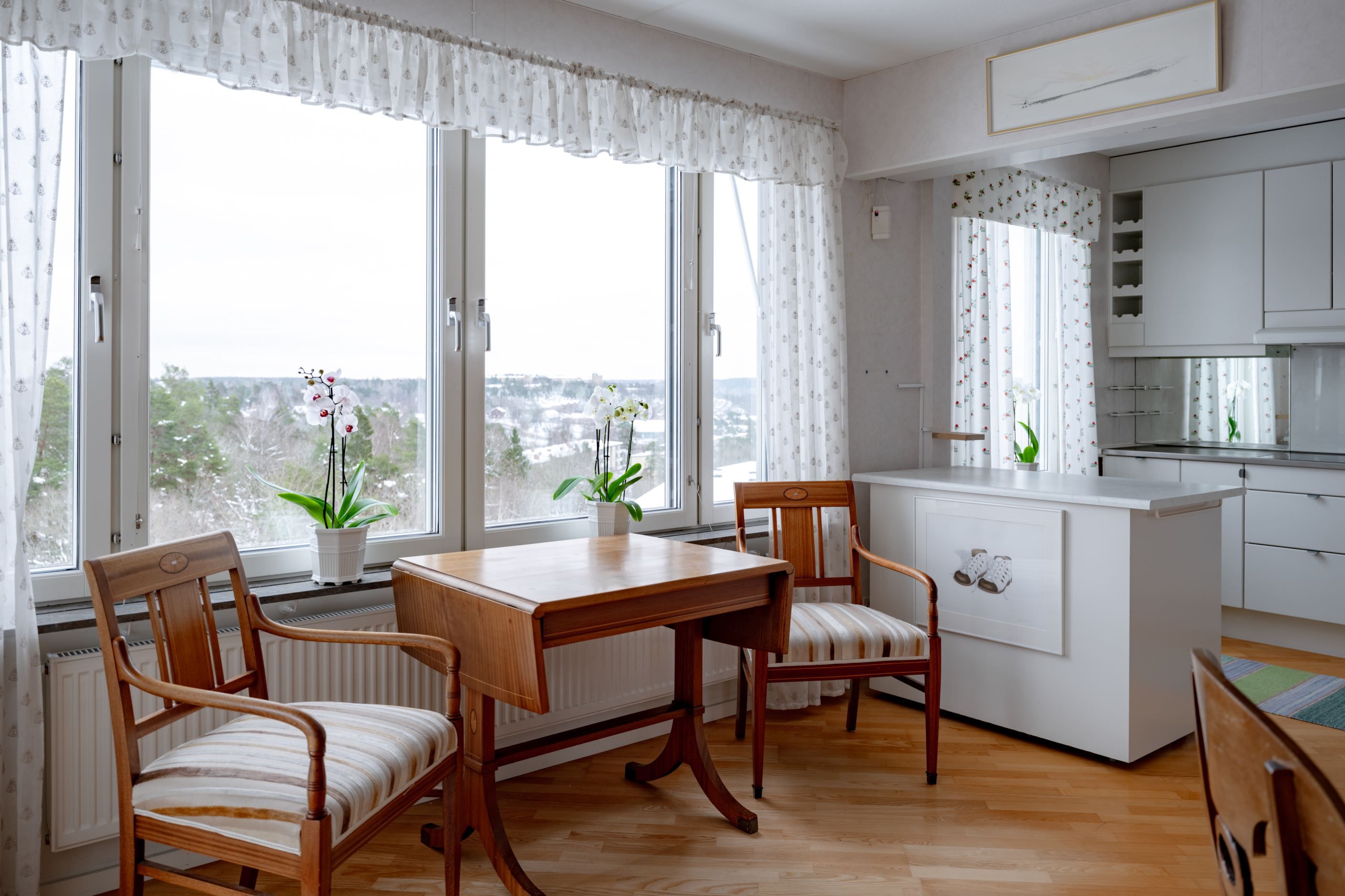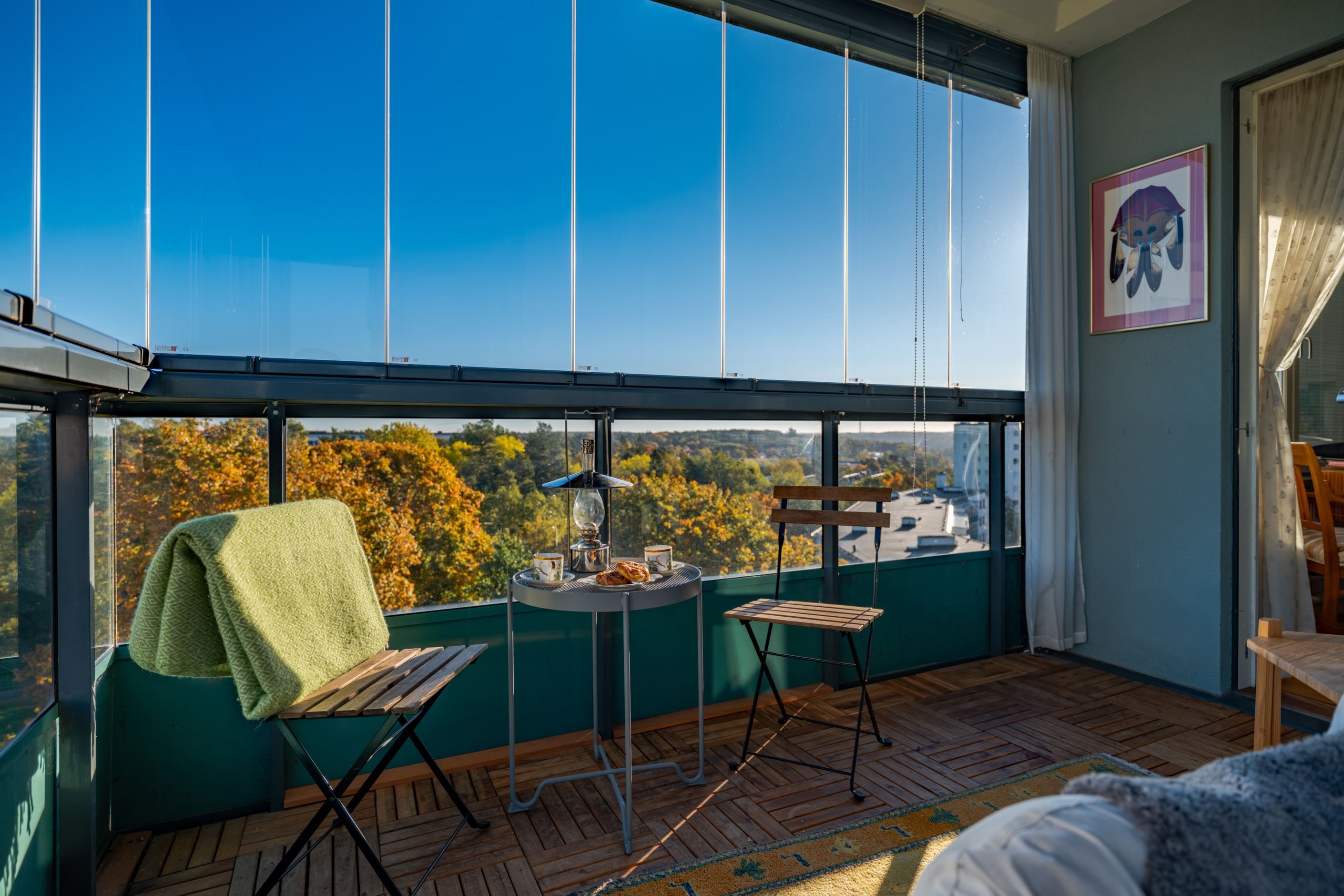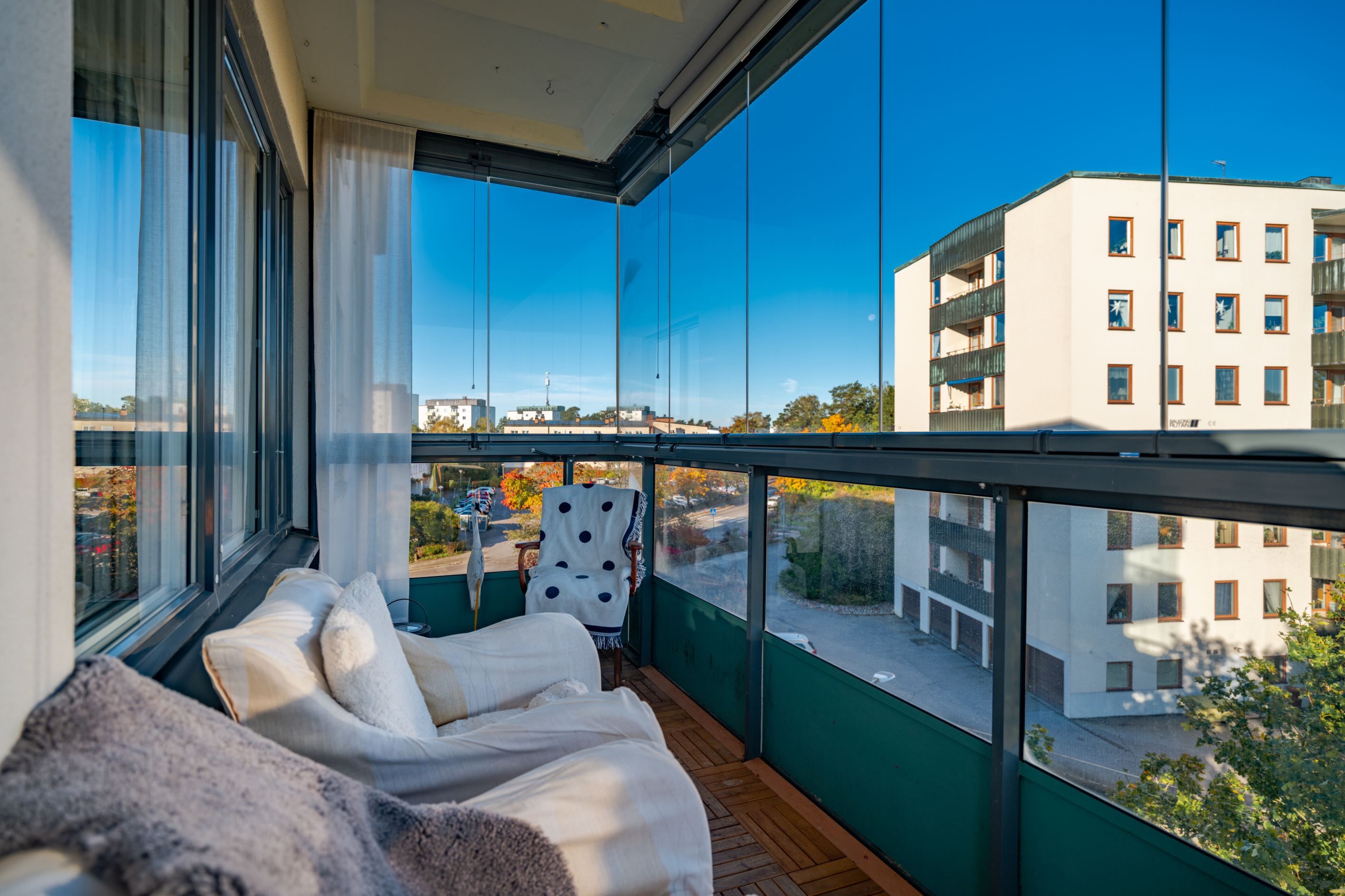 Bostadens hjärta är den öppna planlösningen mellan kök och vardagsrum – en social och inbjudande yta där familj och vänner gärna samlas. Det moderna köket har gott om förvaring och arbetsyta samt plats för ett stort matbord vid det generösa fönsterpartiet. Vardagsrummet är ljust och luftigt med utgång till den inglasade balkongen som förlänger säsongen och fungerar som ett extra rum större delen av året. Här njuter du av solen och den fria utsikten som ger en påtaglig känsla av lugn och avskildhet.