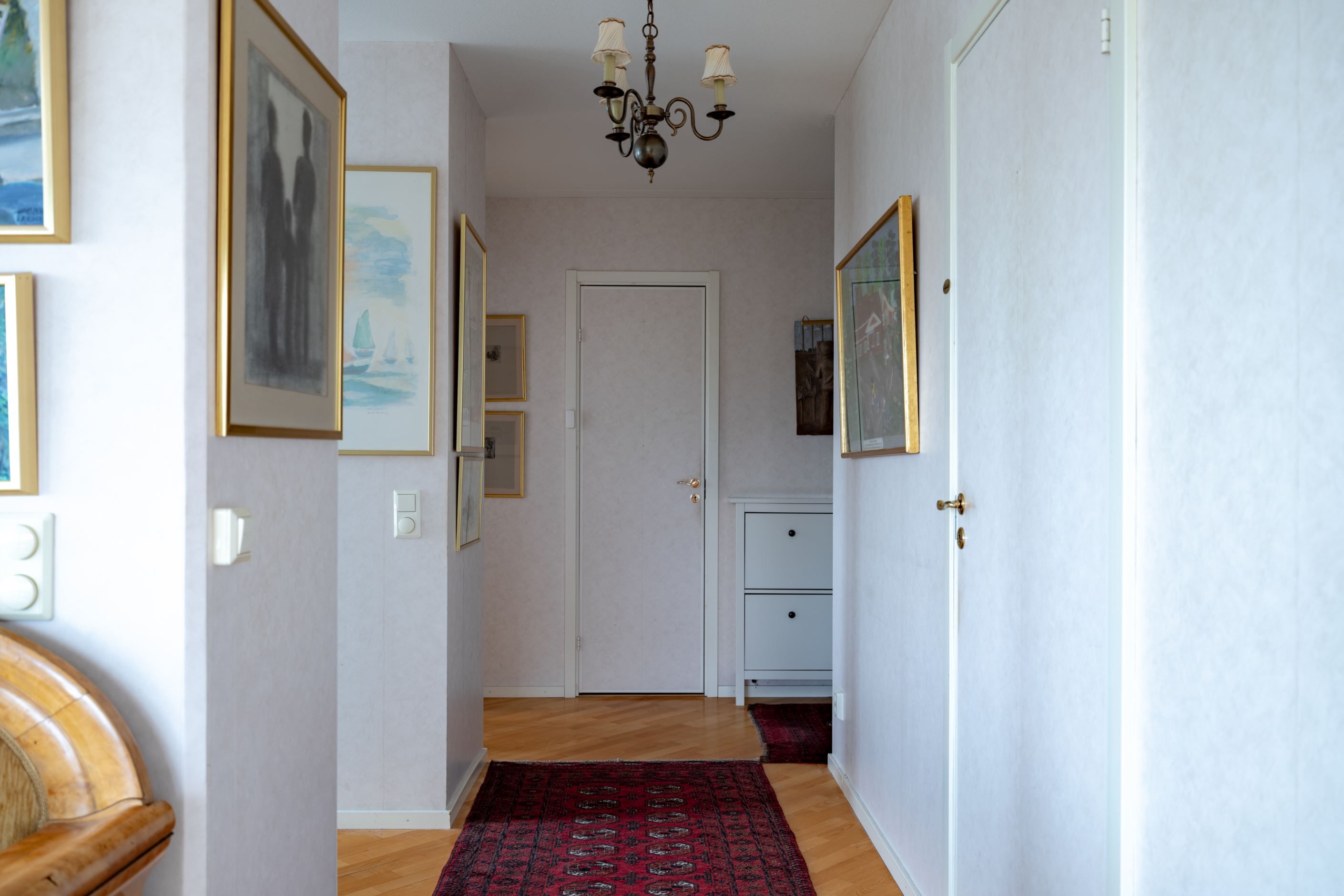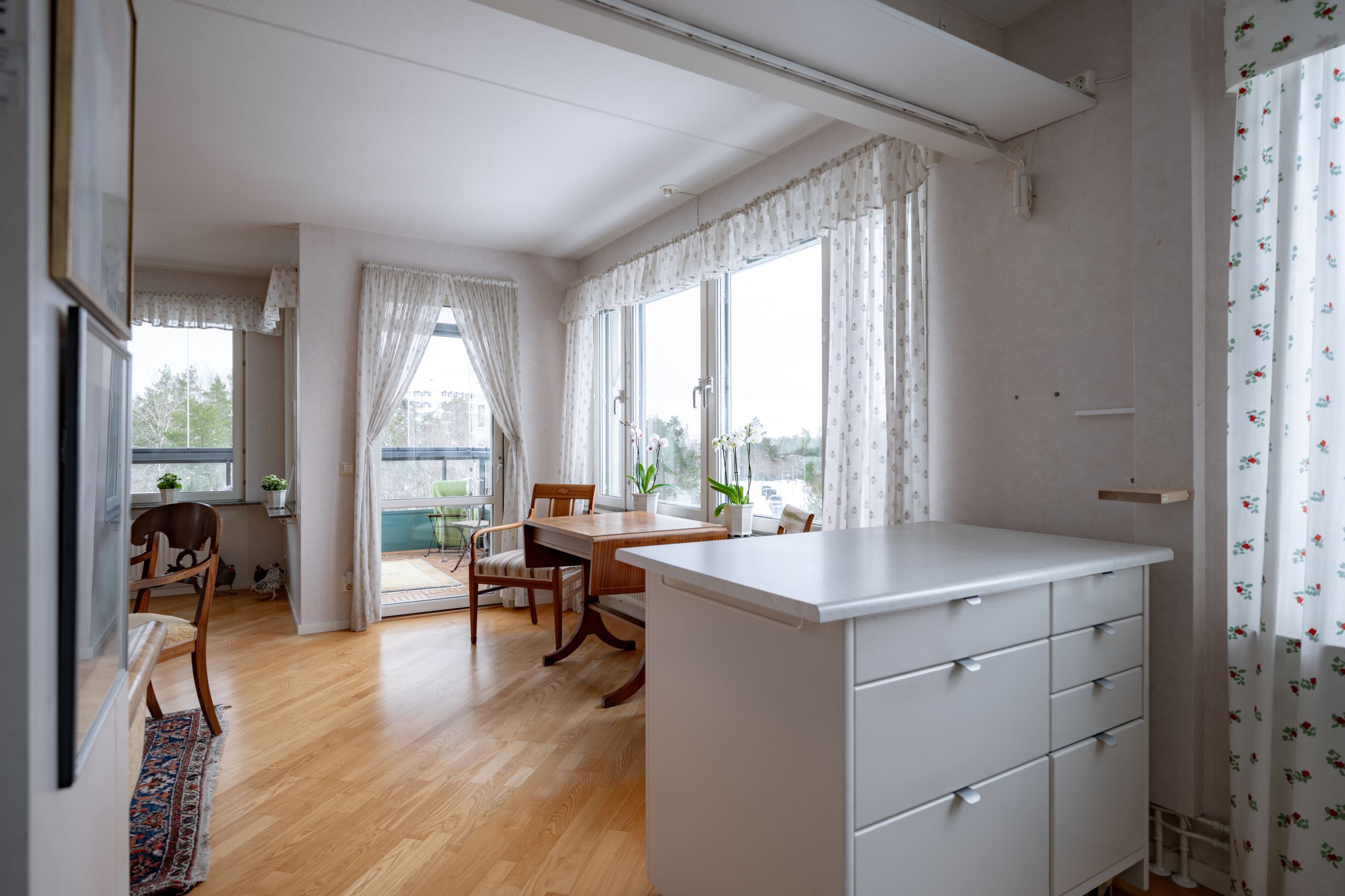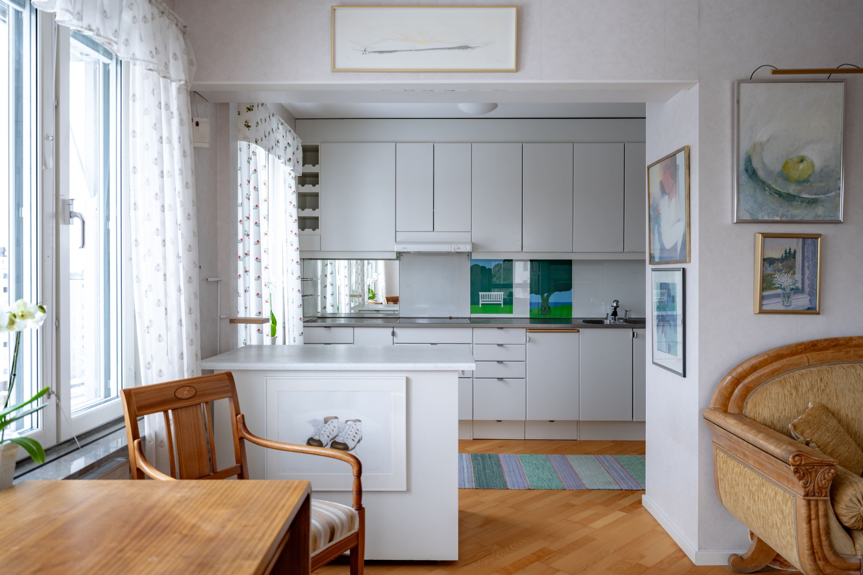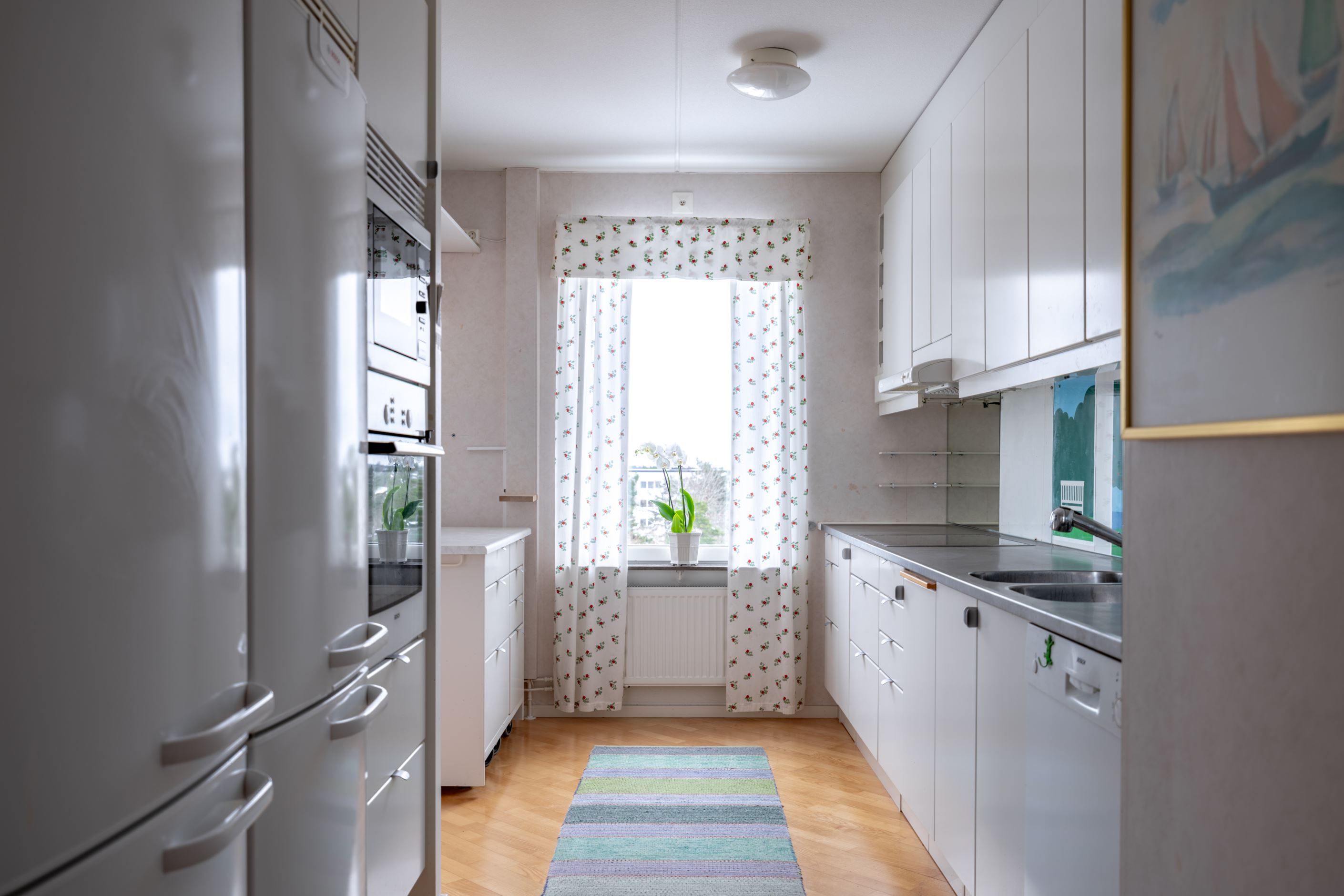 Bostadens hjärta är den öppna planlösningen mellan kök och vardagsrum – en social och inbjudande yta där familj och vänner gärna samlas. Det moderna köket har gott om förvaring och arbetsyta samt plats för ett stort matbord vid det generösa fönsterpartiet. Vardagsrummet är ljust och luftigt med utgång till den inglasade balkongen som förlänger säsongen och fungerar som ett extra rum större delen av året. Här njuter du av solen och den fria utsikten som ger en påtaglig känsla av lugn och avskildhet.