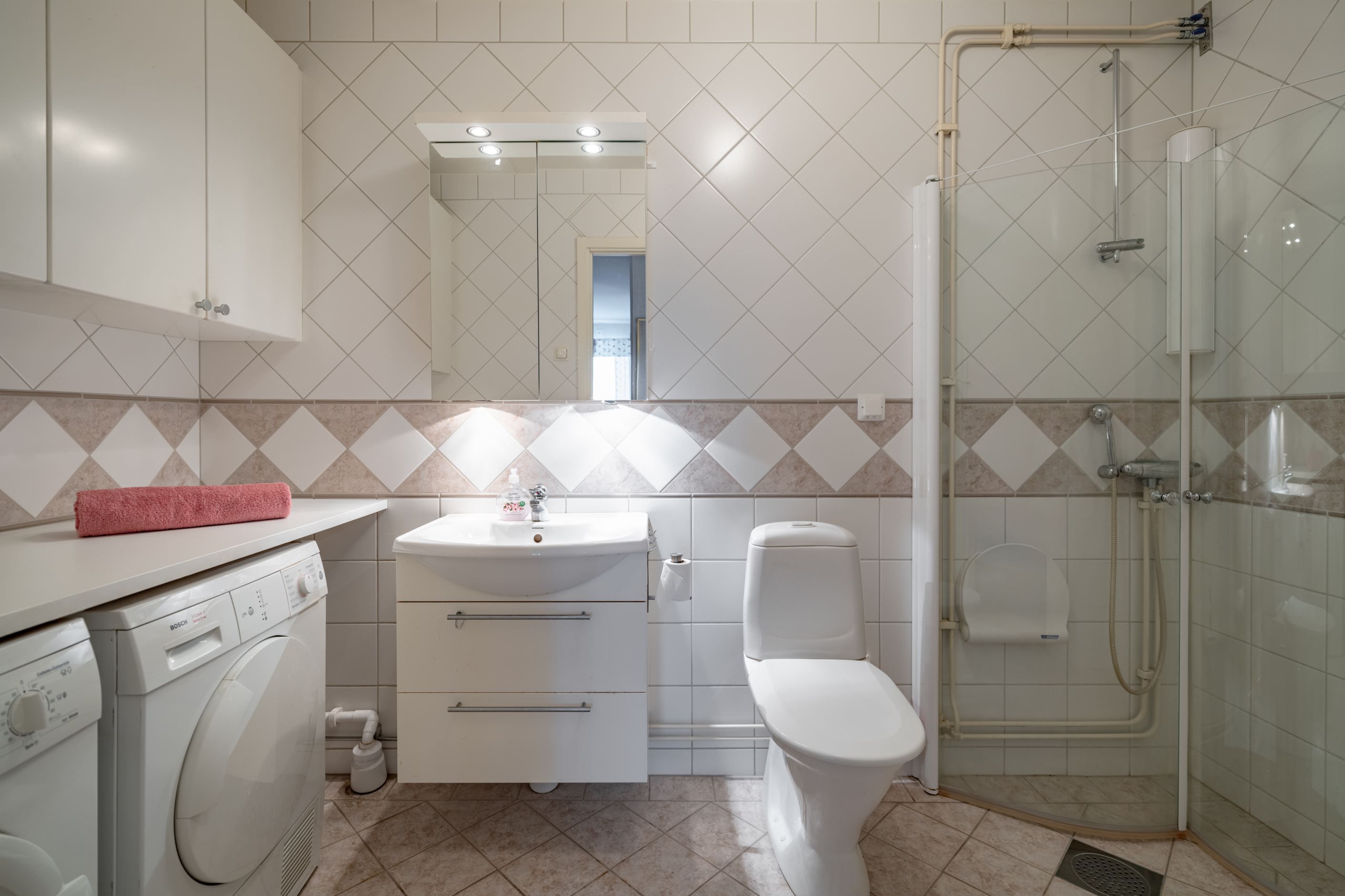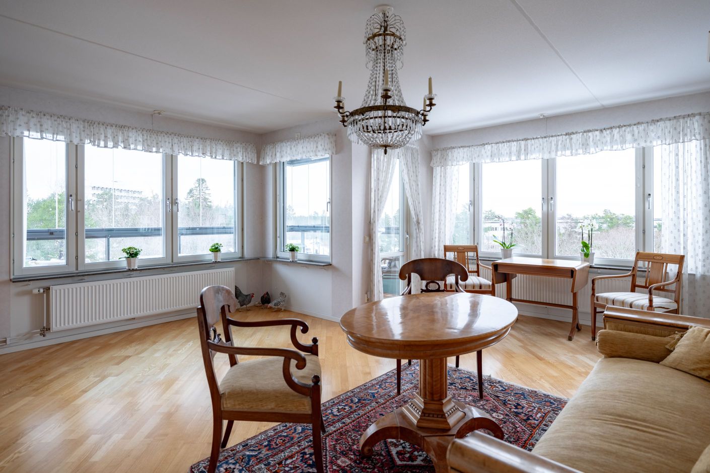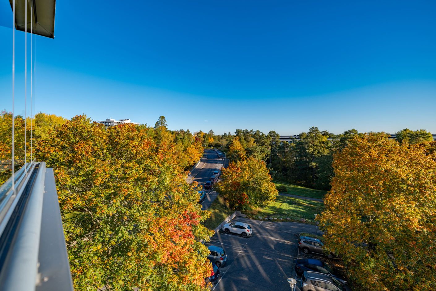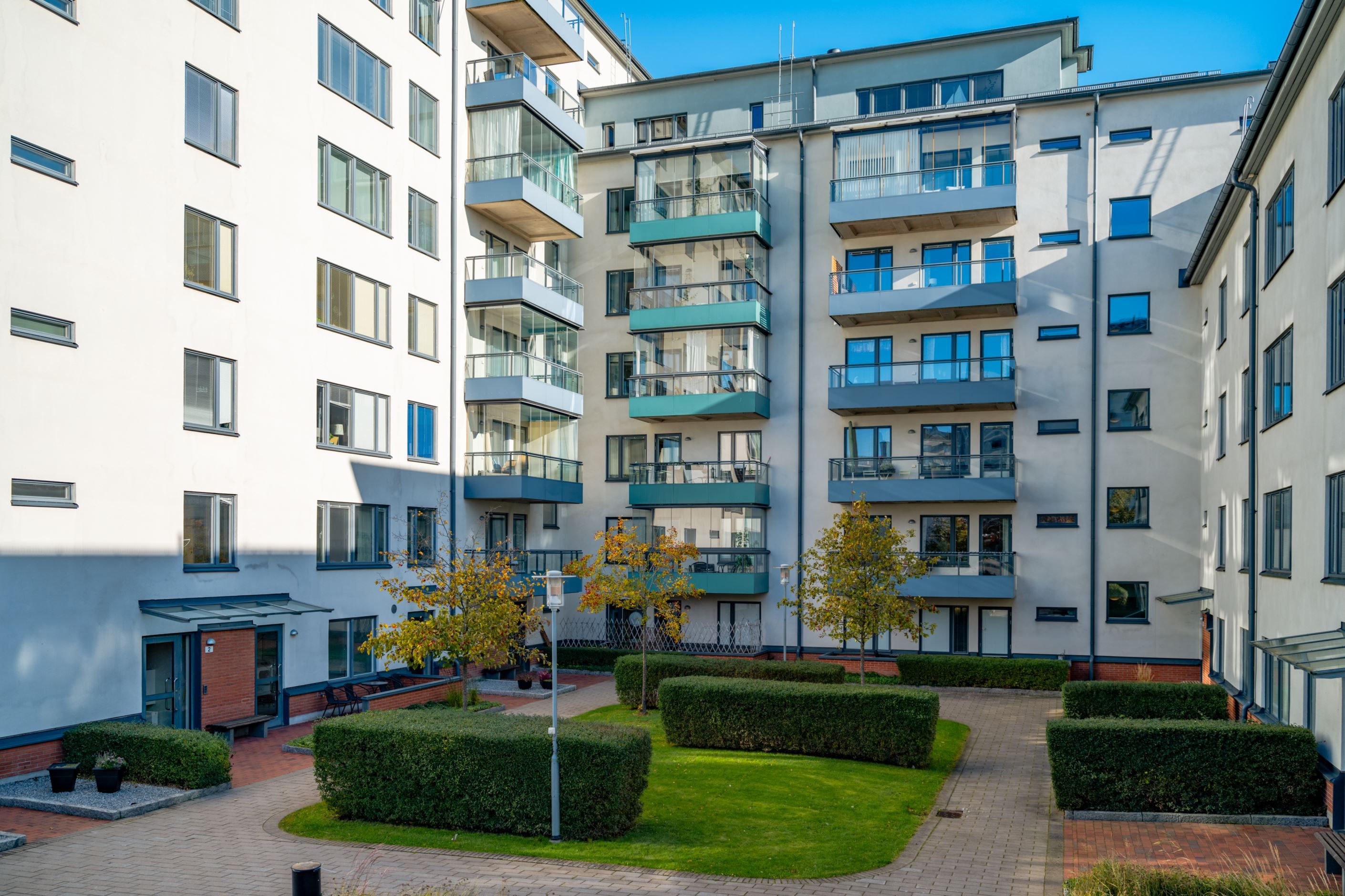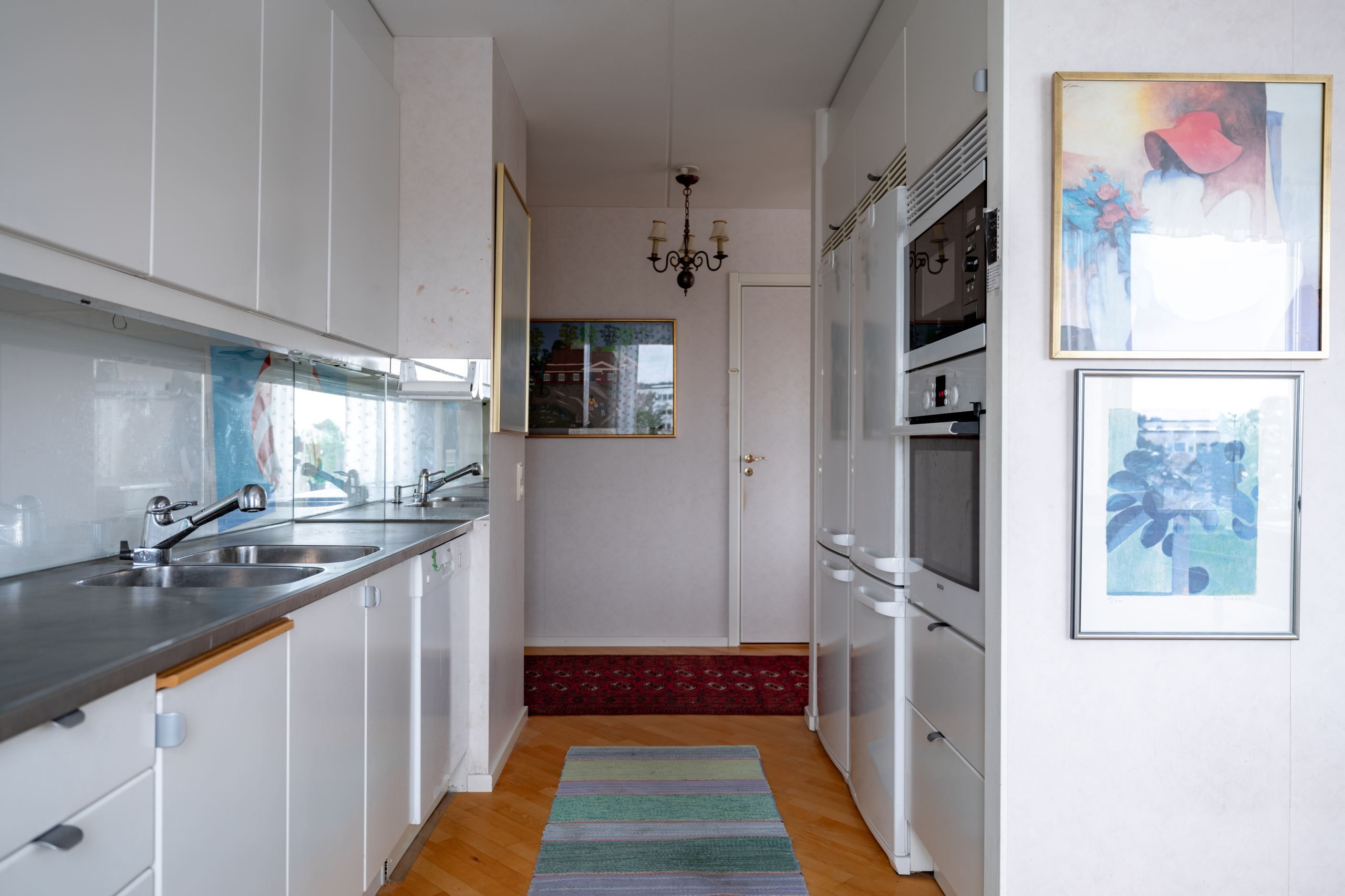 Bostadens hjärta är den öppna planlösningen mellan kök och vardagsrum – en social och inbjudande yta där familj och vänner gärna samlas. Det moderna köket har gott om förvaring och arbetsyta samt plats för ett stort matbord vid det generösa fönsterpartiet. Vardagsrummet är ljust och luftigt med utgång till den inglasade balkongen som förlänger säsongen och fungerar som ett extra rum större delen av året. Här njuter du av solen och den fria utsikten som ger en påtaglig känsla av lugn och avskildhet.