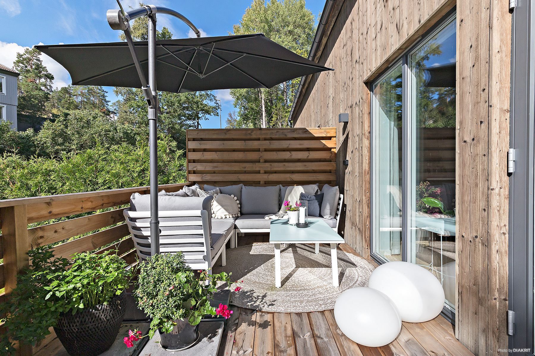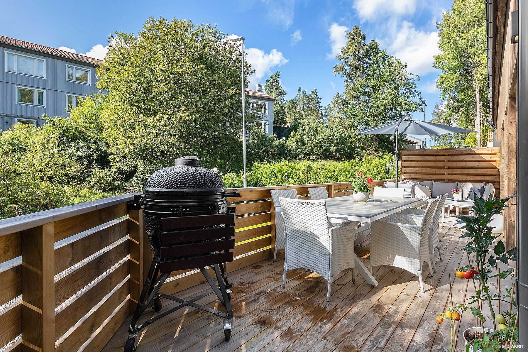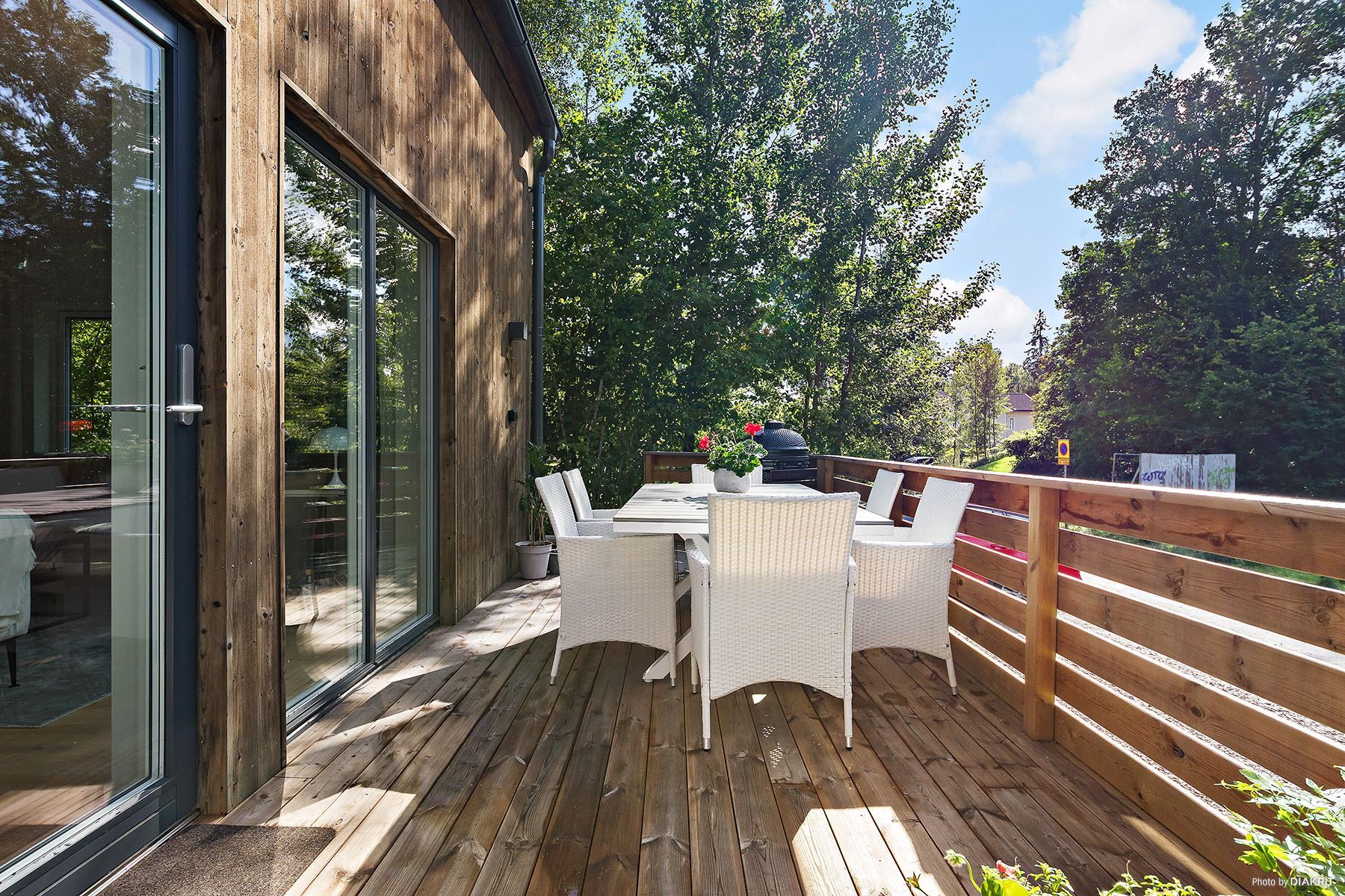 Från de öppna sociala ytorna på entrévåning finns utgång till husets rymliga terrass/uteplats belägen i öppet sydvästläge med solchans under många av dygnets timmar.