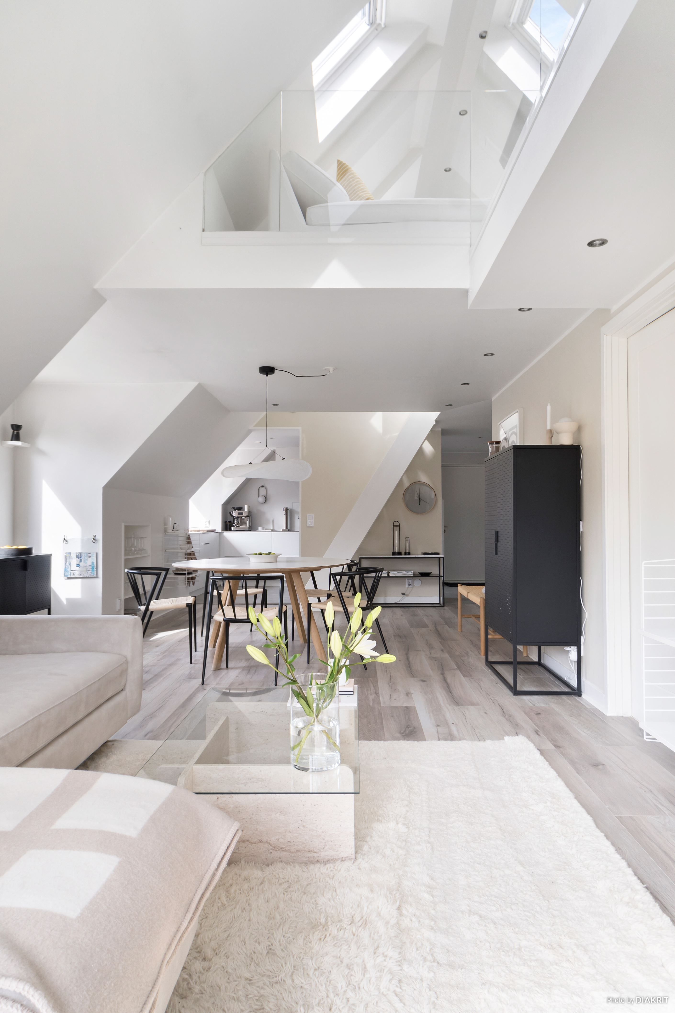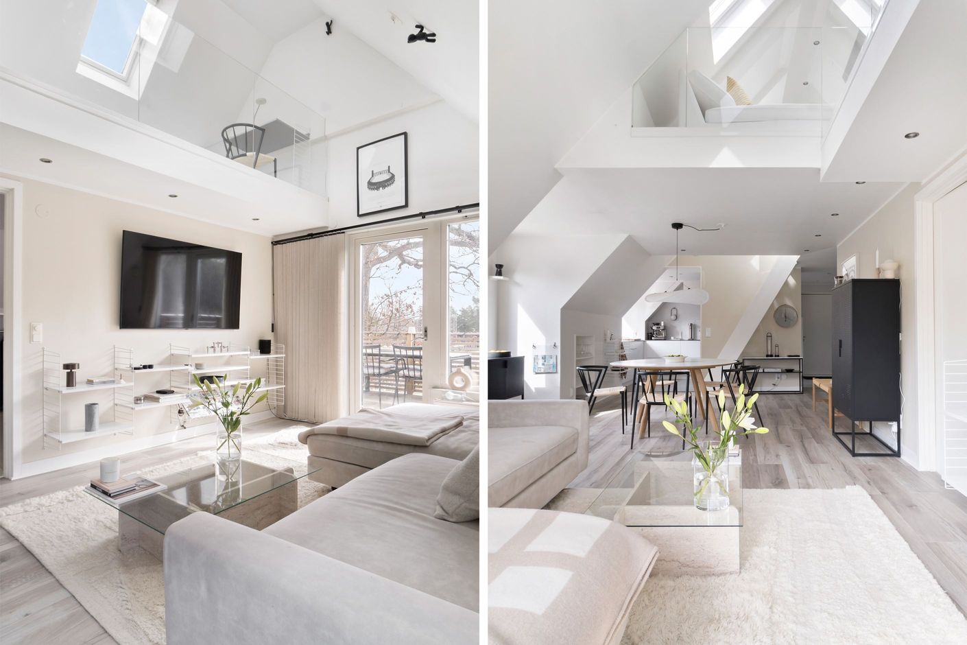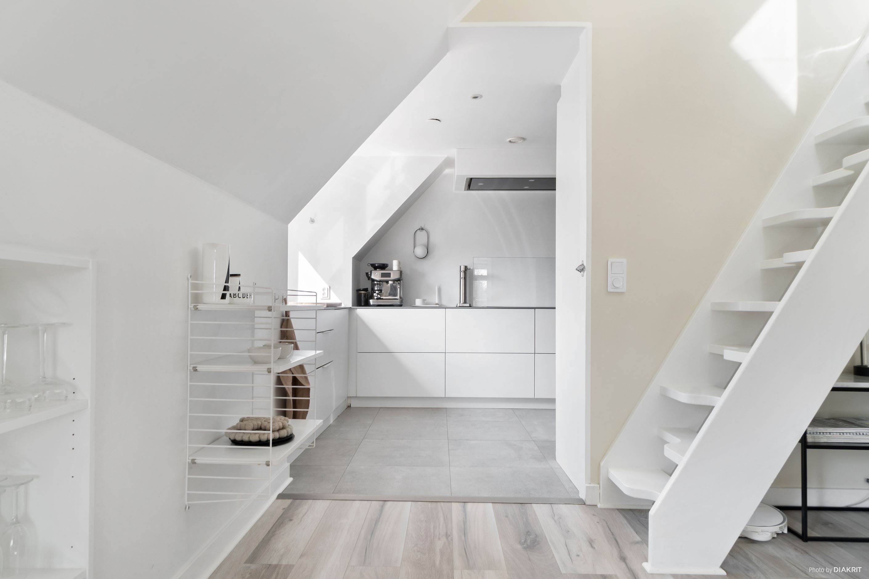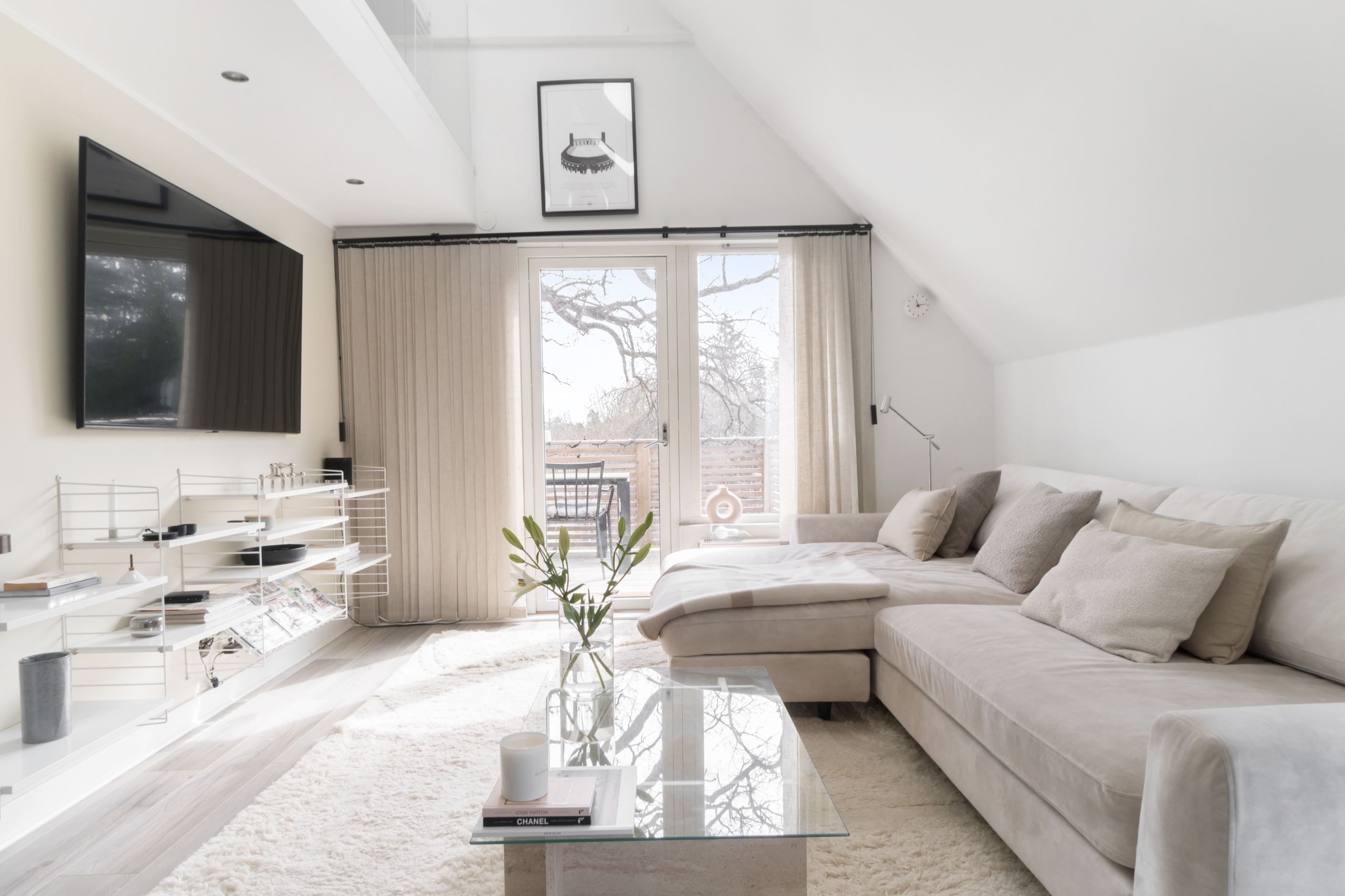 Nu finns ett sällsynt tillfälle att förvärva en exklusiv och smakfullt renoverad vindsvåning i etage i attraktiva Tyresö Strand. Här erbjuds ett boende med imponerande takhöjd upp i nock, genomgående eleganta materialval och en planlösning som kombinerar rymd med funktion. Bostaden är inflyttningsklar och präglas av ljusa, harmoniska färger, utvalda fondväggar och infälld belysning som skapar en modern och trivsam atmosfär. Det stilrena badrummet går i hotellinspirerad design med dämpade toner i svart och grått, medan köket från Kvick erbjuder generösa arbetsytor i granitkeramik, gott om förvaring, integrerade vitvaror samt en extra bred induktionshäll – perfekt för den matlagningsintresserade. Lägenhetens råvind har öppnats och inretts varpå ett andra våningsplan har skapats!