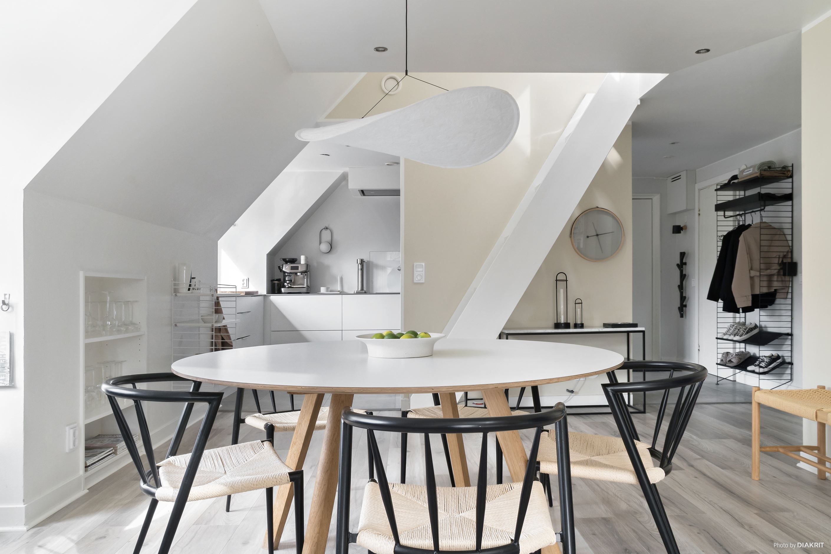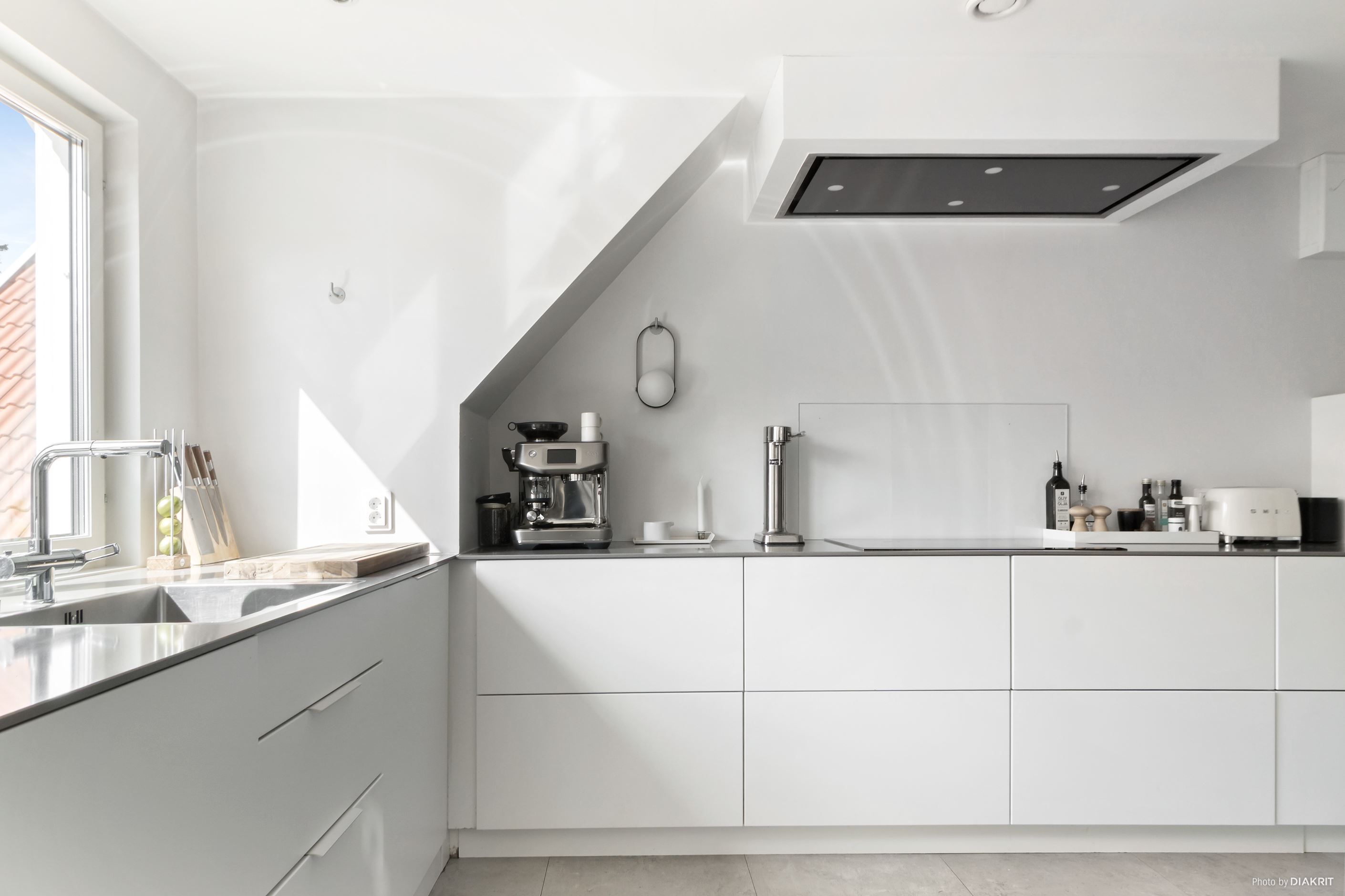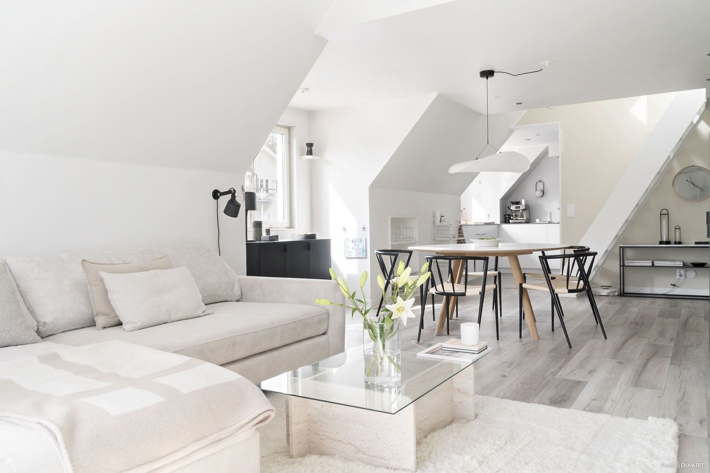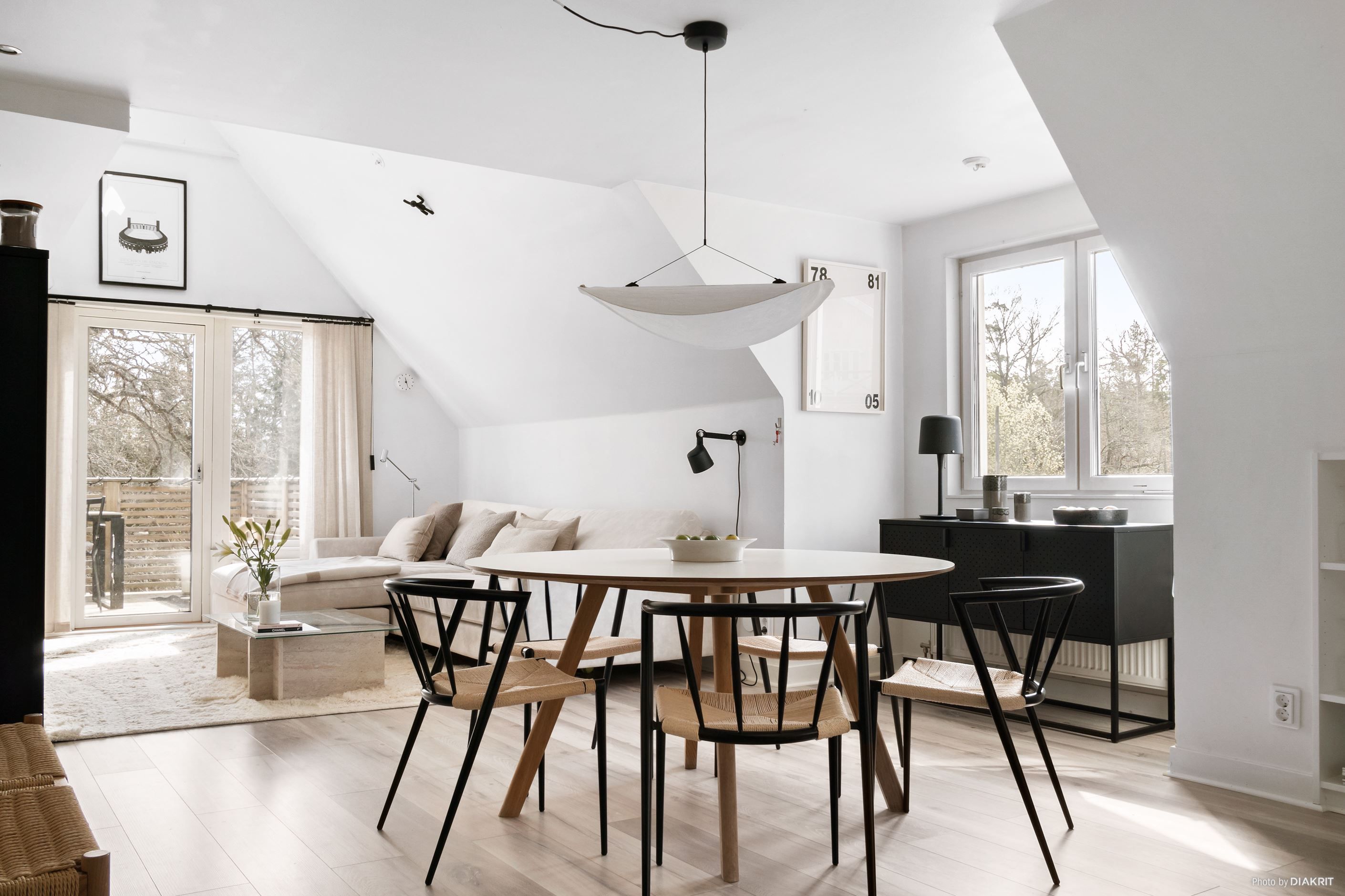 Nu finns ett sällsynt tillfälle att förvärva en exklusiv och smakfullt renoverad vindsvåning i etage i attraktiva Tyresö Strand. Här erbjuds ett boende med imponerande takhöjd upp i nock, genomgående eleganta materialval och en planlösning som kombinerar rymd med funktion. Bostaden är inflyttningsklar och präglas av ljusa, harmoniska färger, utvalda fondväggar och infälld belysning som skapar en modern och trivsam atmosfär. Det stilrena badrummet går i hotellinspirerad design med dämpade toner i svart och grått, medan köket från Kvick erbjuder generösa arbetsytor i granitkeramik, gott om förvaring, integrerade vitvaror samt en extra bred induktionshäll – perfekt för den matlagningsintresserade. Lägenhetens råvind har öppnats och inretts varpå ett andra våningsplan har skapats!
