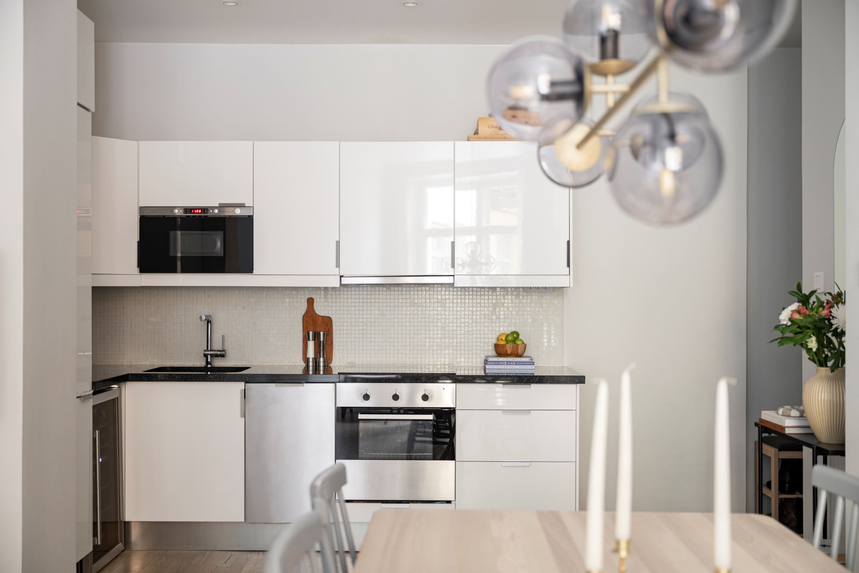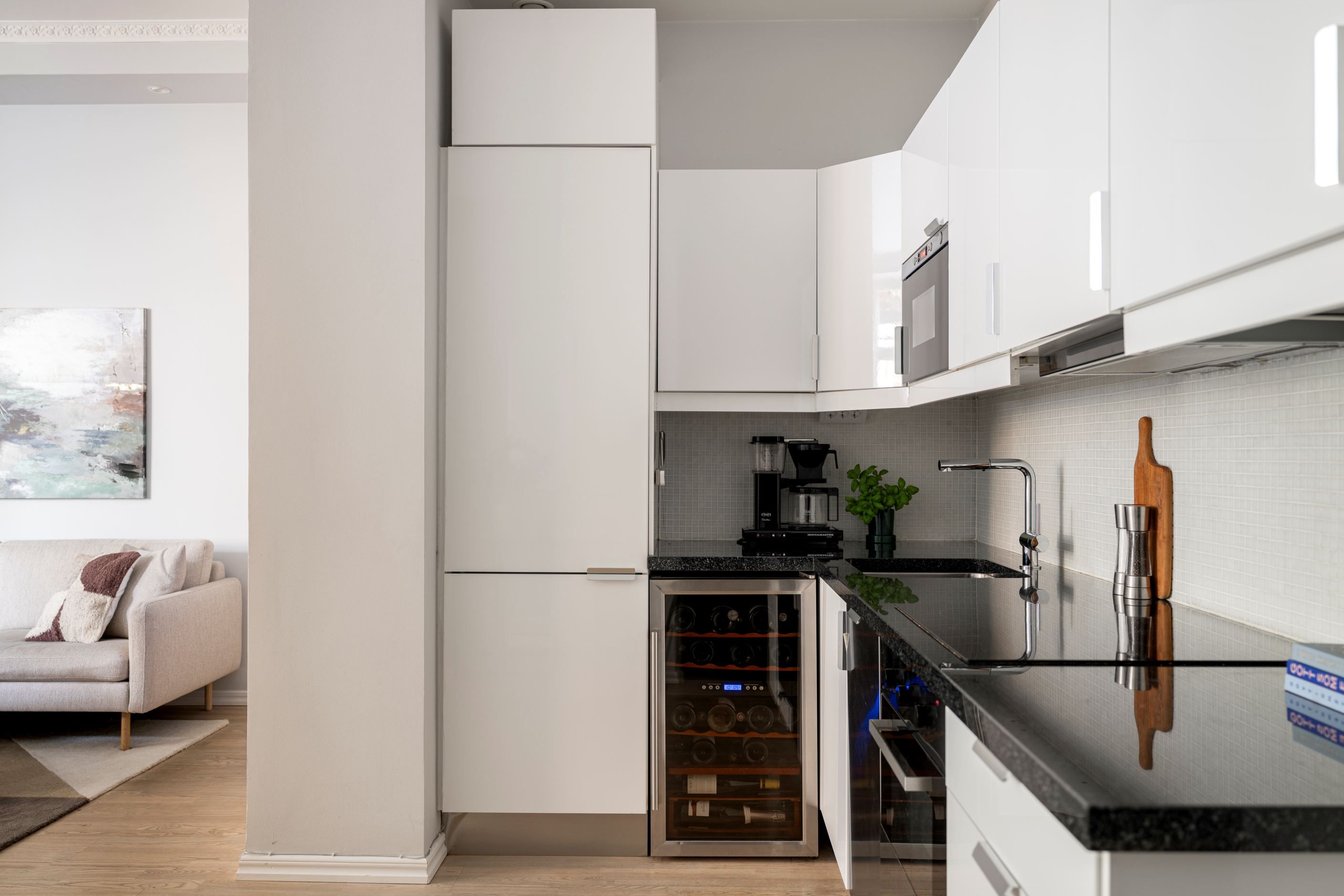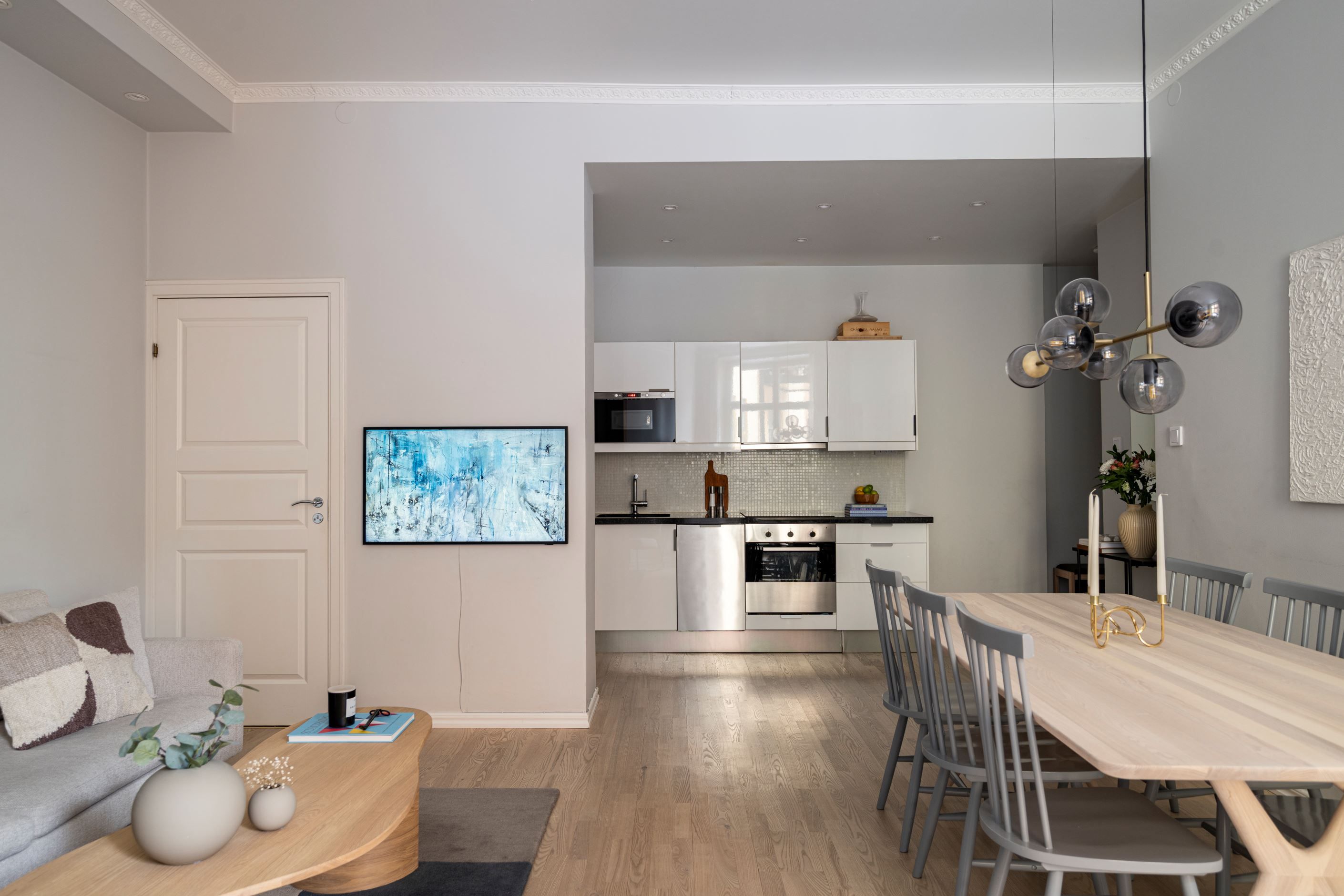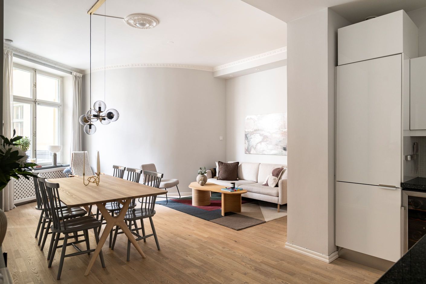 Lägenheten präglas av vackra originalattribut såsom generös takhöjd, fina golv och stora fönsterpartier som vetter mot en lugn och grönskande innergård och skapar ett fantastiskt ljus. Den genomtänkta planlösningen erbjuder öppna och sociala ytor mellan kök och vardagsrum – en perfekt miljö för både vardag och fest. Det stilrena köket är fullt utrustat med moderna vitvaror, inklusive diskmaskin och vinkyl, och bjuder in till matlagning och umgänge.