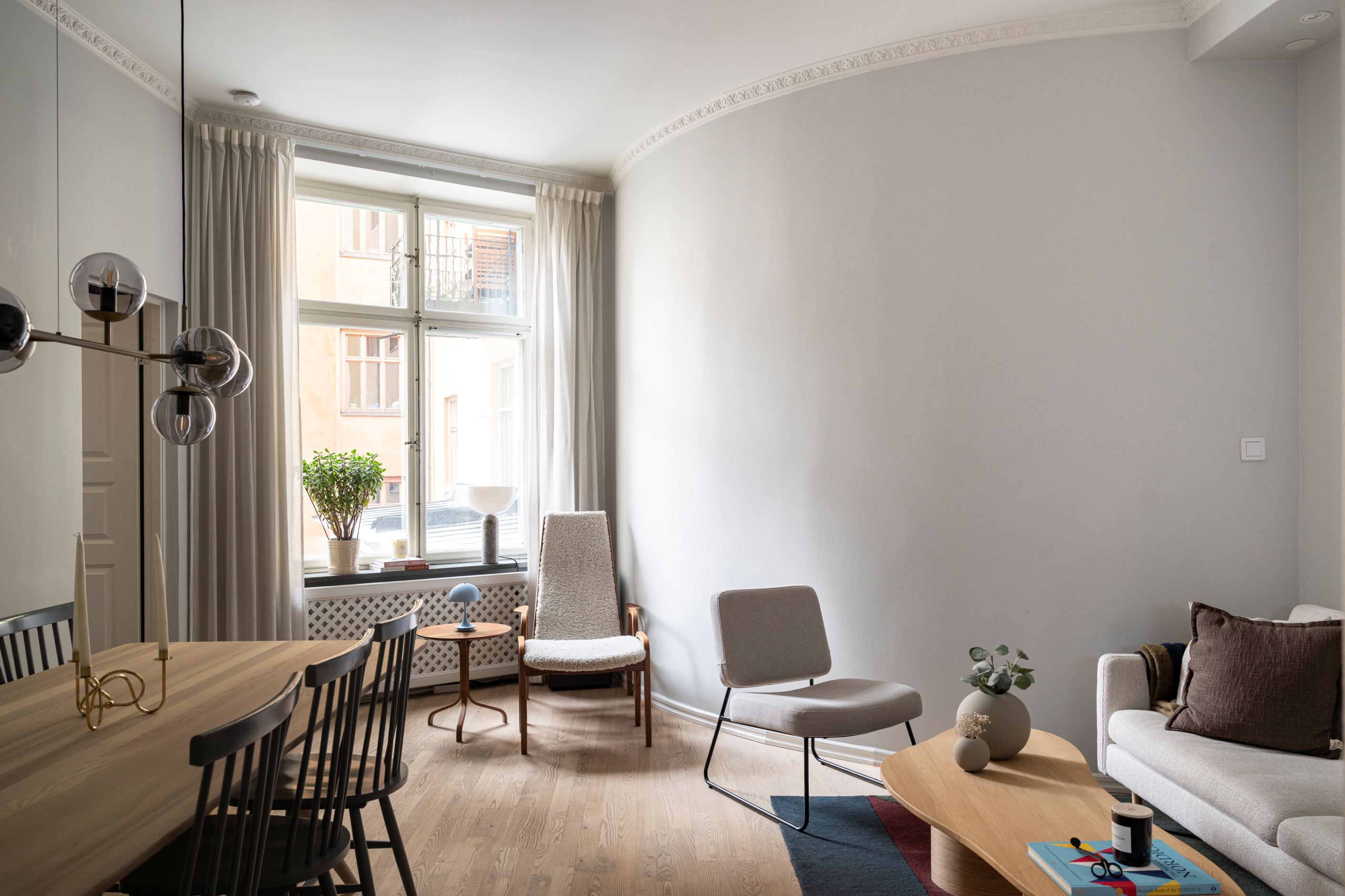 Sekelskiftestvåa med vackra attribut och stilren inredning - Fönster högt belägna mot rofylld gård - Social och öppen planlösning - Walk-in-closet - Brf med låg skuldsättning och som äger marken