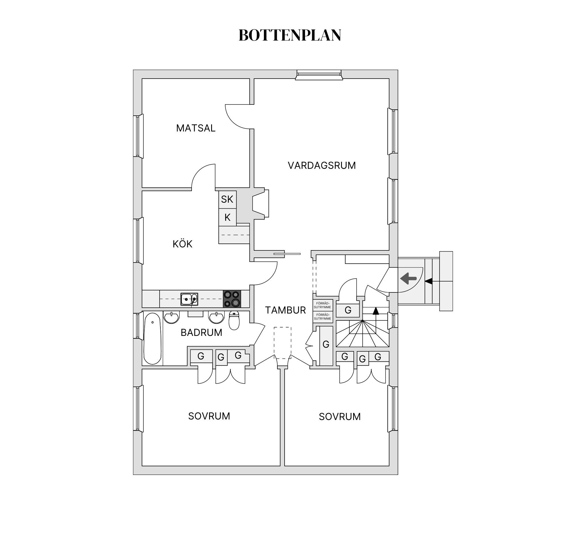Entréplanet bjuder på en välkomnande och ljus atmosfär med en generös takhöjd på cirka 2,5 meter. Här finner du ett trivsamt vardagsrum med eldstad, en inbjudande matsal som leder vidare till köket, ett badrum samt två sovrum. Dessutom finns praktiskt förrådsutrymme som underlättar vardagen.
