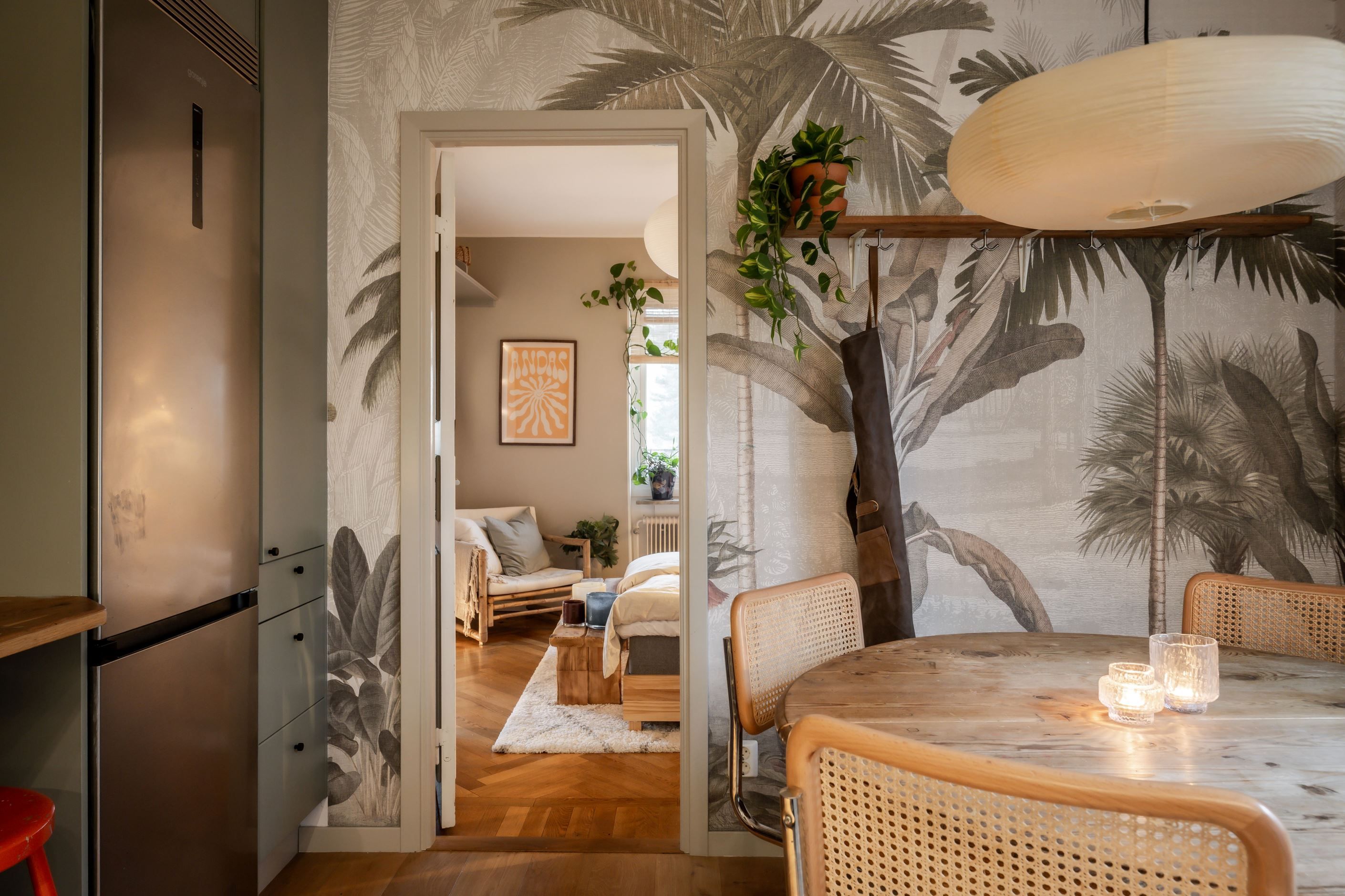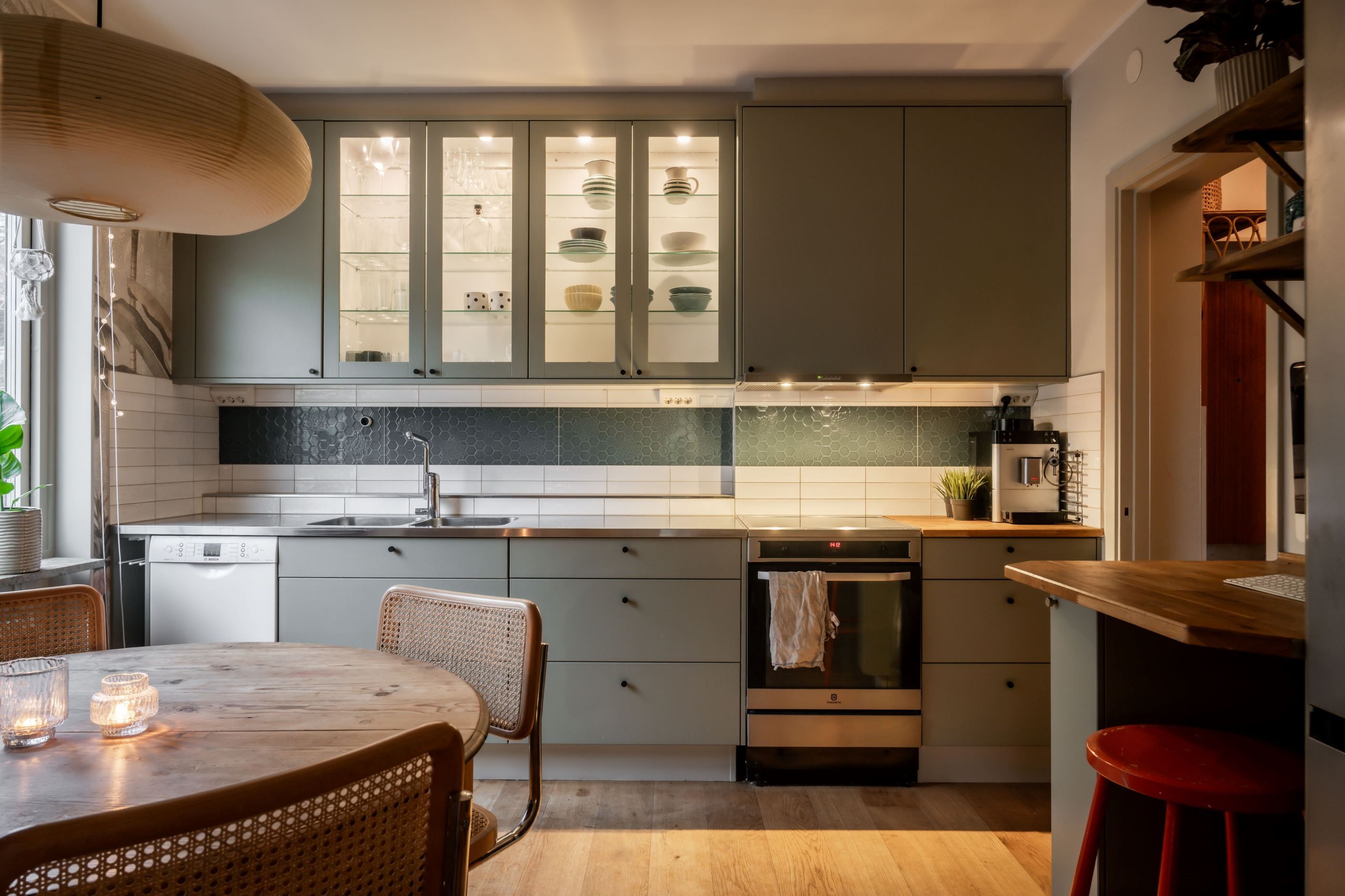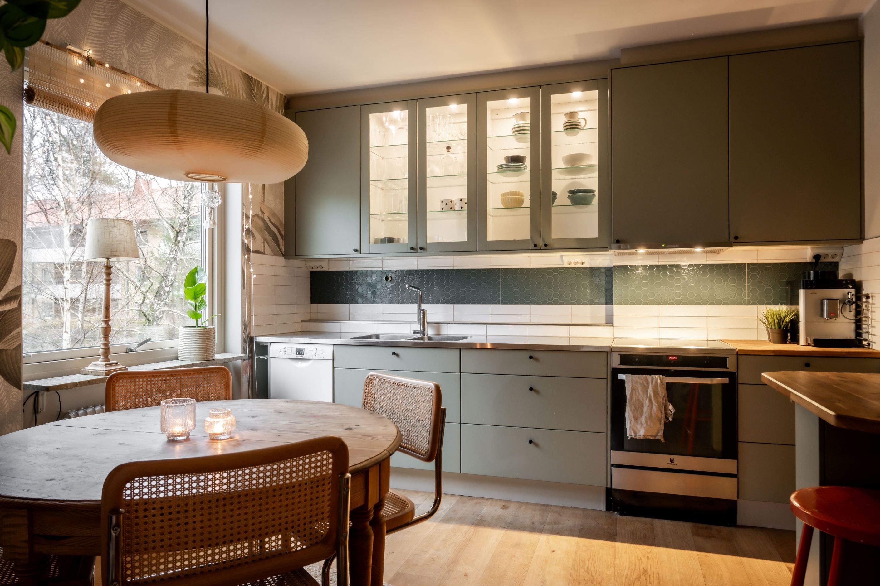 Köket är renoverat från grunden 2018 och utformat för både vardagsmatlagning och större middagar. Köksluckorna har målats om under senare år och kompletteras av utbytta knoppar, vilket ger köket ett uppdaterat helhetsintryck. Tre sovrum ger goda möjligheter för såväl familj, arbete som gäster. Varje rum har generöst ljusinsläpp tack vare de stora fönstren.
