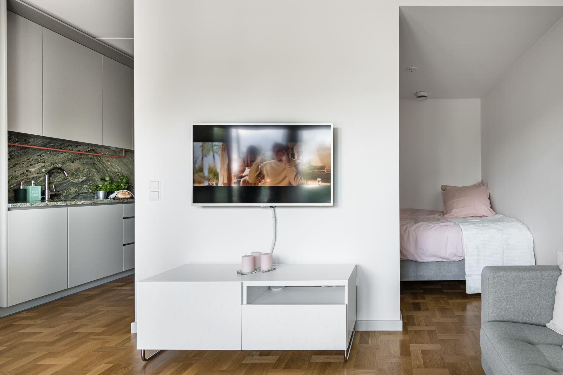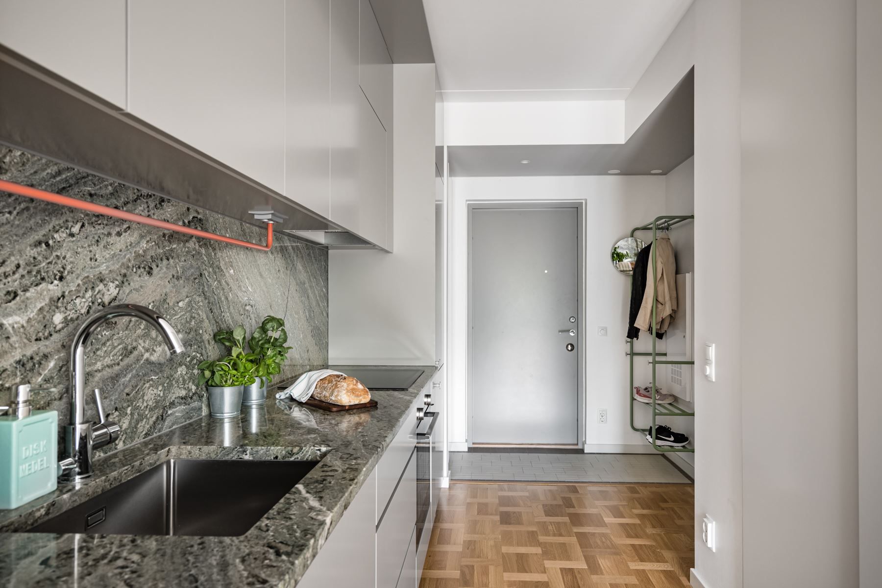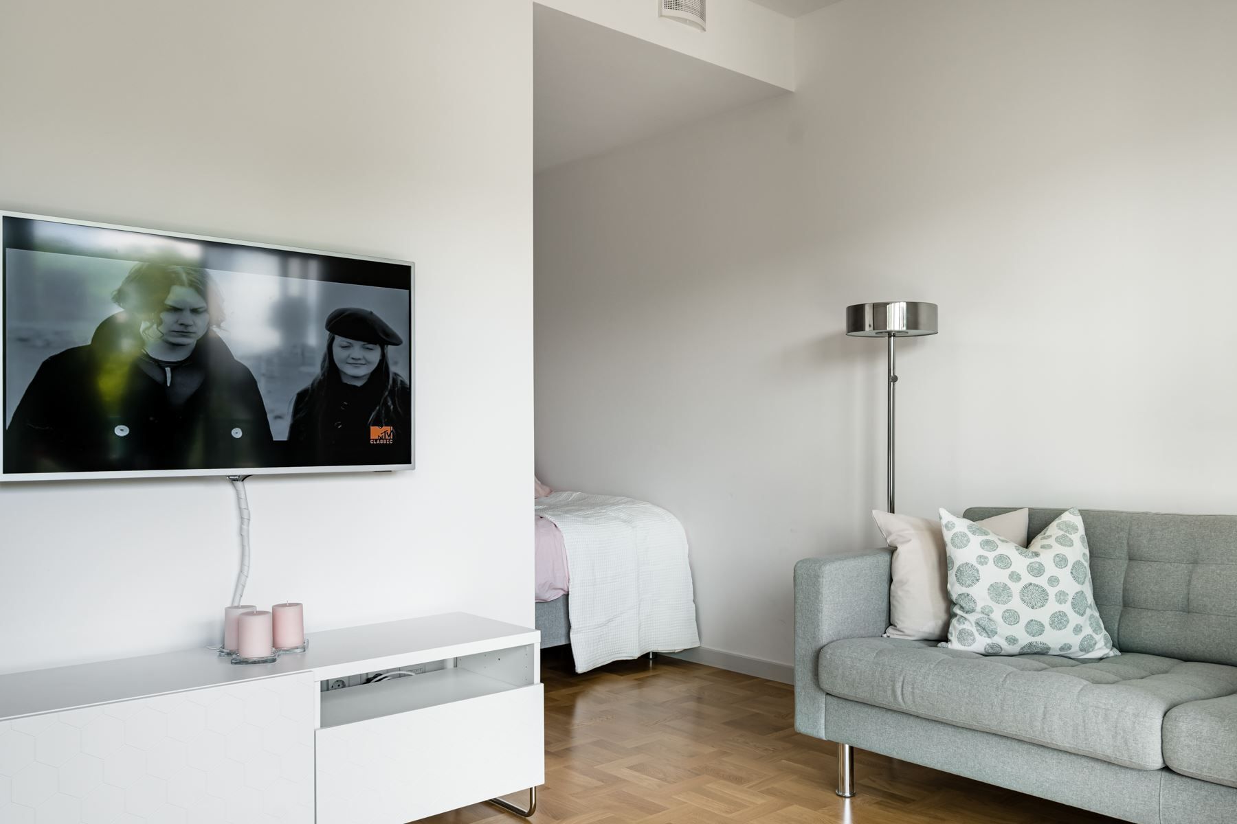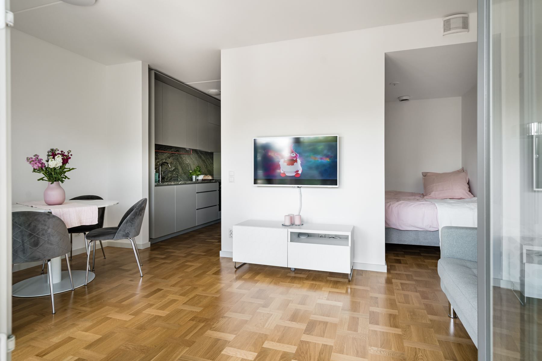 När det nya äntligen känns personligt! Planlösningen är maximerad och ingen kvadratmeter har här gått åt spillo. Genomgående fina materialval där äkta holländsk parkett möter hög takhöjd (ca 2.65 m) samt panoramafönster. Vardagsrum och kök i öppen social planlösning som rymmer matbord och soffgrupp invid tv-möblemang. Separat sovdel i anslutning.