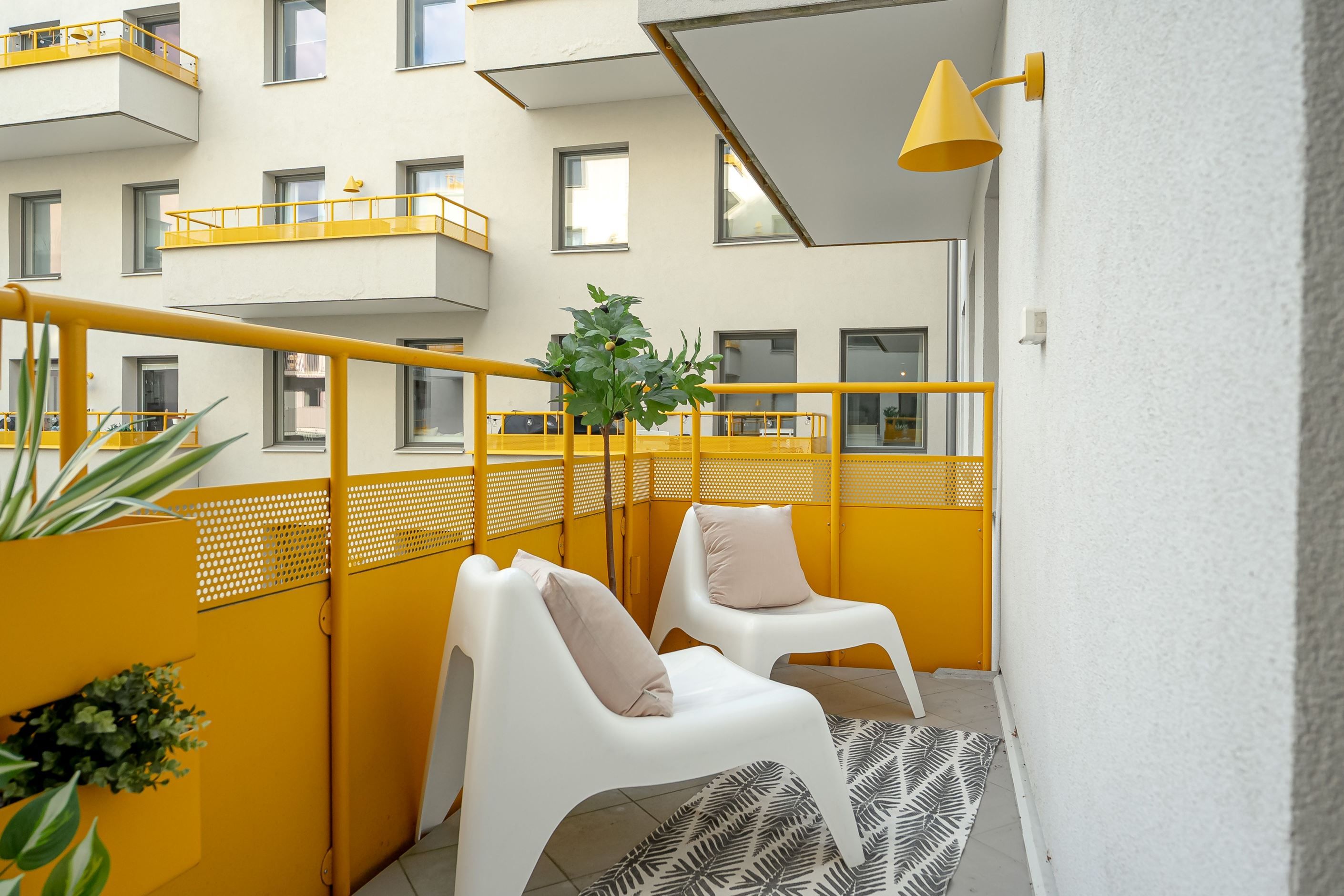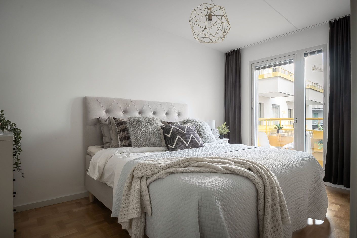 Sovrummet är rymligt med plats för dubbelsäng, förvaring och även en arbetsplats för hemmakontoret. Härifrån nås bostadens stora, möblerbara balkong. Perfekt för avkoppling och sociala stunder.