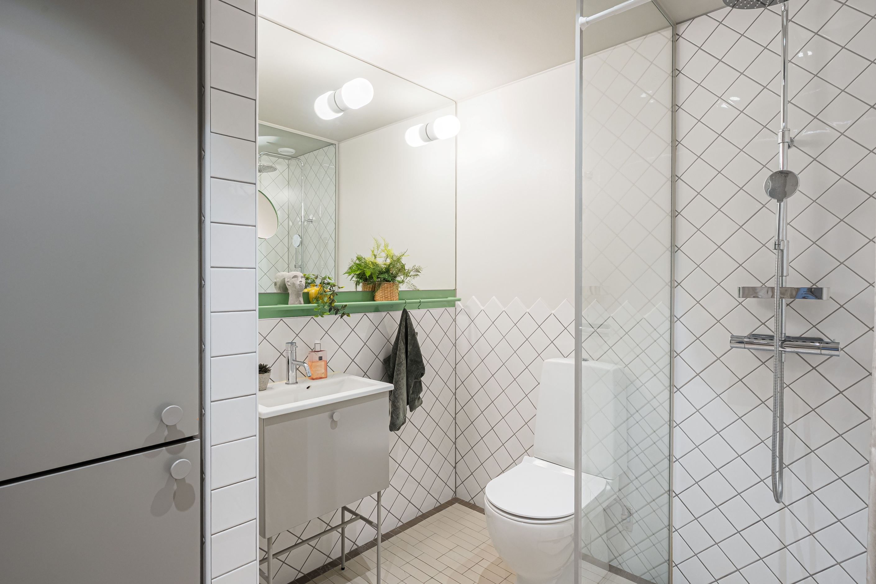 Det helkaklade badrummet är generöst tilltaget och utrustat med dusch, kommod och praktisk kombimaskin med tvätt- och torkfunktion.