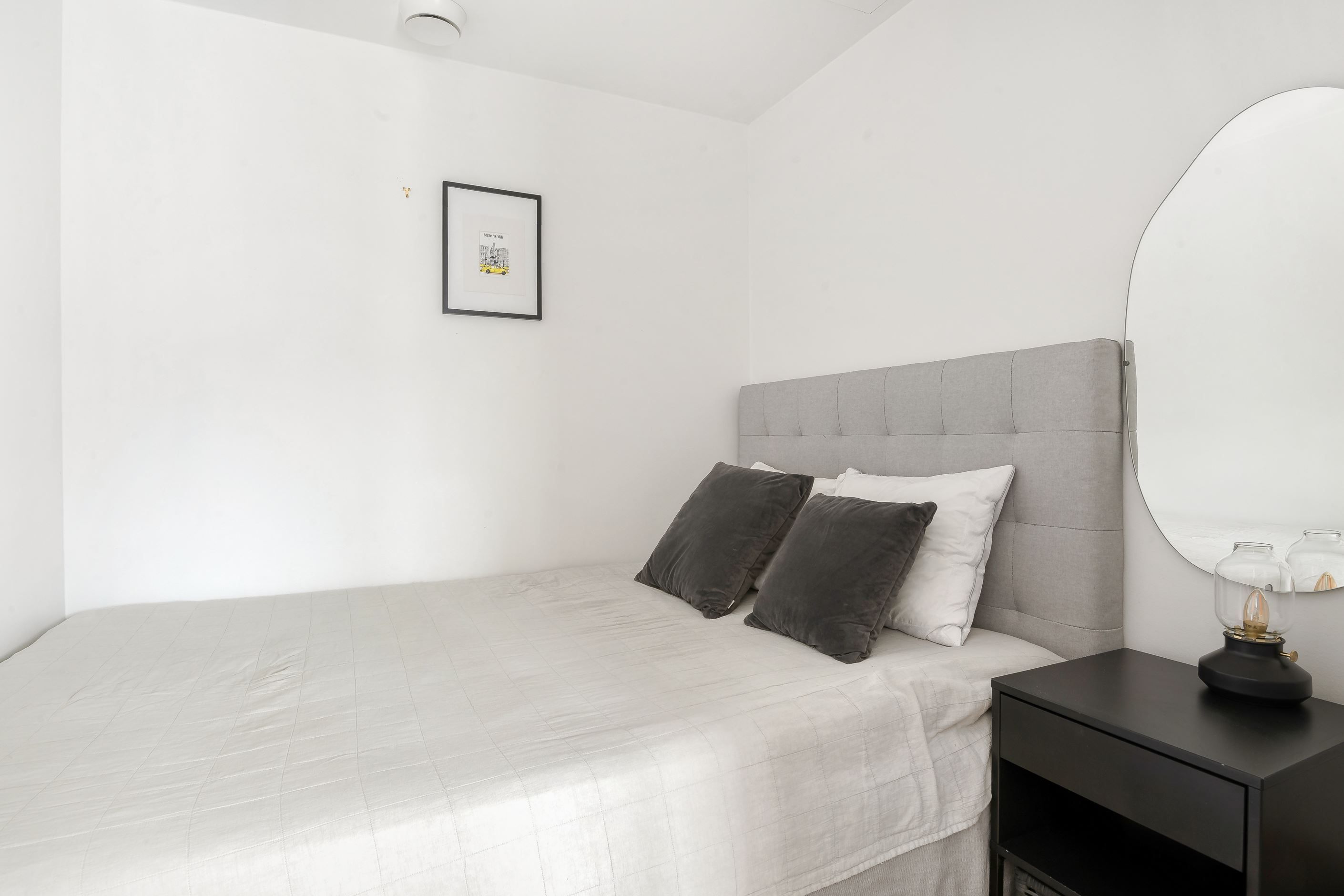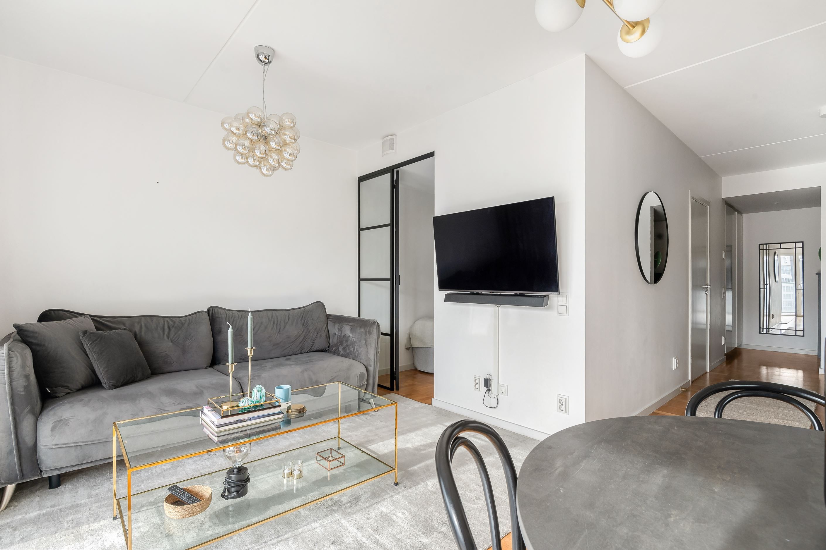 Planlösningen är väl genomtänkt och effektiv där varje kvadratmeter tas till vara. Köket ligger i öppen anslutning till vardagsrummet och bildar en naturlig social yta med plats för både matbord och en större soffgrupp. Intill finns en avskild sovdel som skapar en tydlig uppdelning mellan de sociala ytorna och den mer privata delen av bostaden.