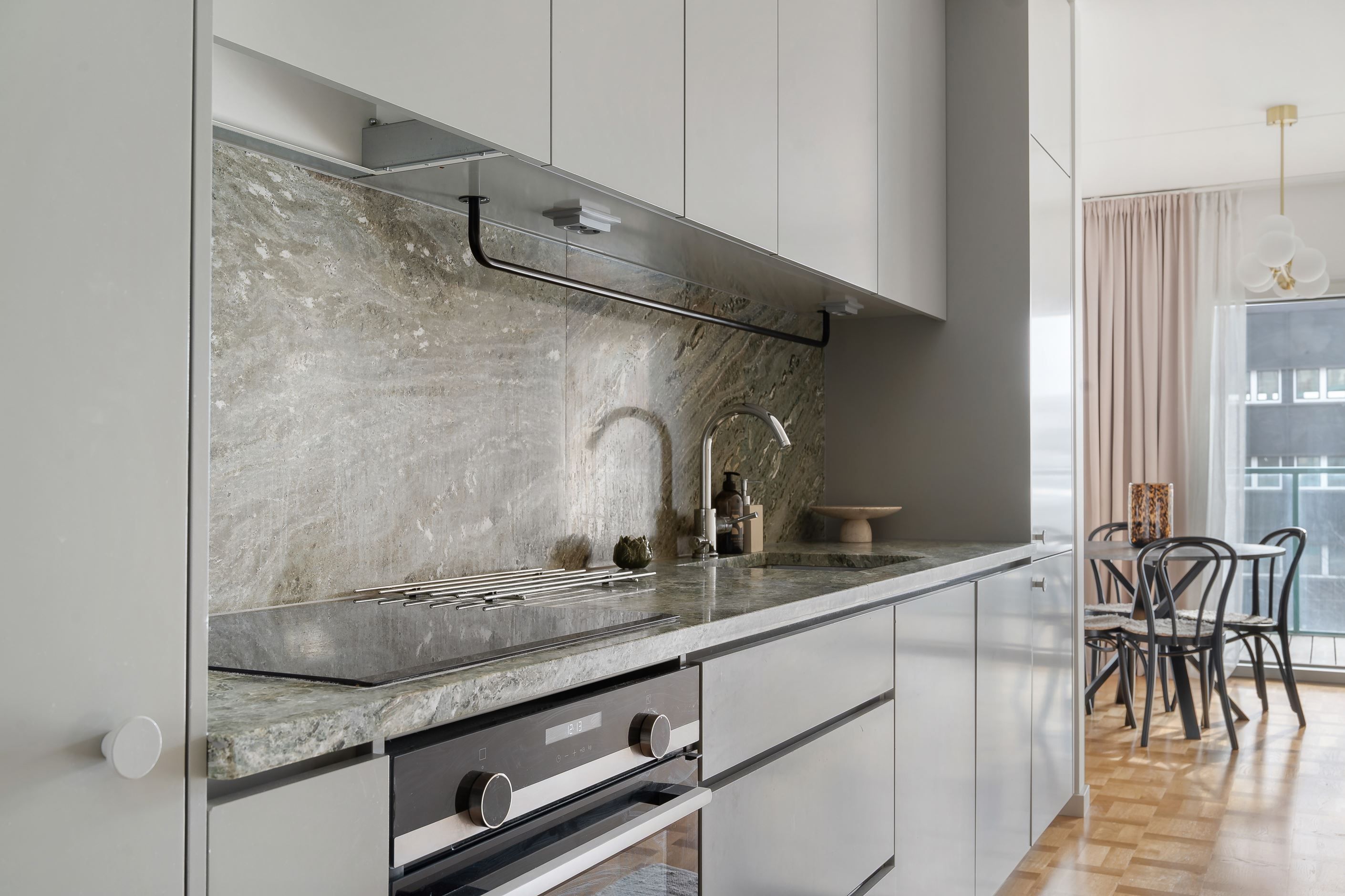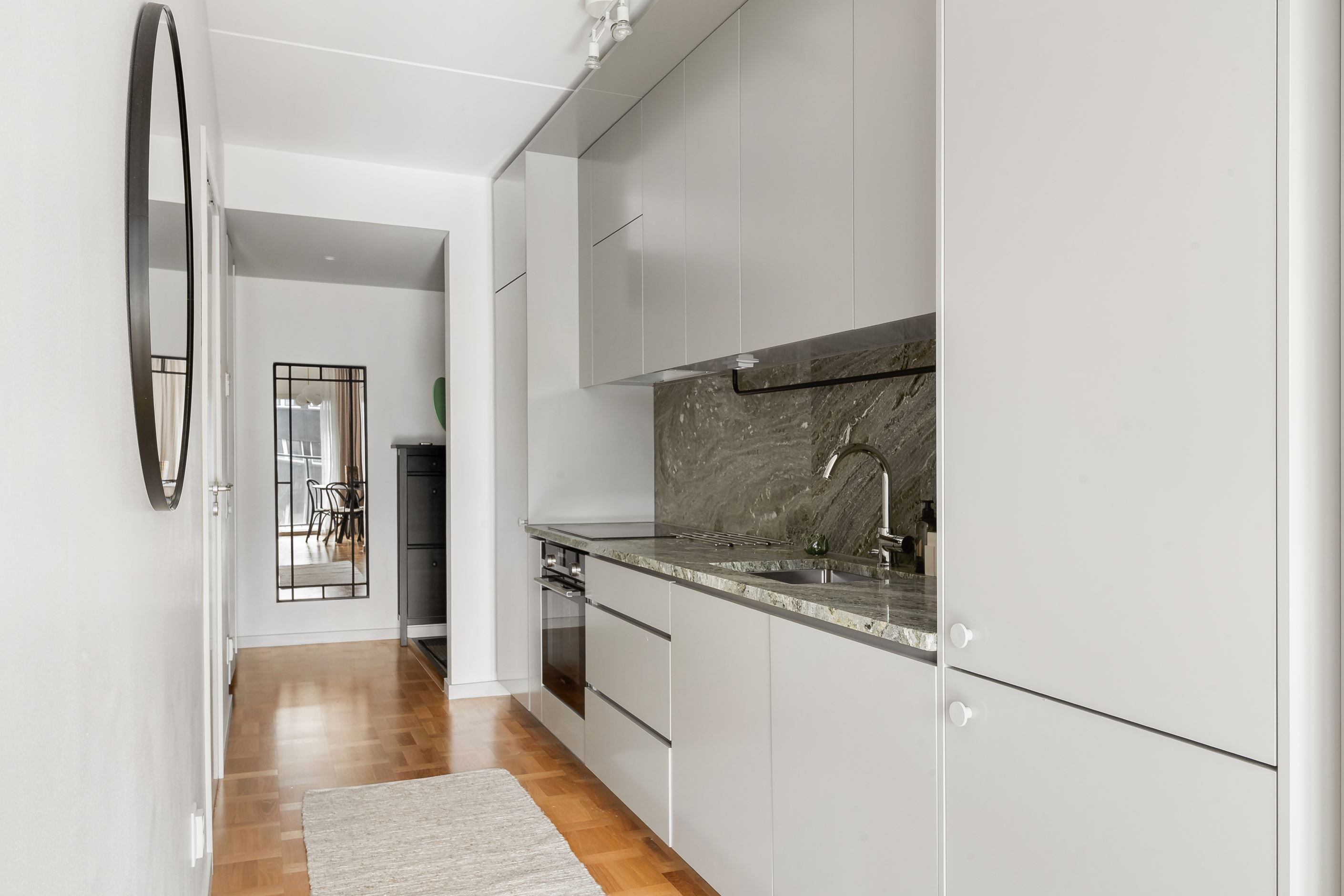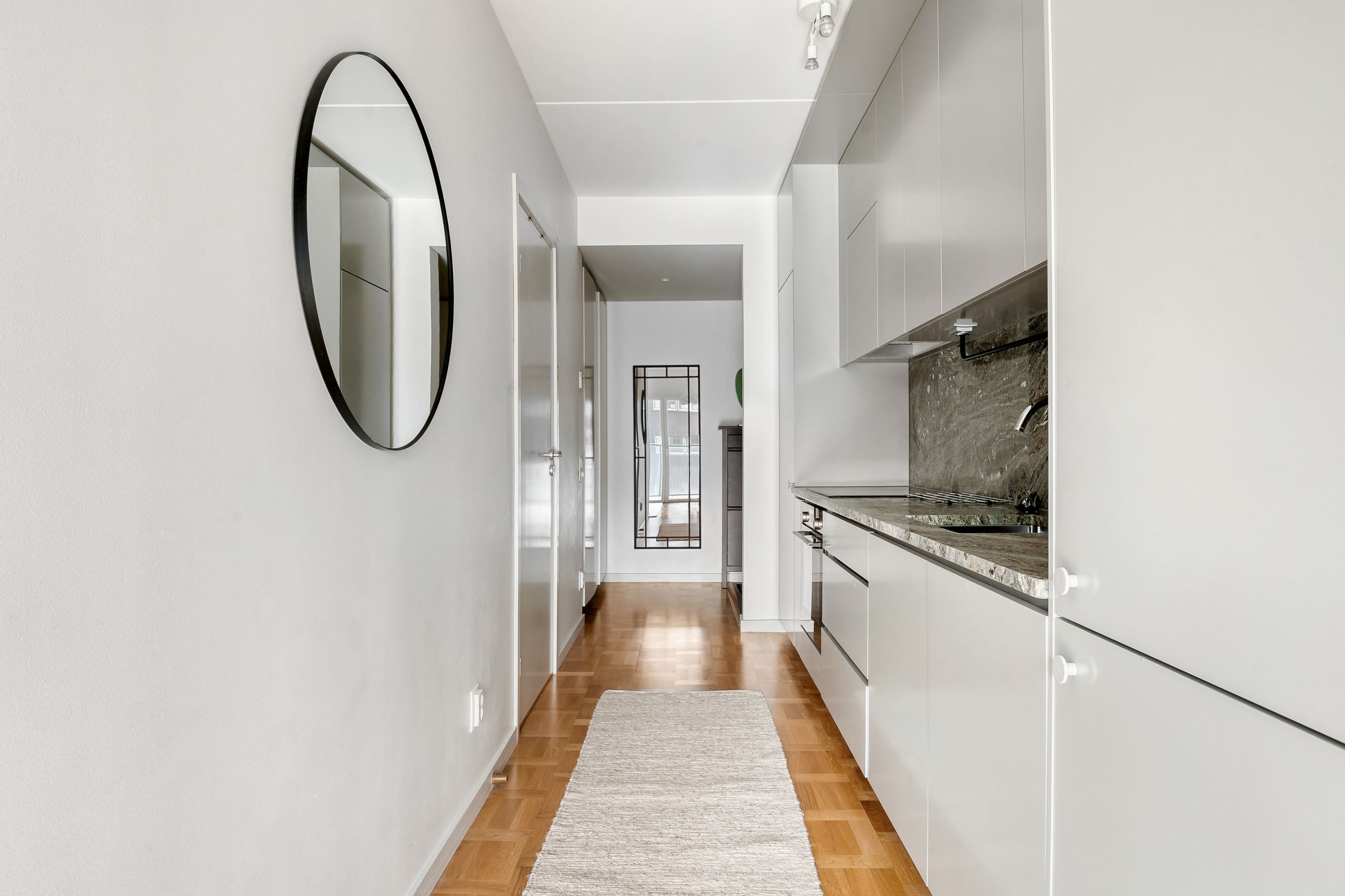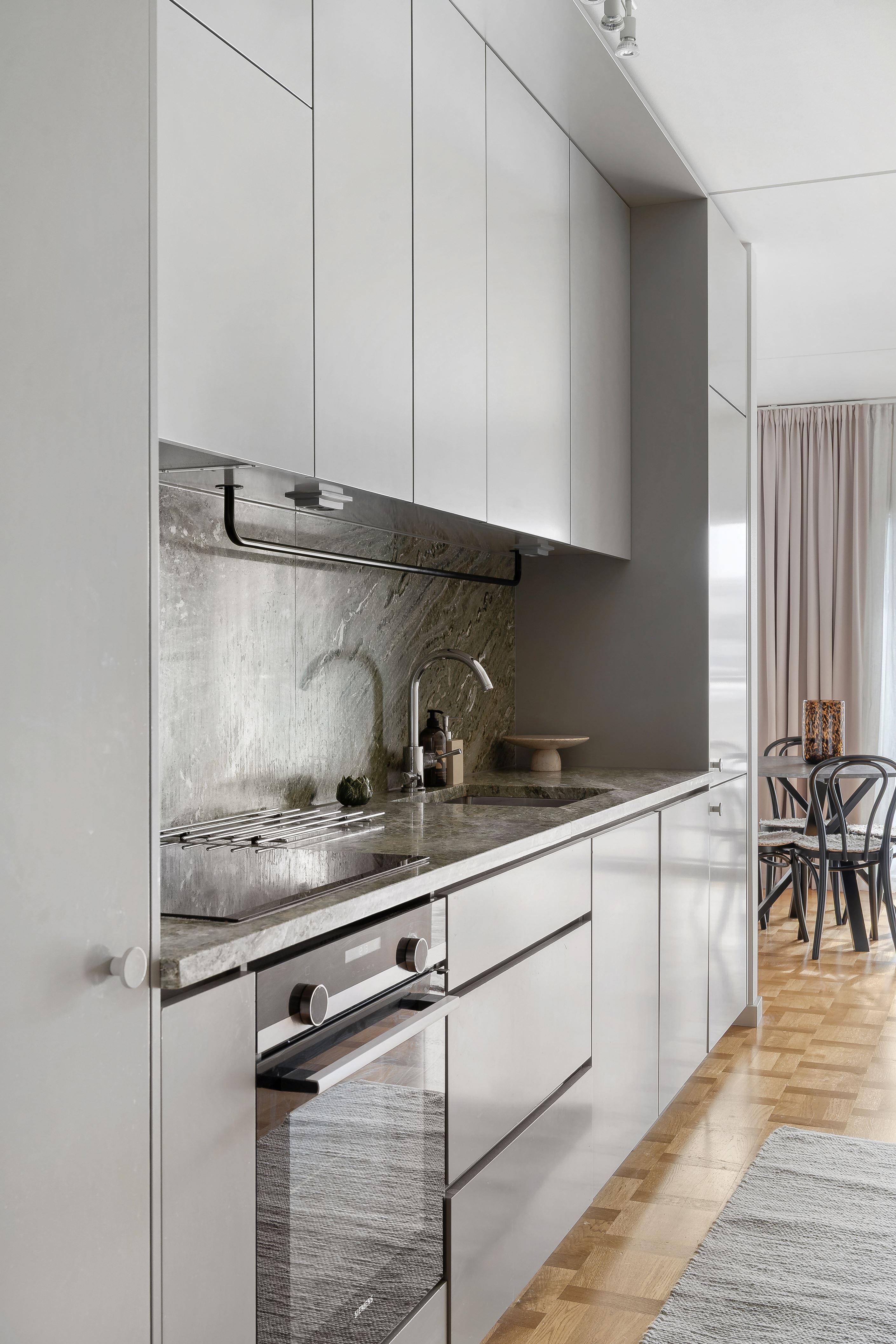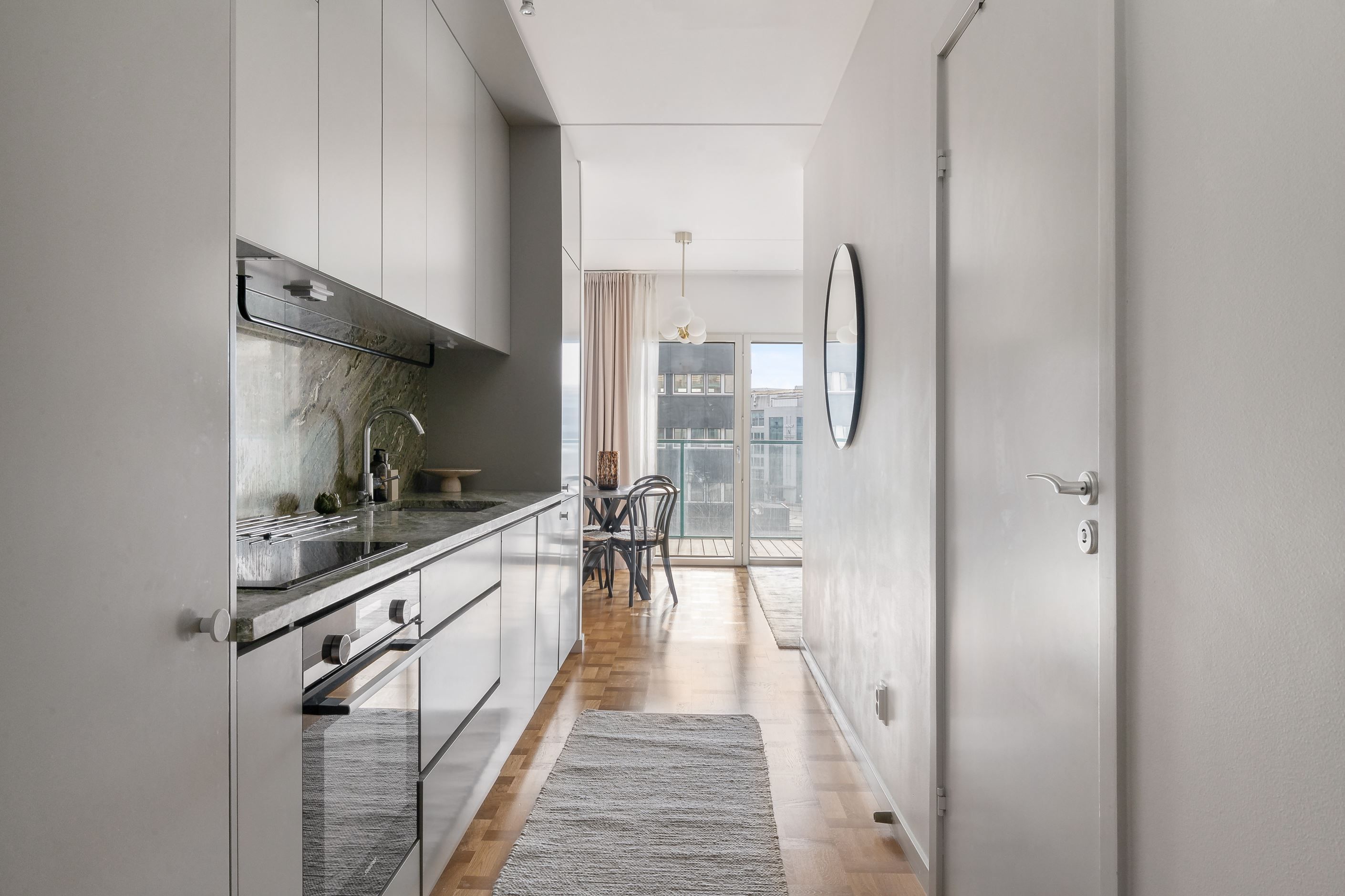 Här möts stilrena materialval och ett härligt ljusinsläpp från stora panoramafönster. Den äkta holländska parketten tillsammans med den gröna carraramarmorn skapar en elegant och tidlös känsla i bostaden. Den generösa takhöjden förstärker rymden och låter ljuset sprida sig fint genom hela lägenheten.