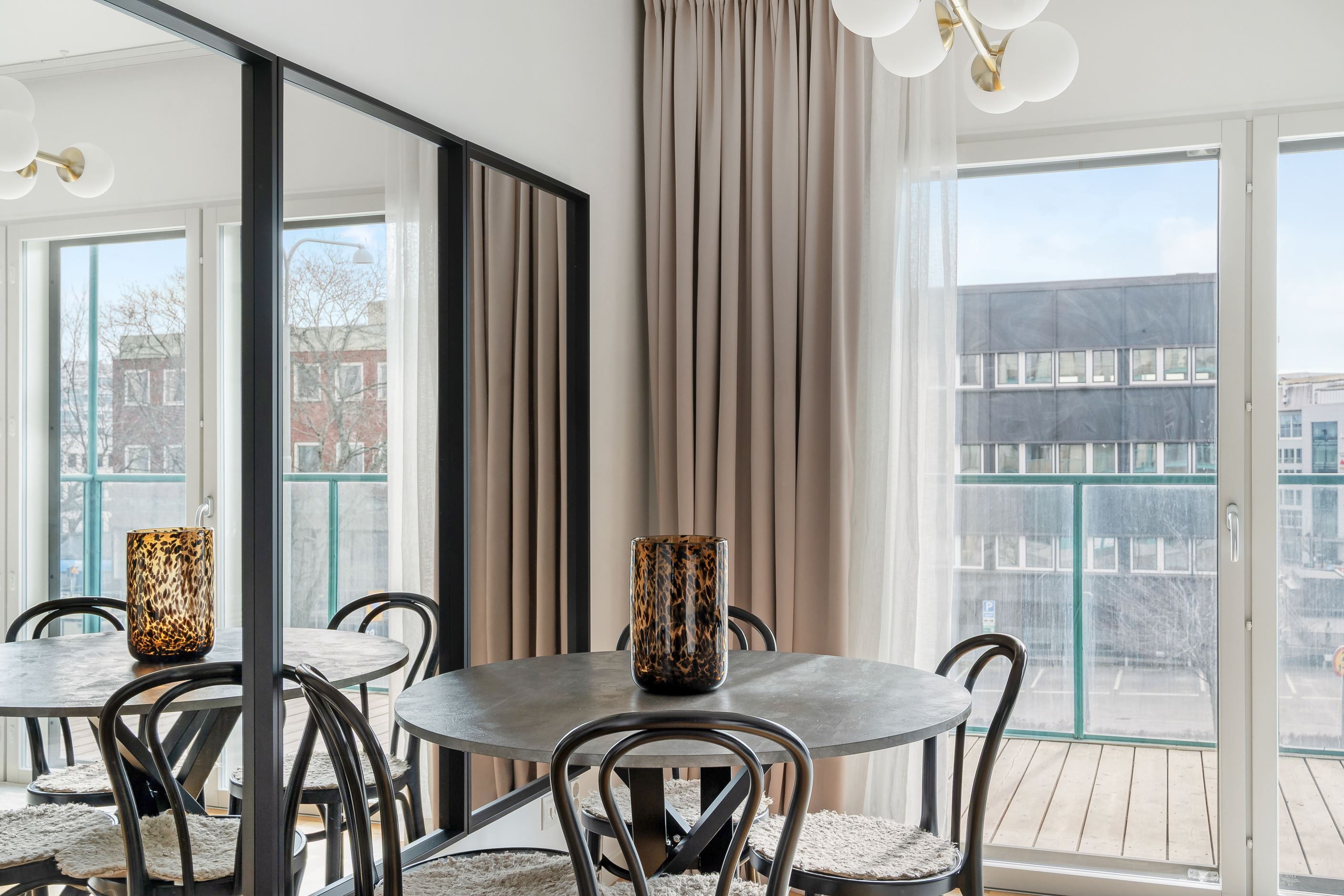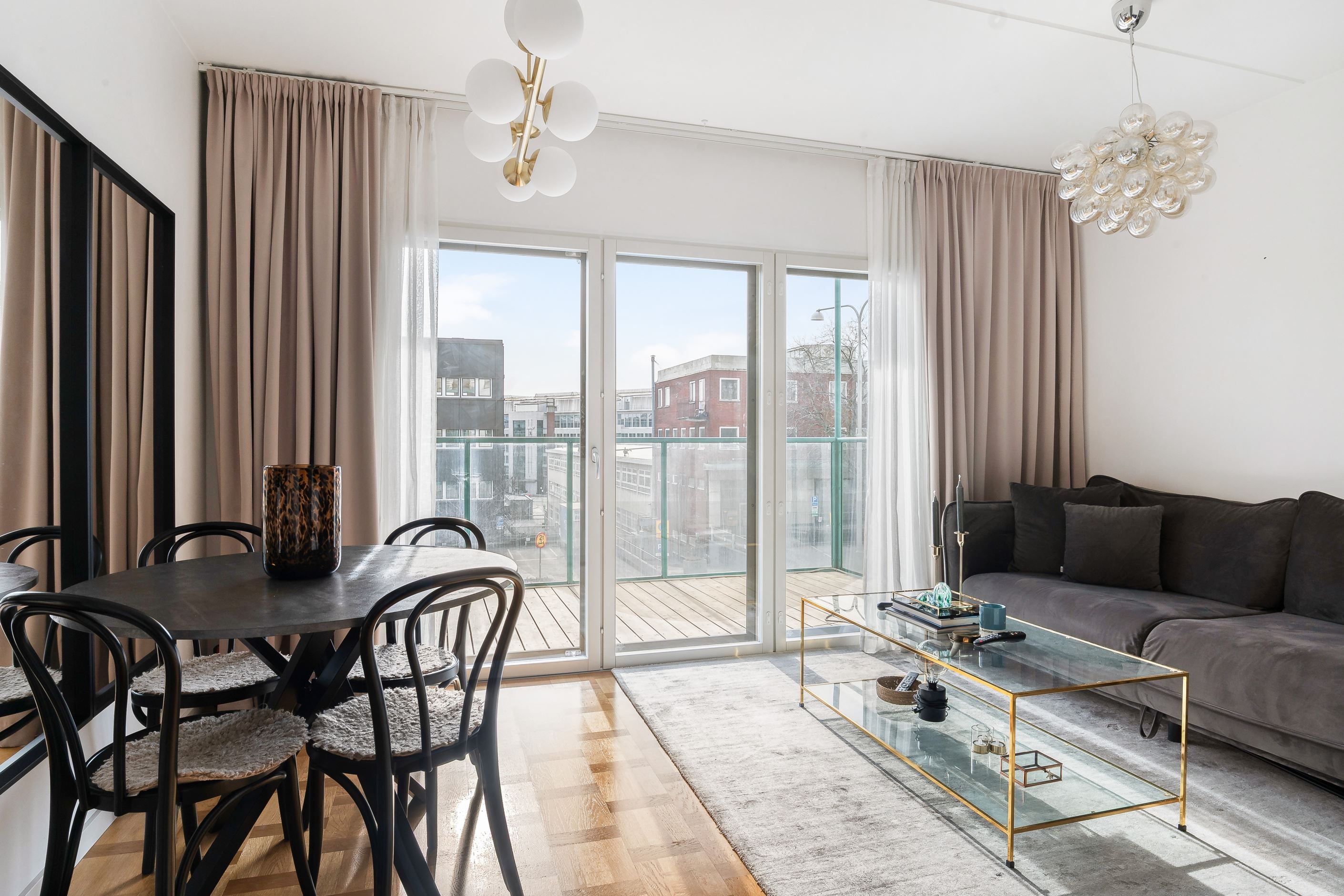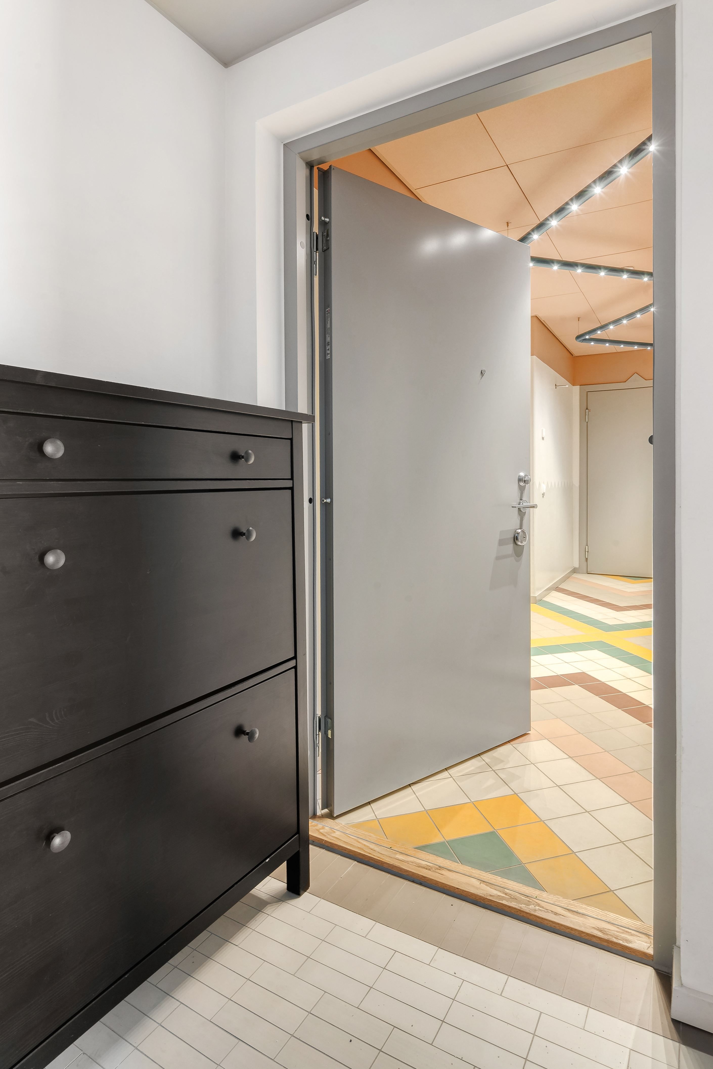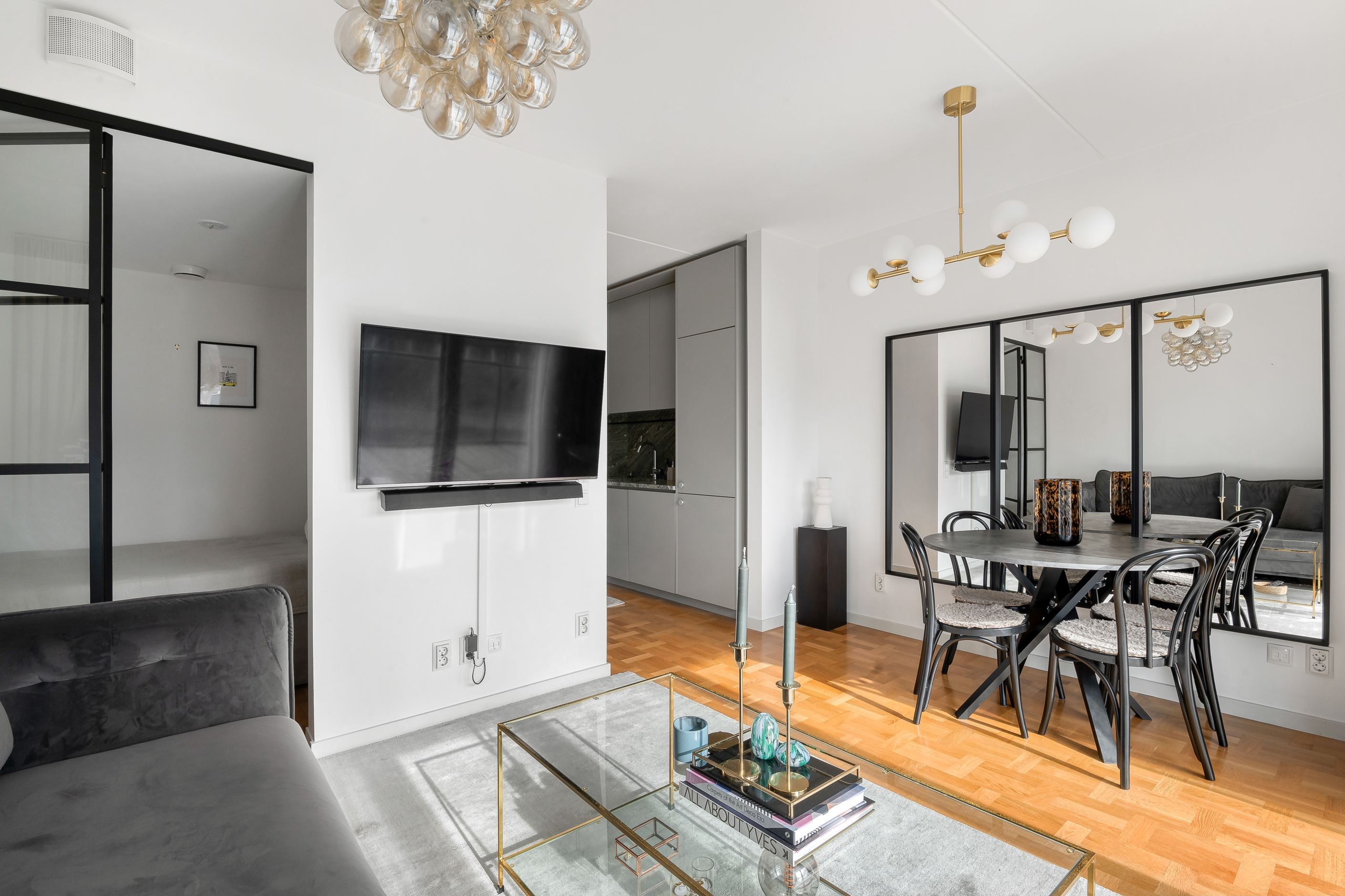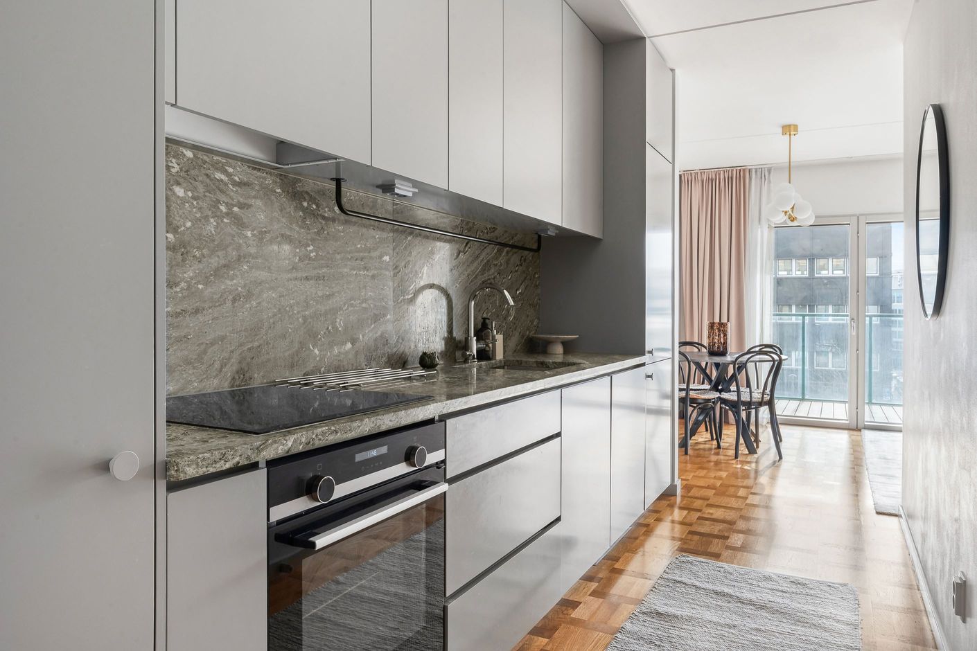Här möts stilrena materialval och ett härligt ljusinsläpp från stora panoramafönster. Den äkta holländska parketten tillsammans med den gröna carraramarmorn skapar en elegant och tidlös känsla i bostaden. Den generösa takhöjden förstärker rymden och låter ljuset sprida sig fint genom hela lägenheten.