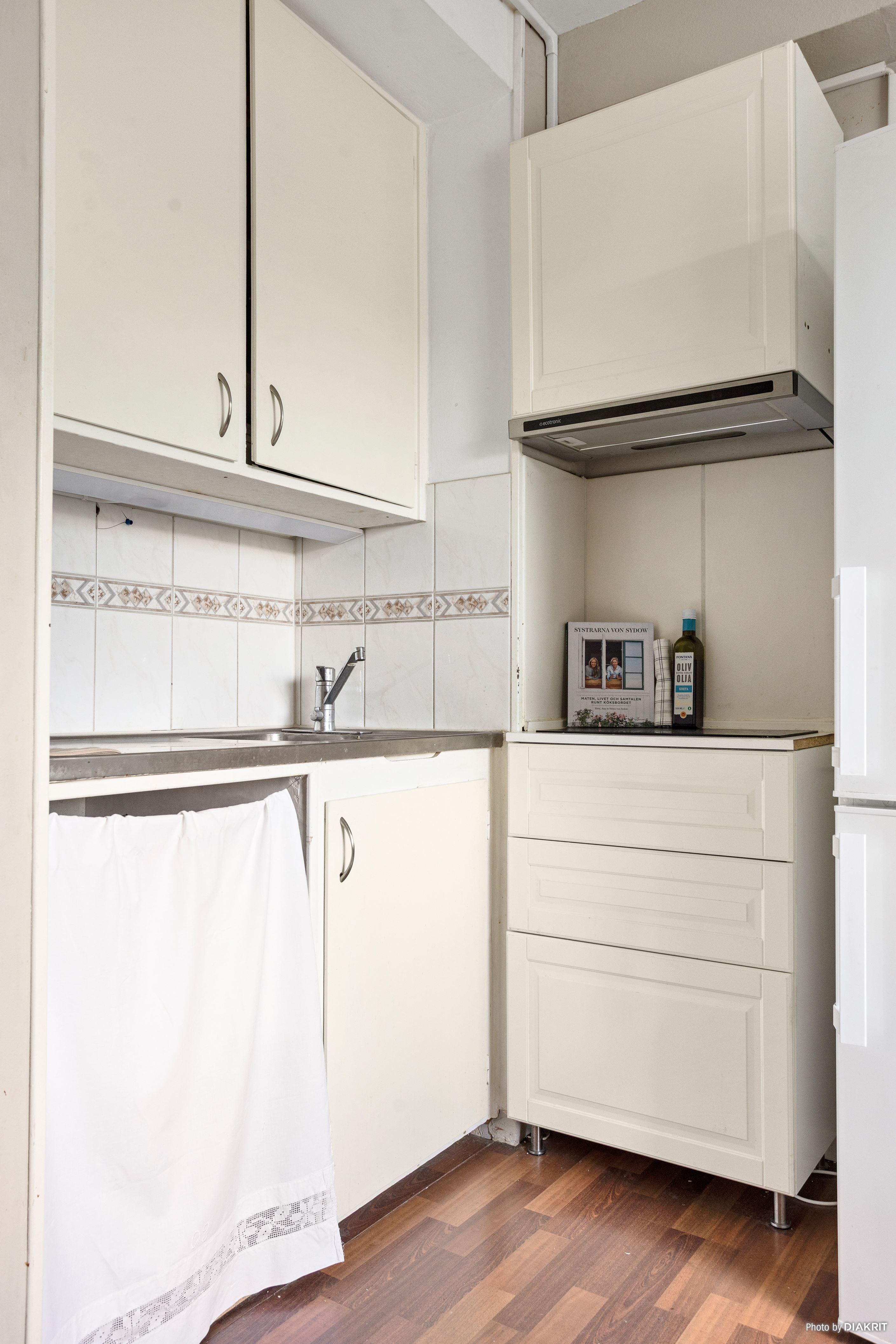 Lägenheten har ett ljust och lättmöblerat rum med plats för både säng, soffa och matplats. Den praktiska kokvrån är utrustad med induktionshäll (2 plattor), kyl/frys och diskho – en kompakt men välfungerande lösning för vardagens matlagning.