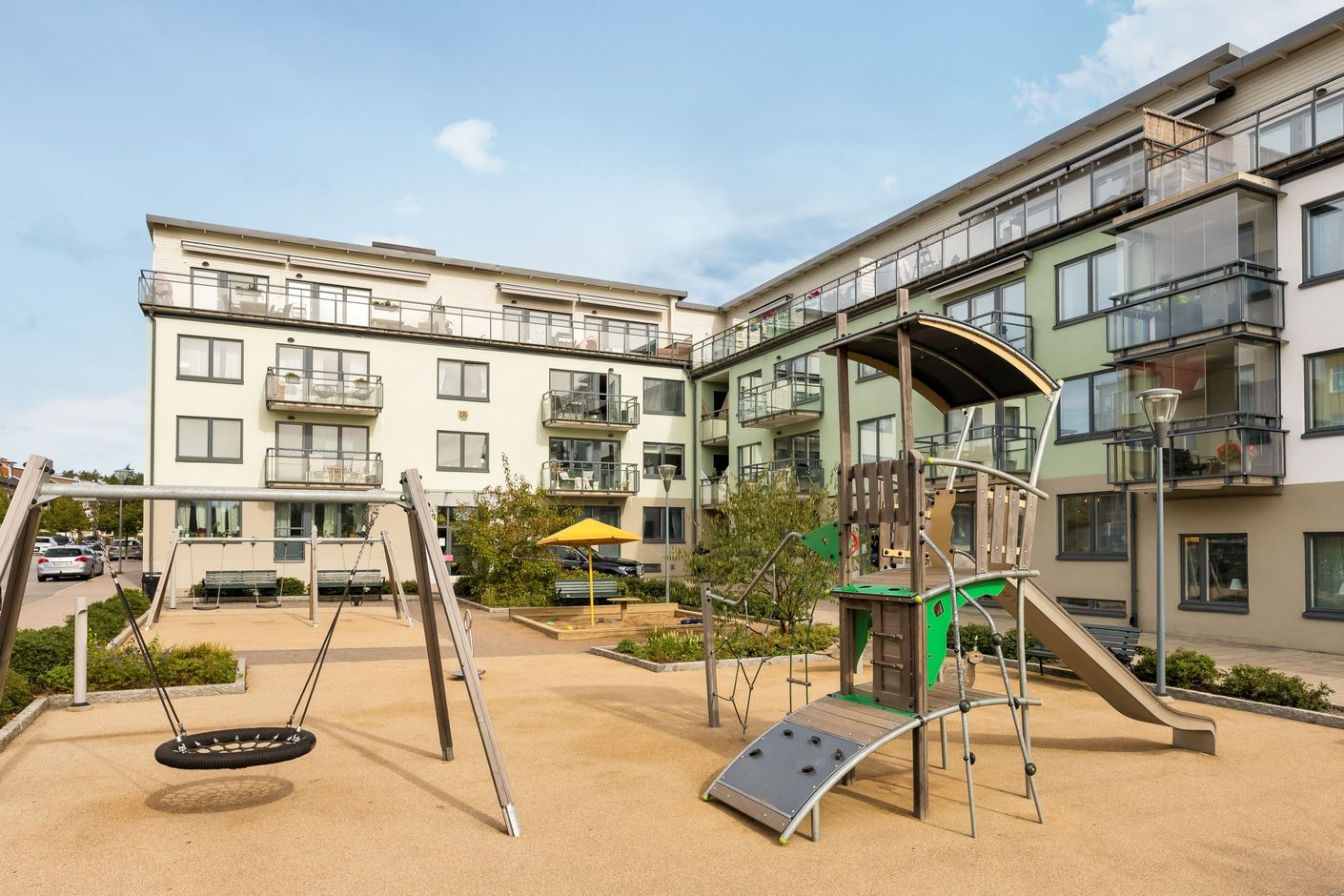 -Stor balkong med trevlig utsikt mot lugn innergård och villaområde
