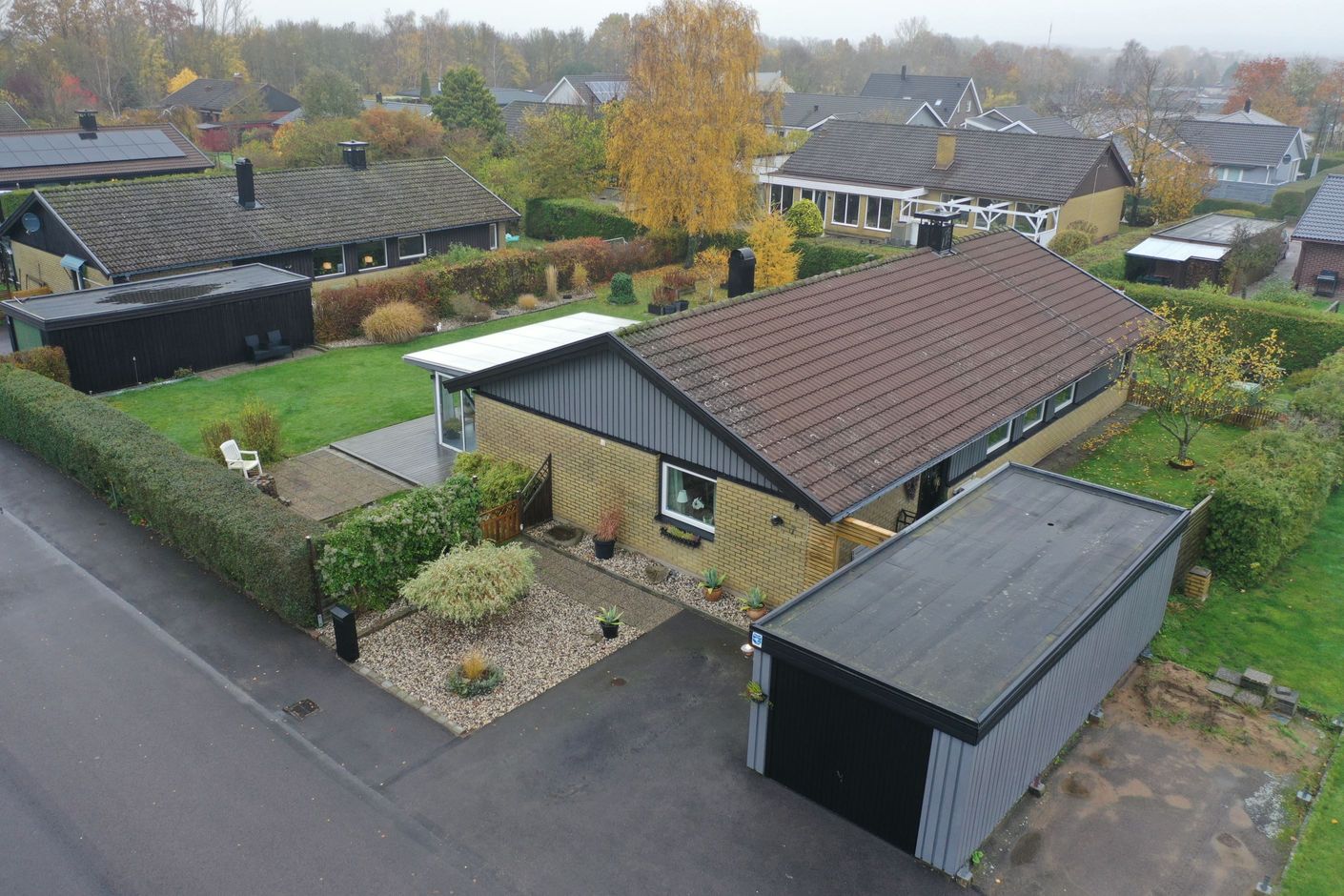 Lättskött trädgård med mycket stenlagt.