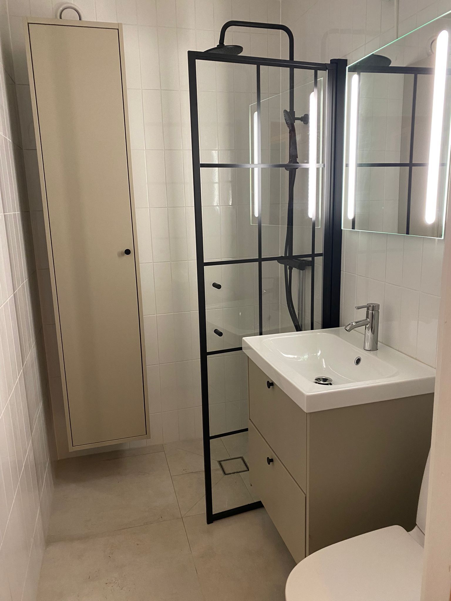Här välkomnas ni till en hall med avhägningsmöjligheter, till höger finns bostadens badrum med dusch, WC och tvättställ. Vidare till vänster finner vi en klädkammare med goda förvaringsmöjligheter. Rakt fram kliver man in i allrummet som gränsar till matplatsen och bostadens stora inglasade balkong. Fönsterpartier mot grönytor och den inglasade balkongen från både matplatsen och det lilla köket ger bostaden ett fint ljusinsläpp!