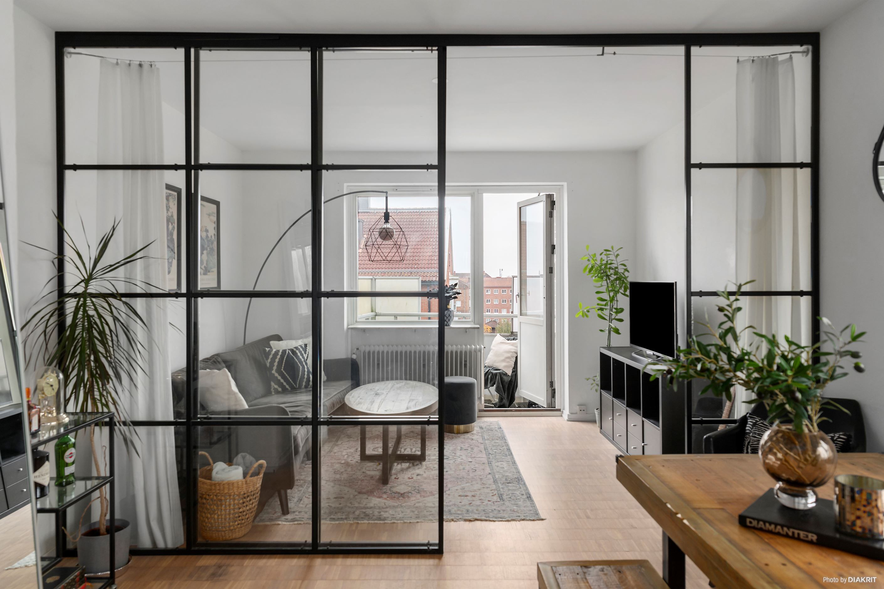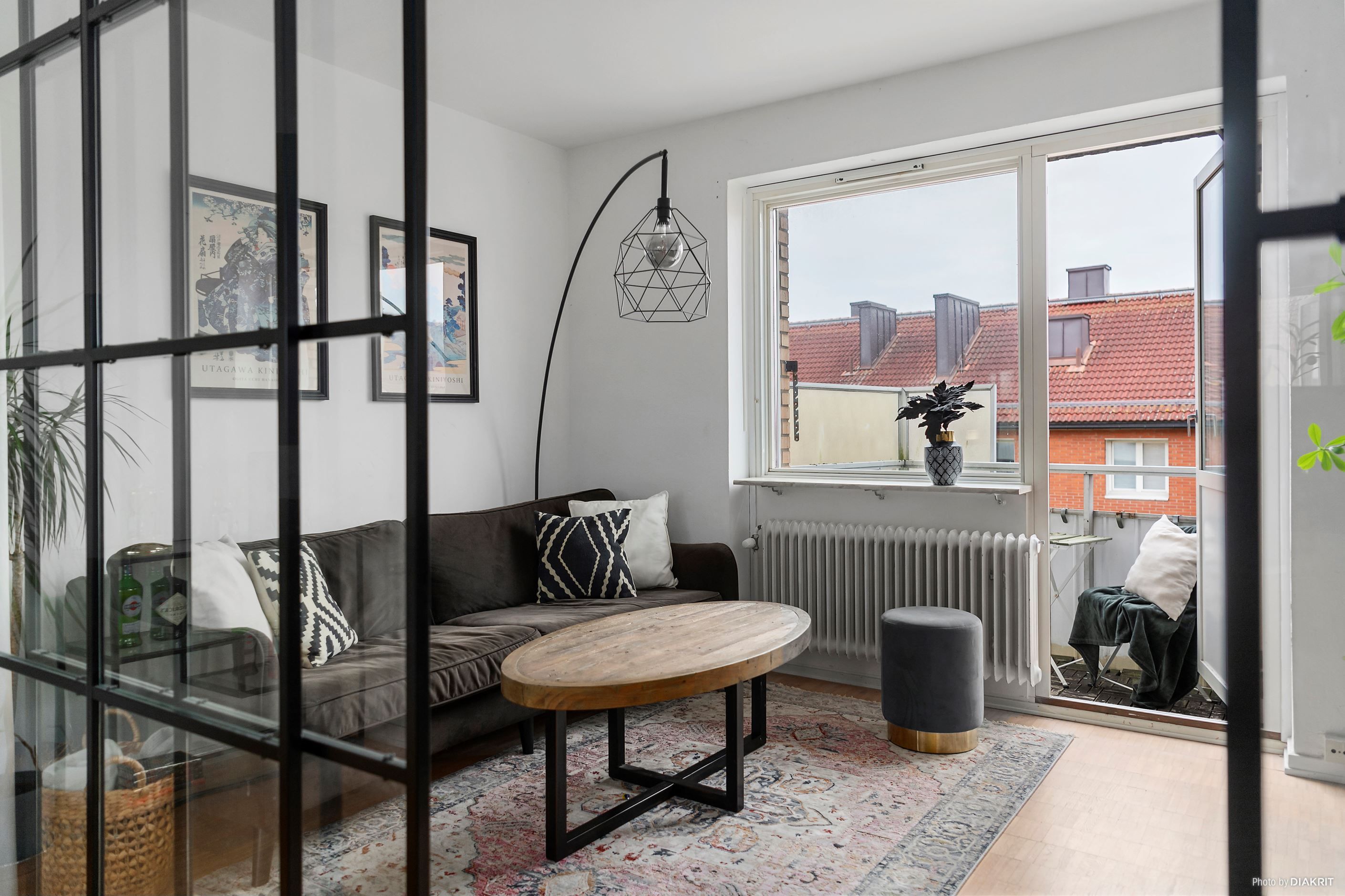 Redan i hallen möts du av en harmonisk känsla som genomsyrar hela hemmet – här samsas stilrena materialval med tidlös design. Det generösa vardagsrummet bjuder på en unik industrivägg med skjutdörrar i glas – en snygg detalj som skapar karaktär och rymd. Den smarta lösningen gör det dessutom möjligt att enkelt avgränsa ett extra sovrum vid behov. Den slipade flerstavsparketten bevarar hemmets charm och smälter sömlöst samman med den moderna inredningen. Från vardagsrummet nås även balkongen i västerläge – en perfekt plats för morgonkaffet eller en lugn stund i kvällssolen!