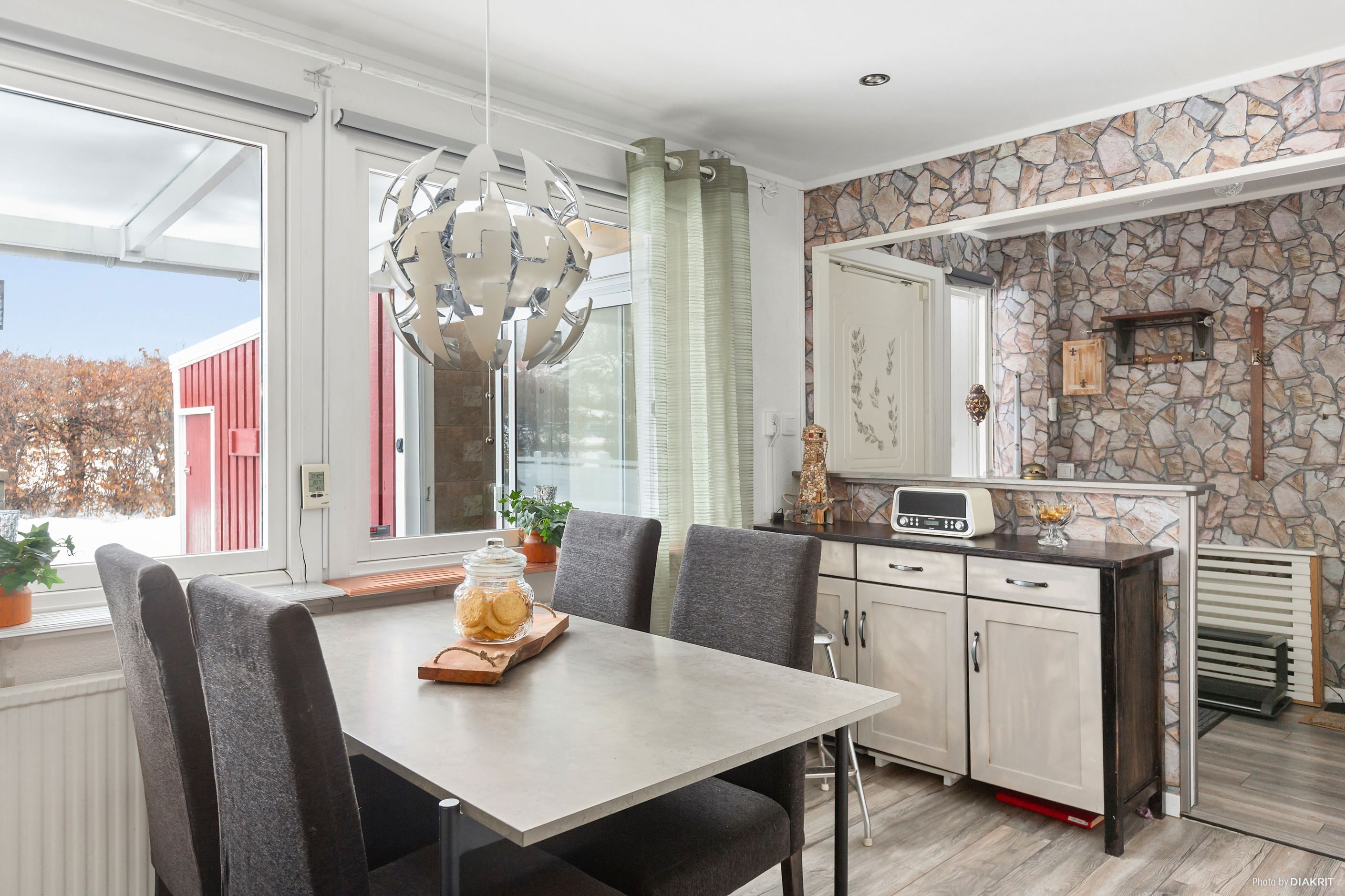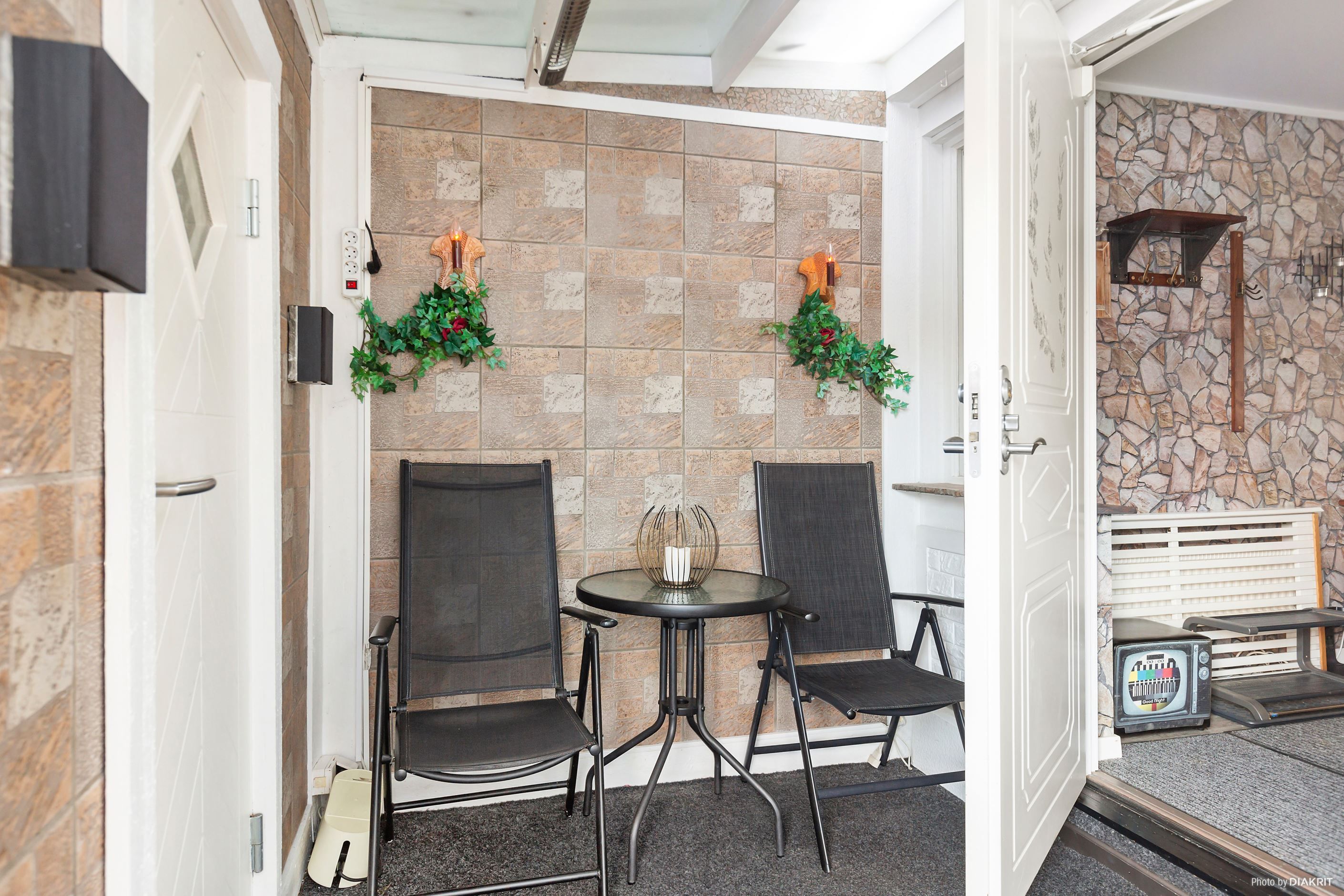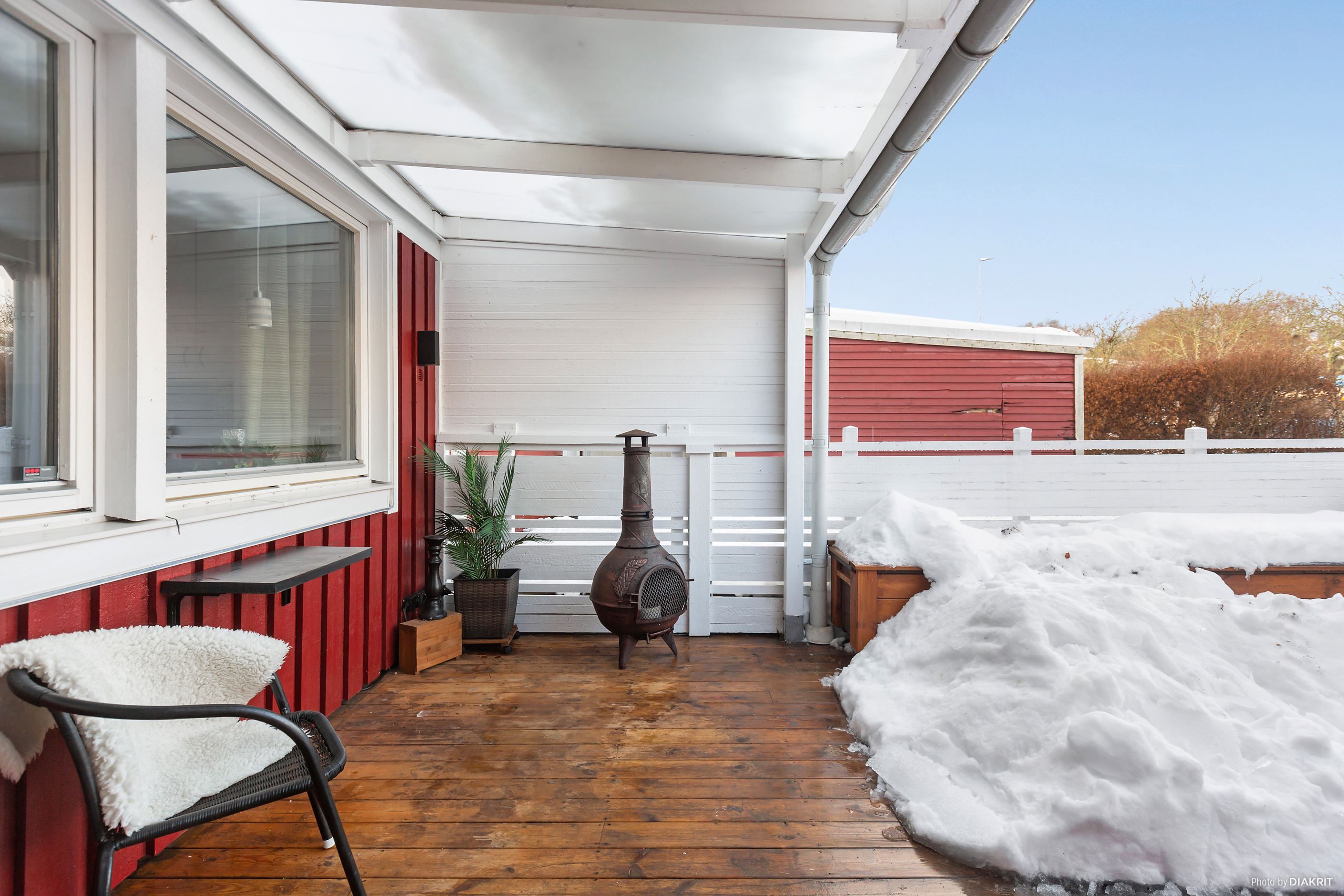 Bostaden präglas av ett härligt ljusinsläpp tack vare den stora inglasningen mot baksidan, som suddar ut gränsen mellan inne och ute och skapar en ljus och inbjudande atmosfär året runt. Härifrån nås den fina trädgården – en grön och trivsam plats som passar lika bra för avkoppling som för umgänge, odling eller lek. Även på framsidan vid entrén finns en inglasning.