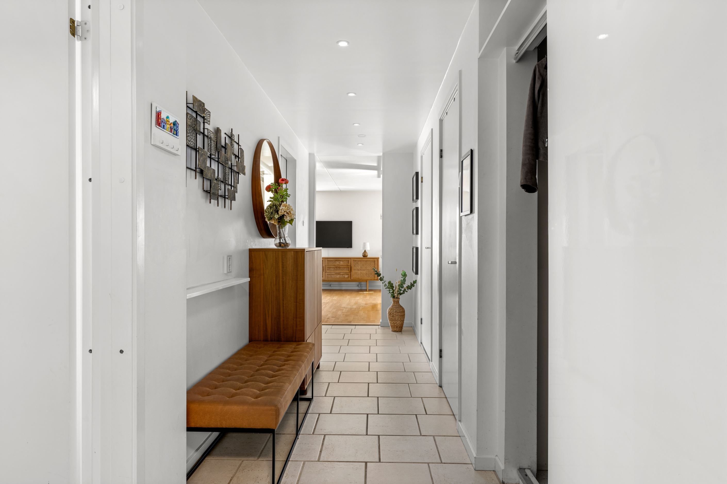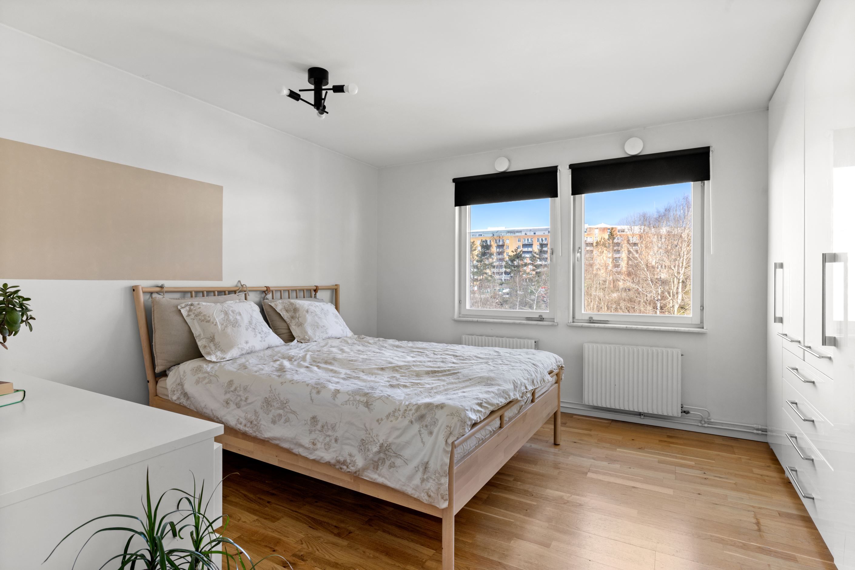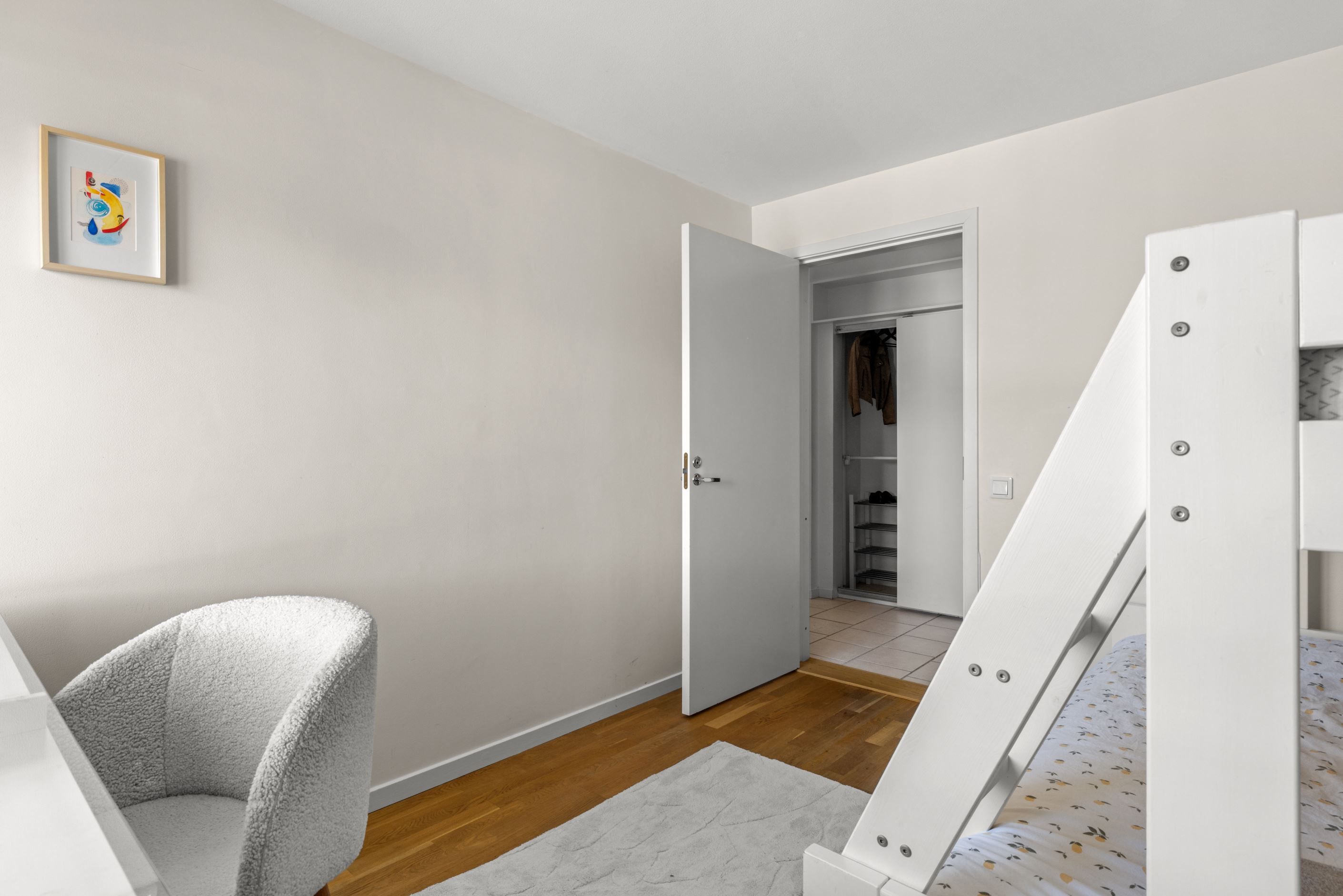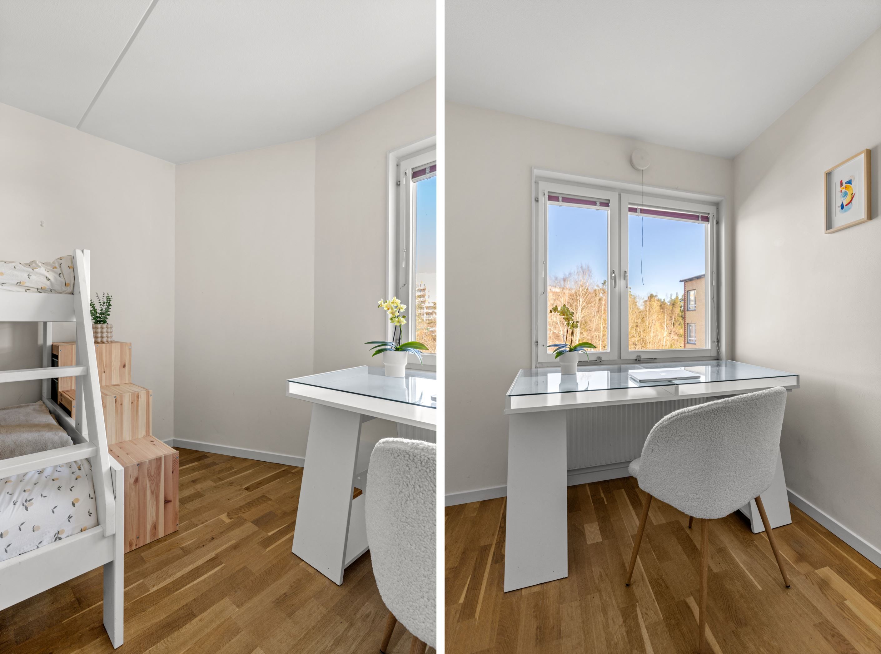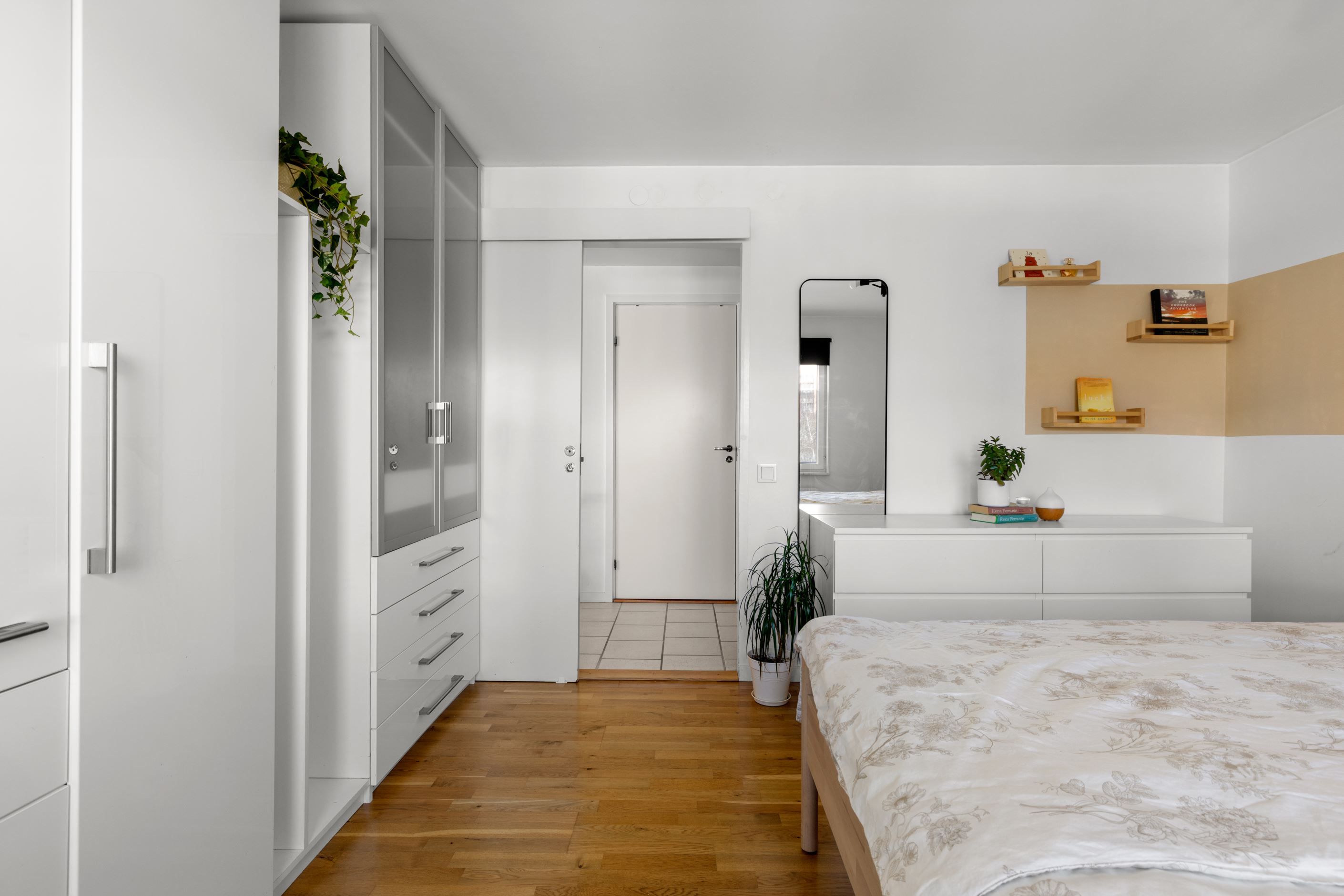 Bostaden erbjuder idag två rymliga sovrum med parkettgolv, men för dig som behöver mer finns möjlighet att skapa ett tredje. Genomgående parkettgolv ger en enhetlig och stilren känsla, medan hallen är praktiskt utformad med klinker, god garderobsförvaring och en separat klädkammare.