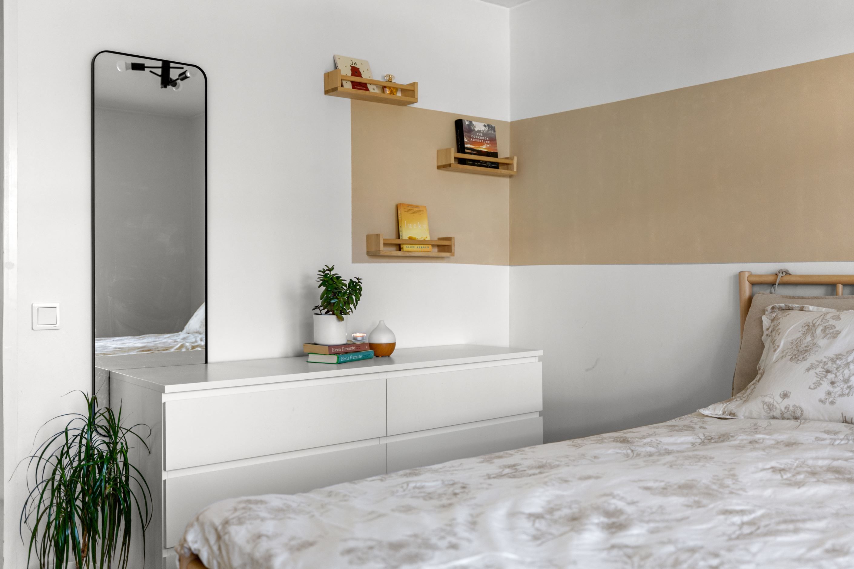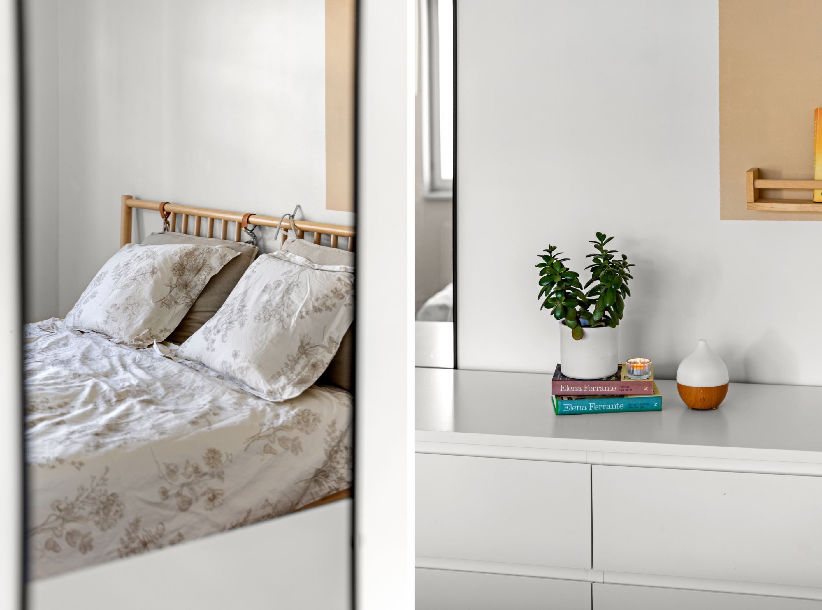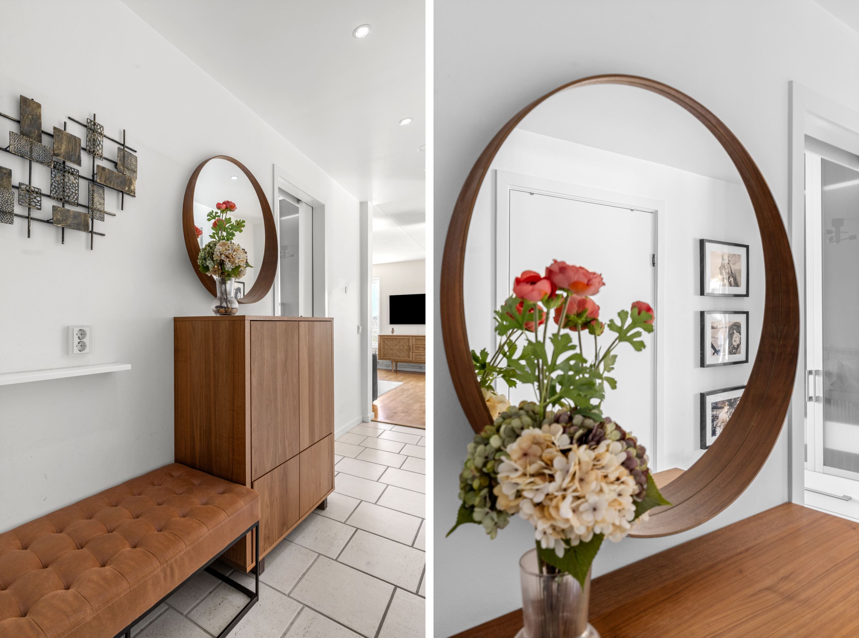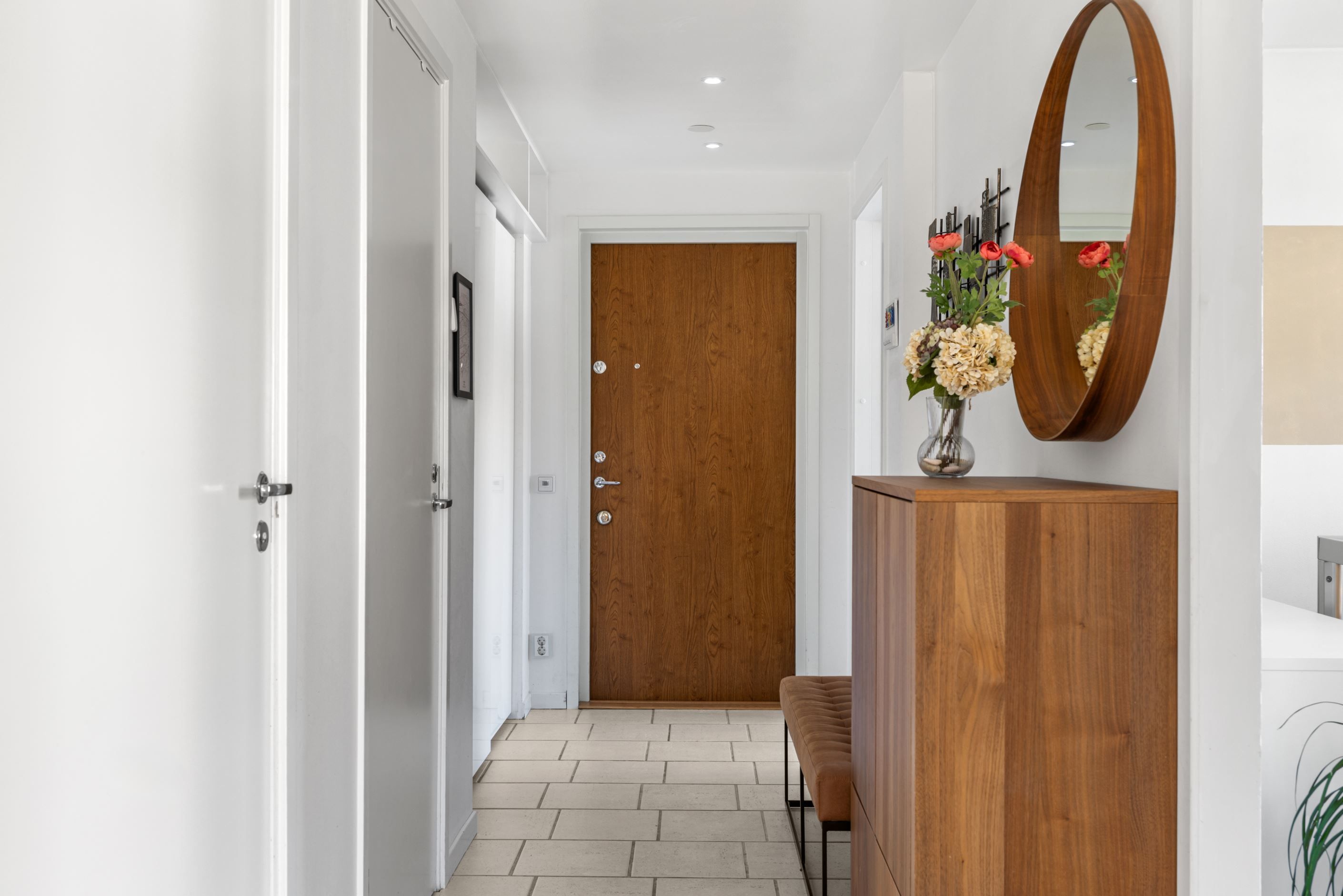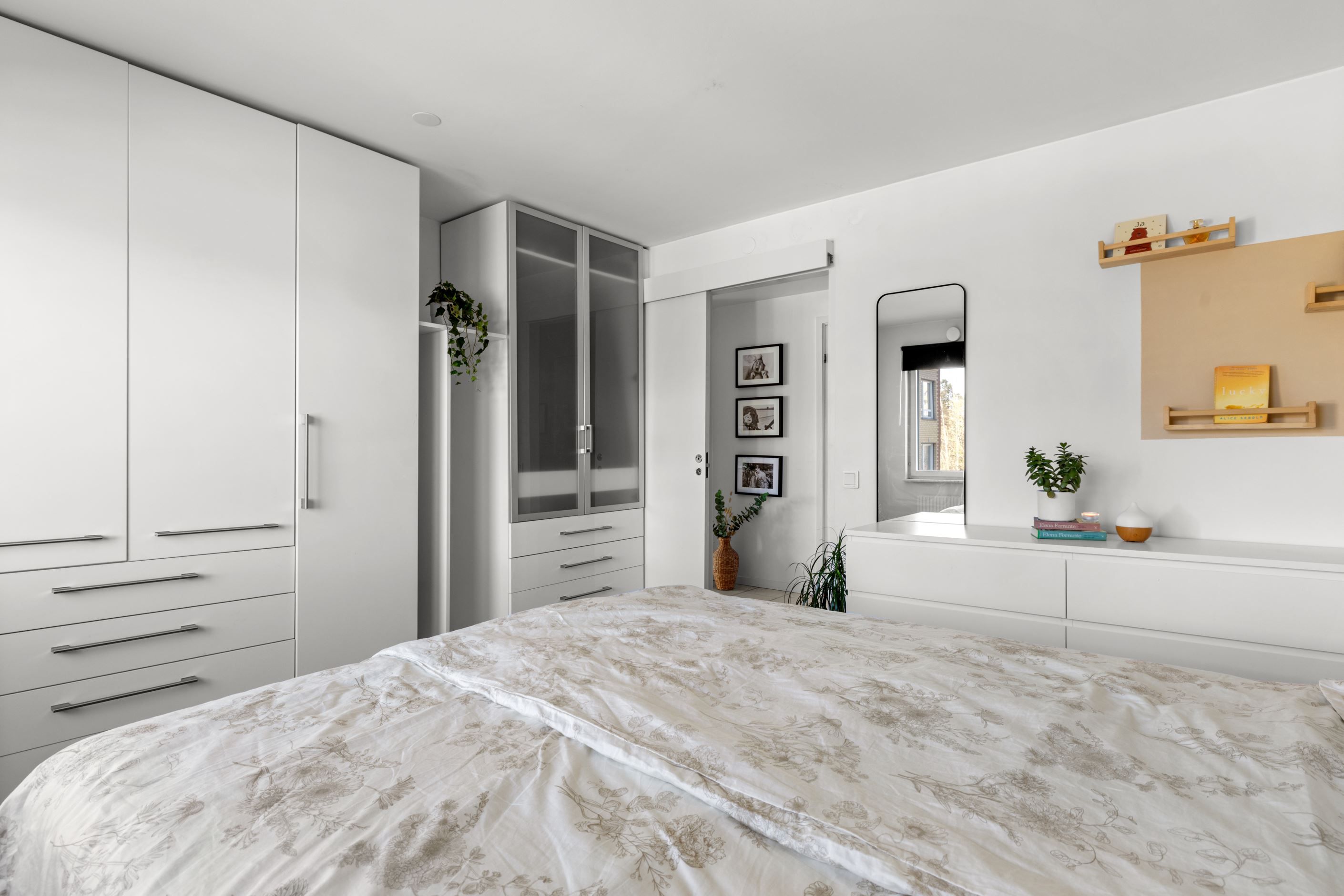Bostaden erbjuder idag två rymliga sovrum med parkettgolv, men för dig som behöver mer finns möjlighet att skapa ett tredje. Genomgående parkettgolv ger en enhetlig och stilren känsla, medan hallen är praktiskt utformad med klinker, god garderobsförvaring och en separat klädkammare.