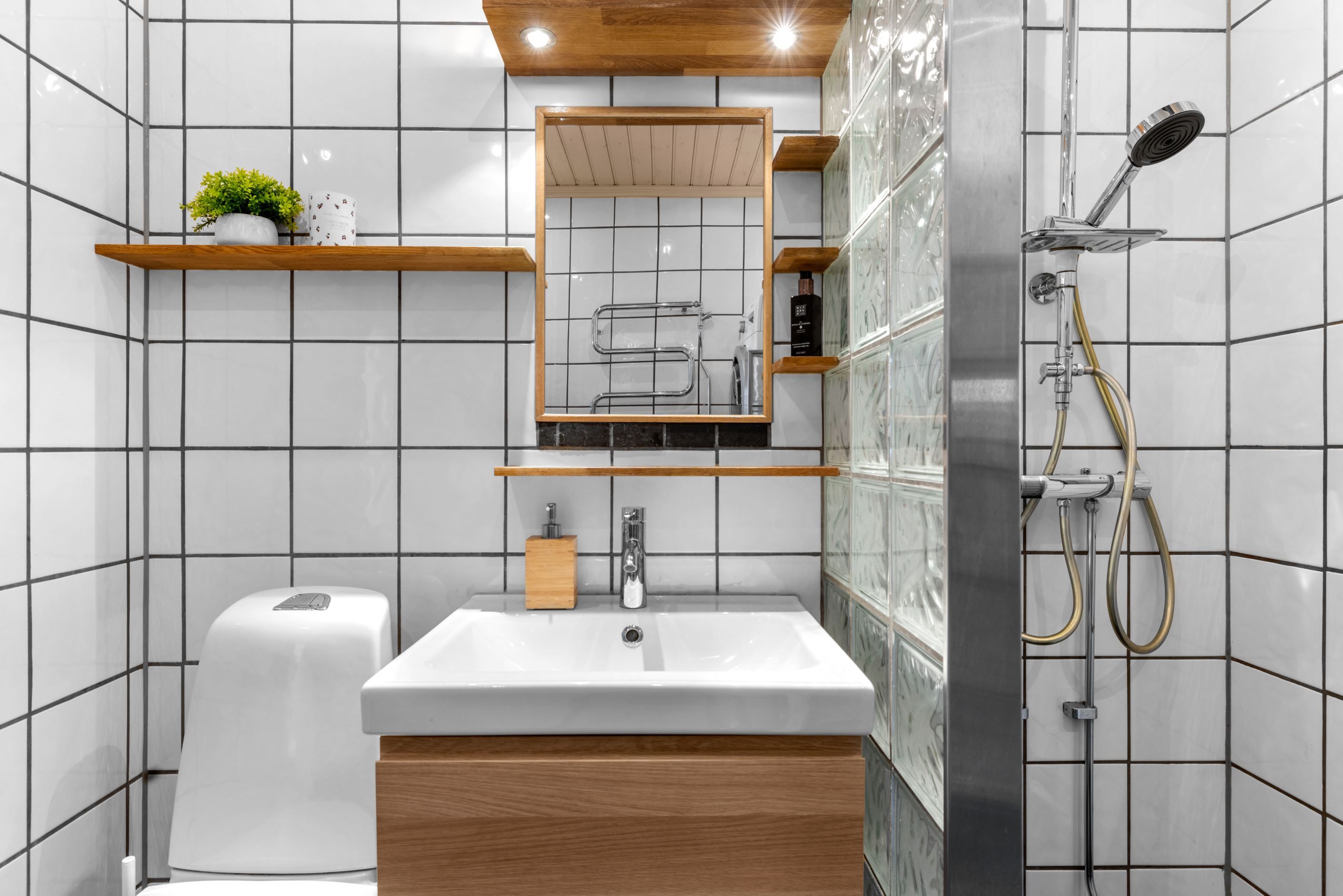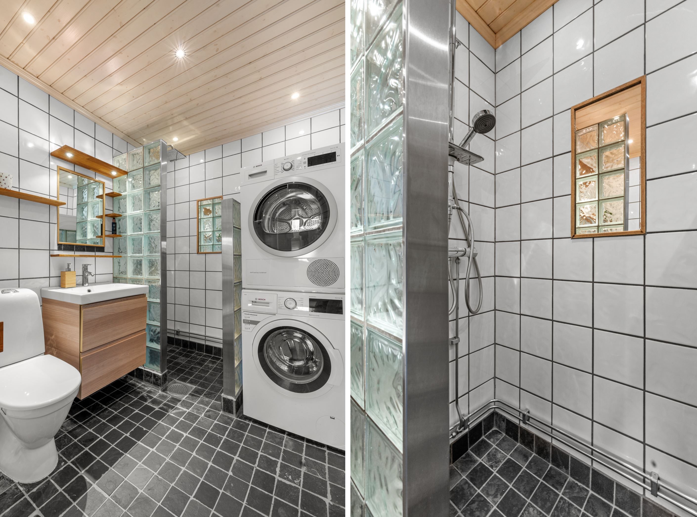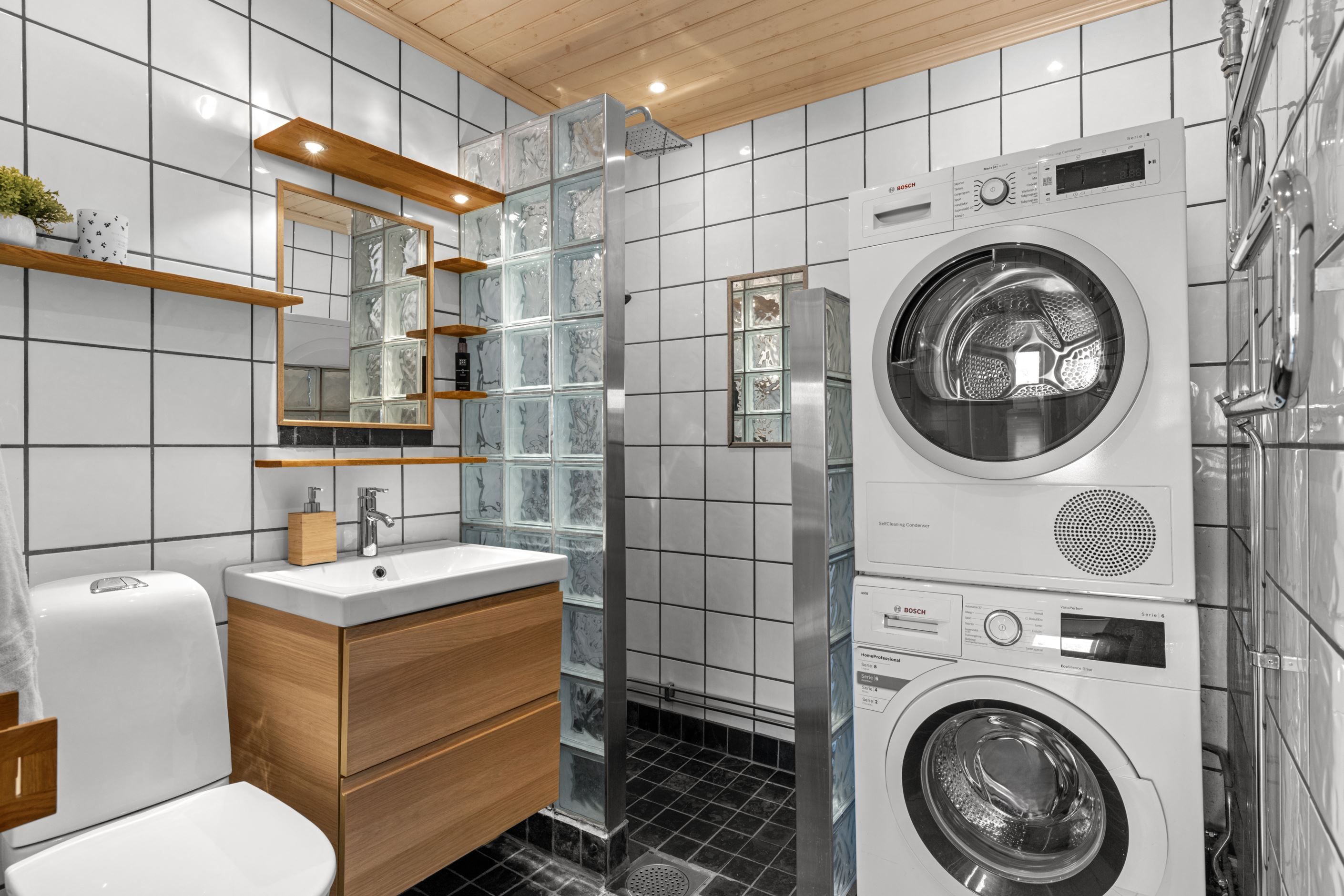 Det helkaklade badrummet är fullt utrustat med tvättmaskin, torktumlare och dusch – bekvämt och funktionellt i vardagen.