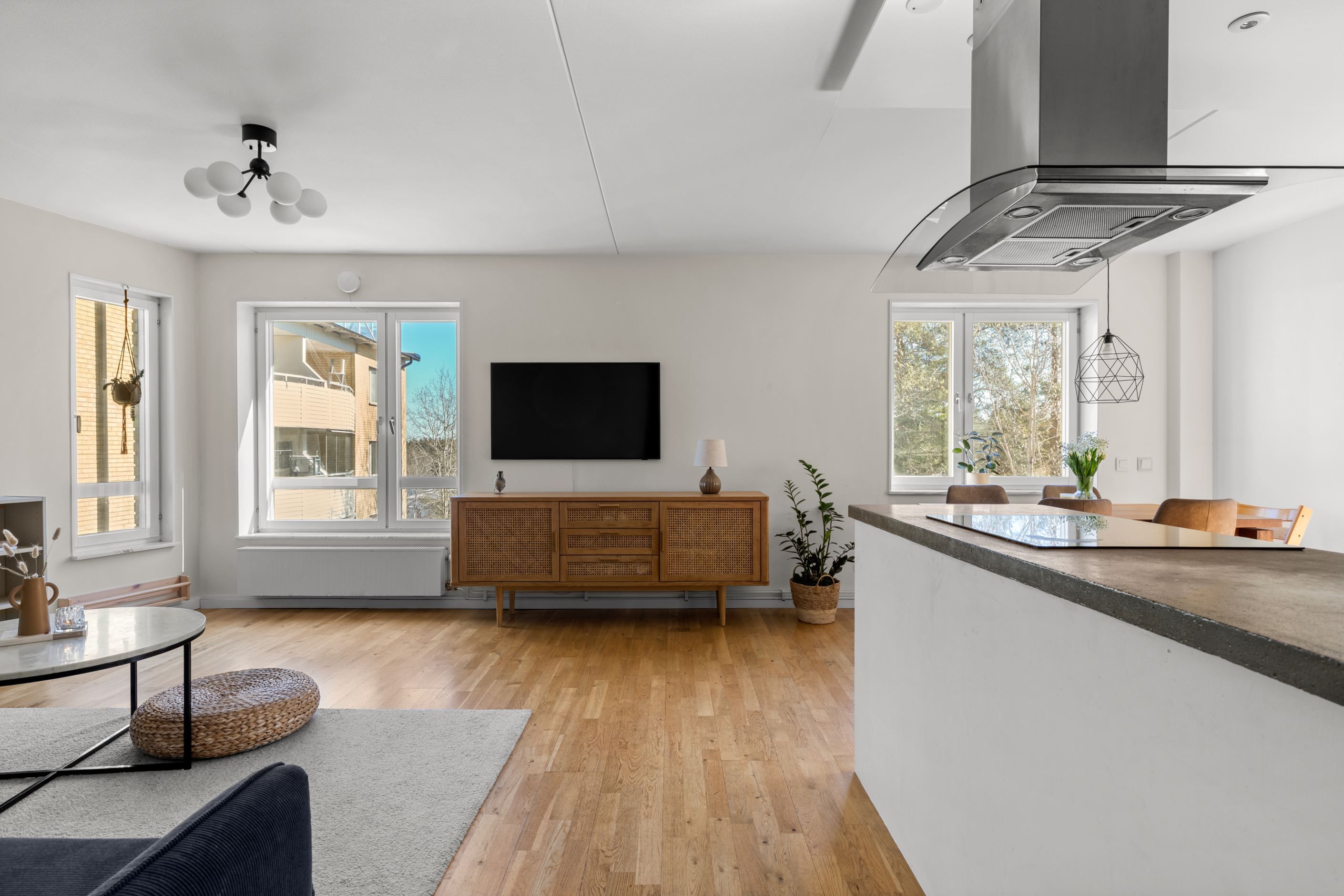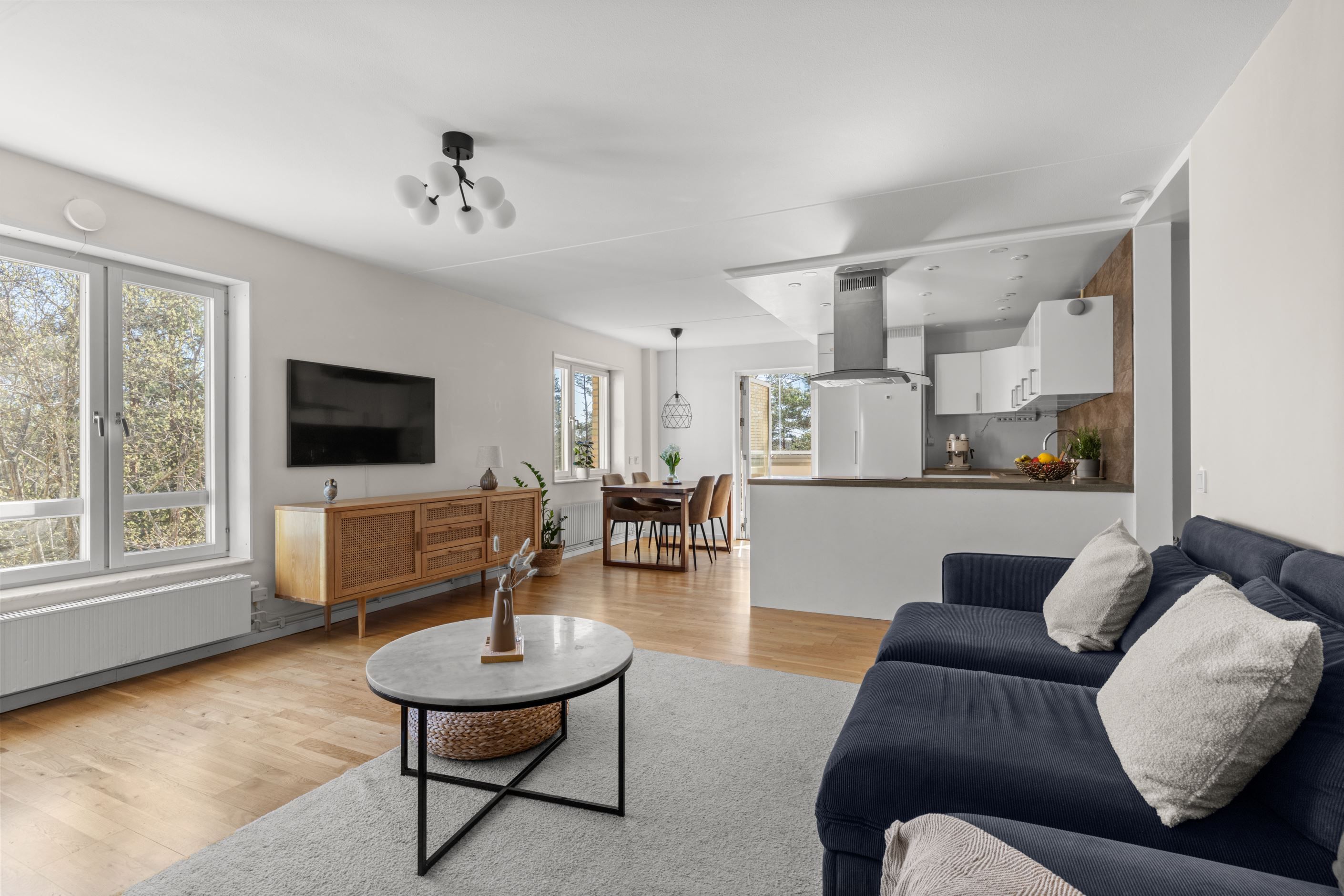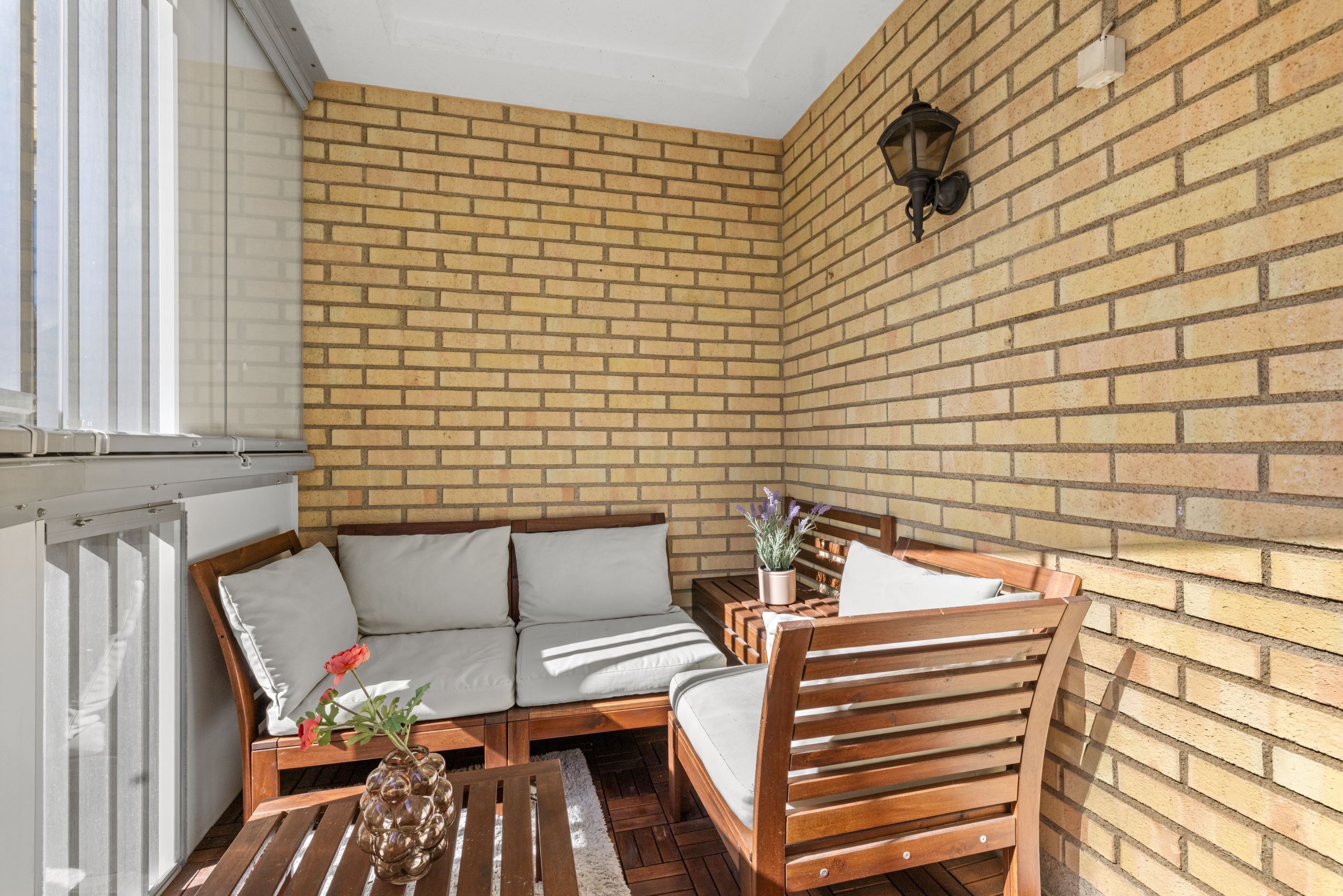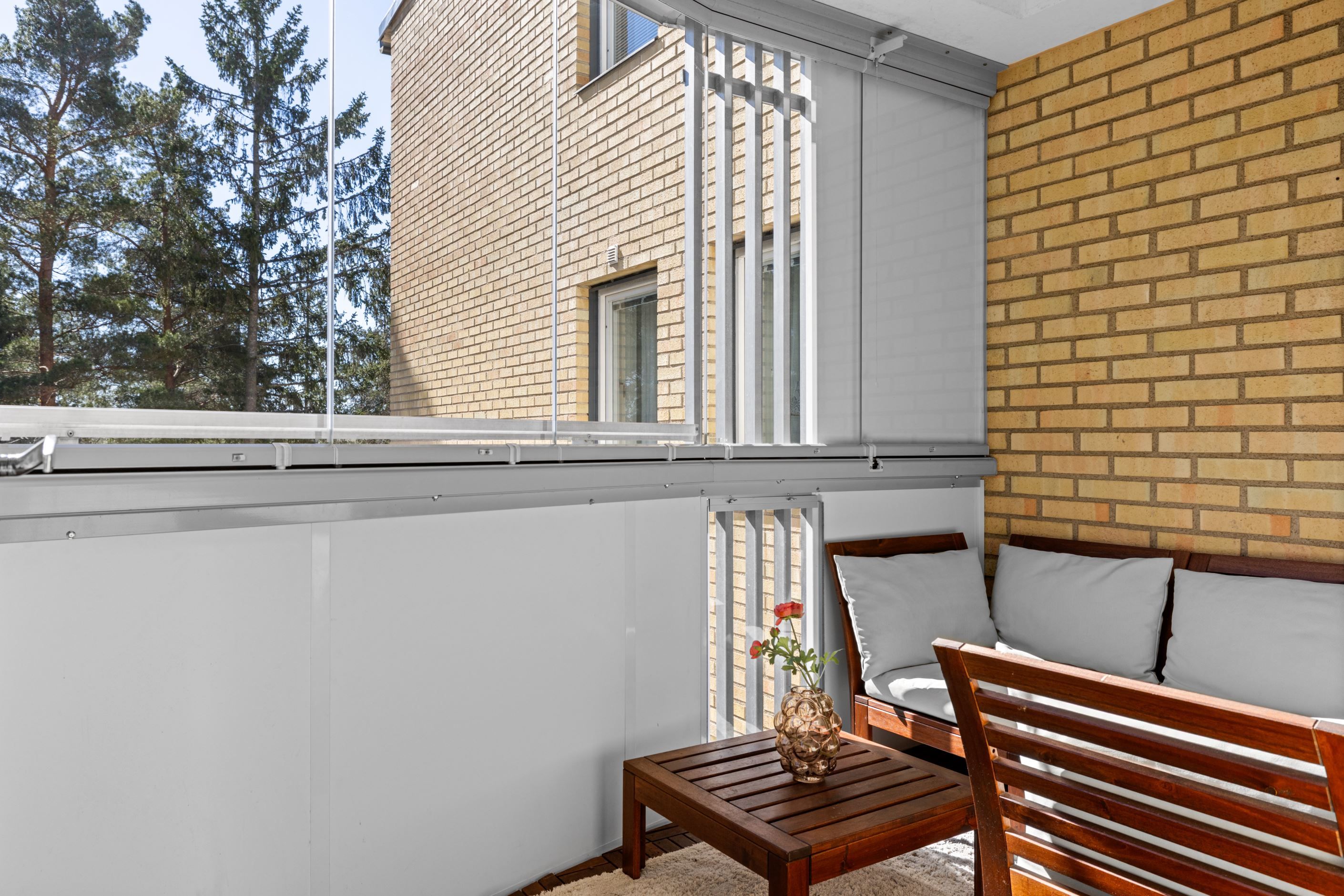 Här bor du i en attraktiv gavellägenhet med generöst ljusinsläpp som verkligen gör skillnad. Planlösningen är öppen och social, där vardagsrum, kök och matplats samspelar naturligt och skapar en härlig rymd. Från sällskapsytorna nås den inglasade balkongen i soligt läge med morgonsol och sol mitt på dagen – en perfekt plats för lugna frukostar och långa dagar.