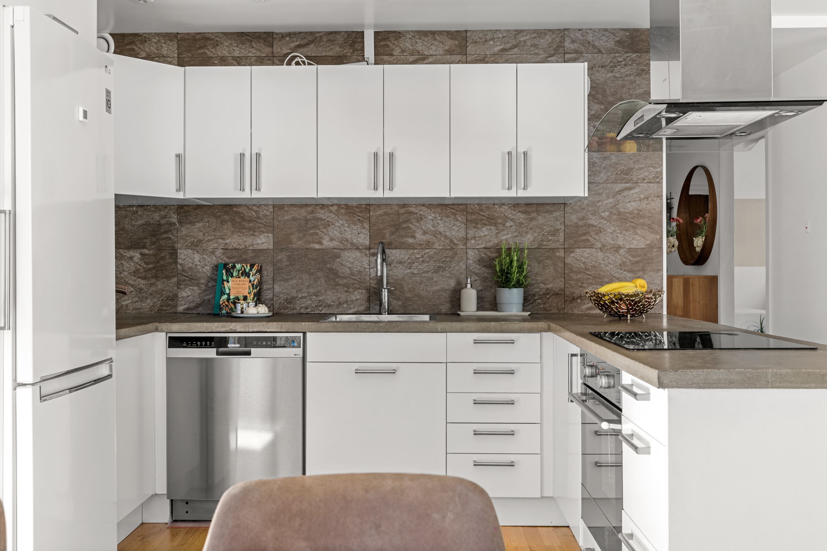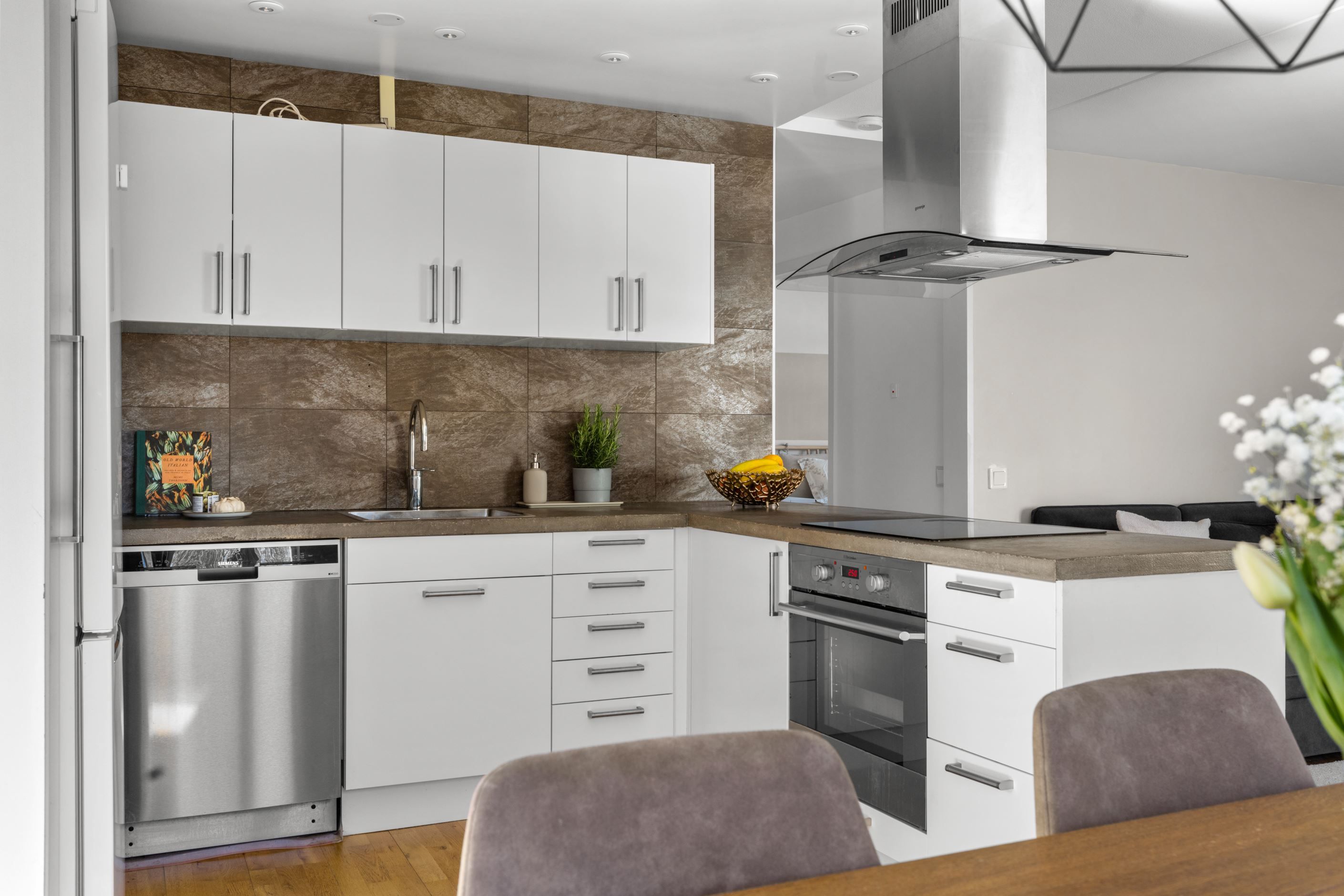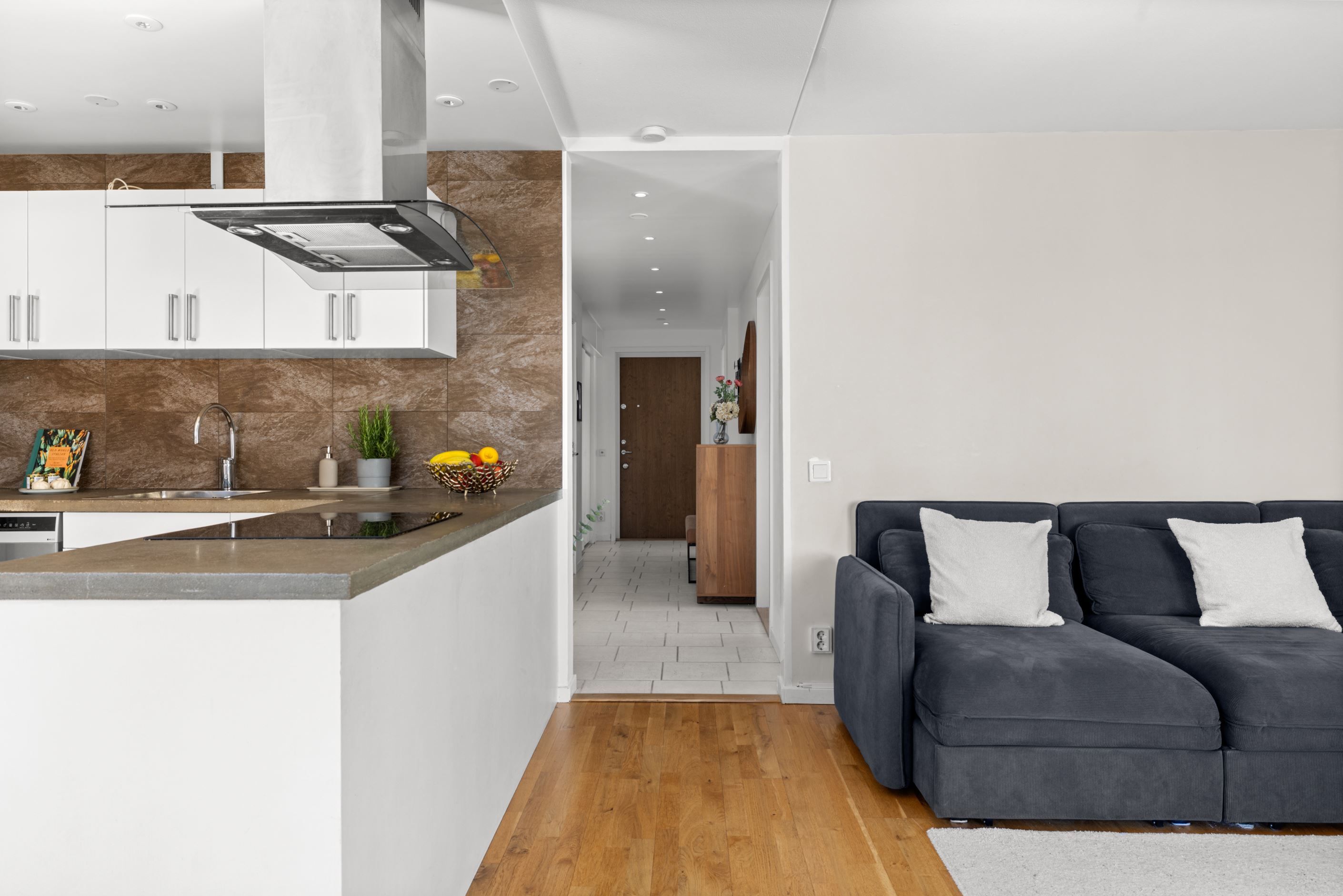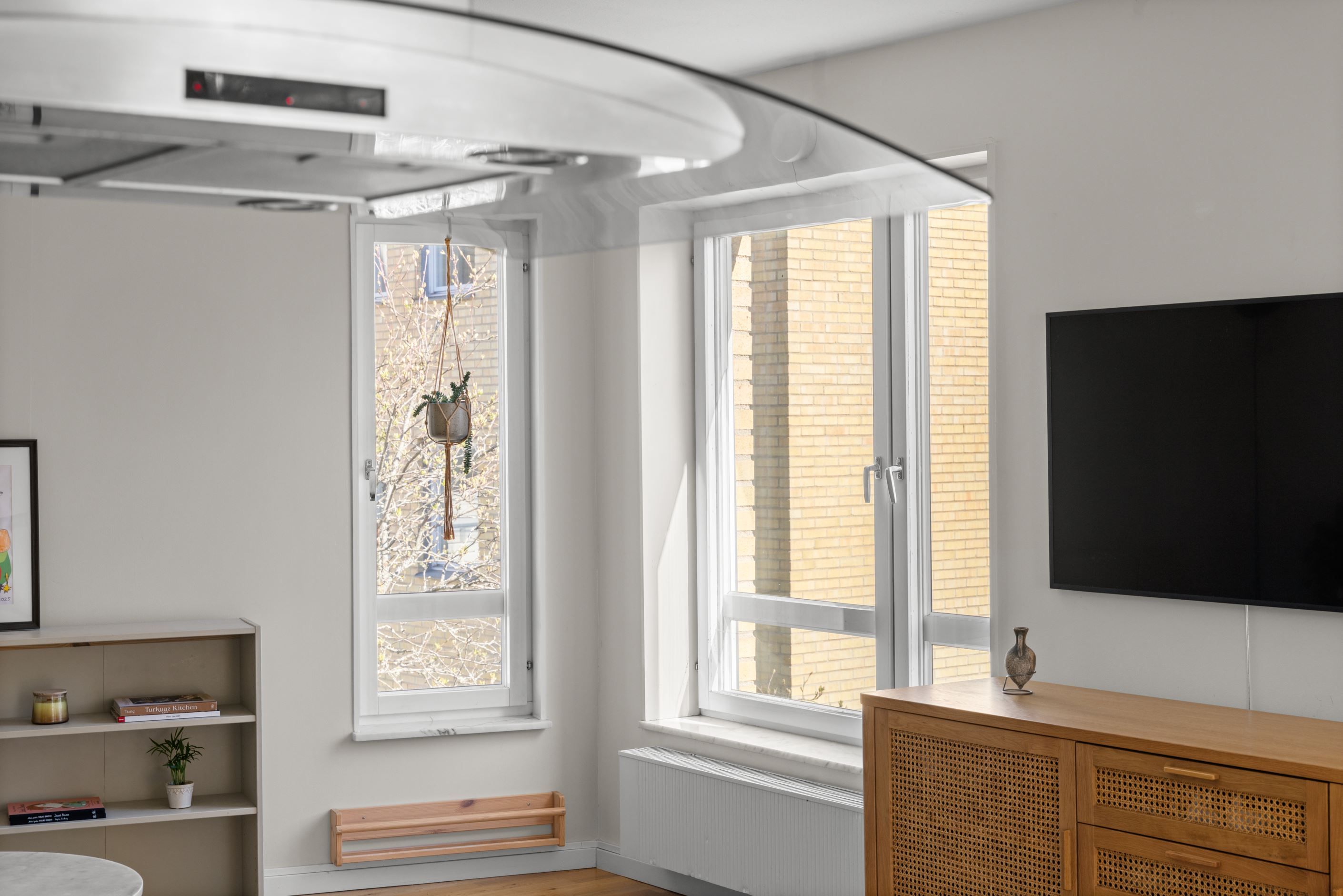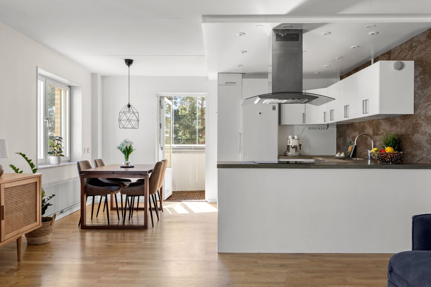 Här bor du i en attraktiv gavellägenhet med generöst ljusinsläpp som verkligen gör skillnad. Planlösningen är öppen och social, där vardagsrum, kök och matplats samspelar naturligt och skapar en härlig rymd. Från sällskapsytorna nås den inglasade balkongen i soligt läge med morgonsol och sol mitt på dagen – en perfekt plats för lugna frukostar och långa dagar.